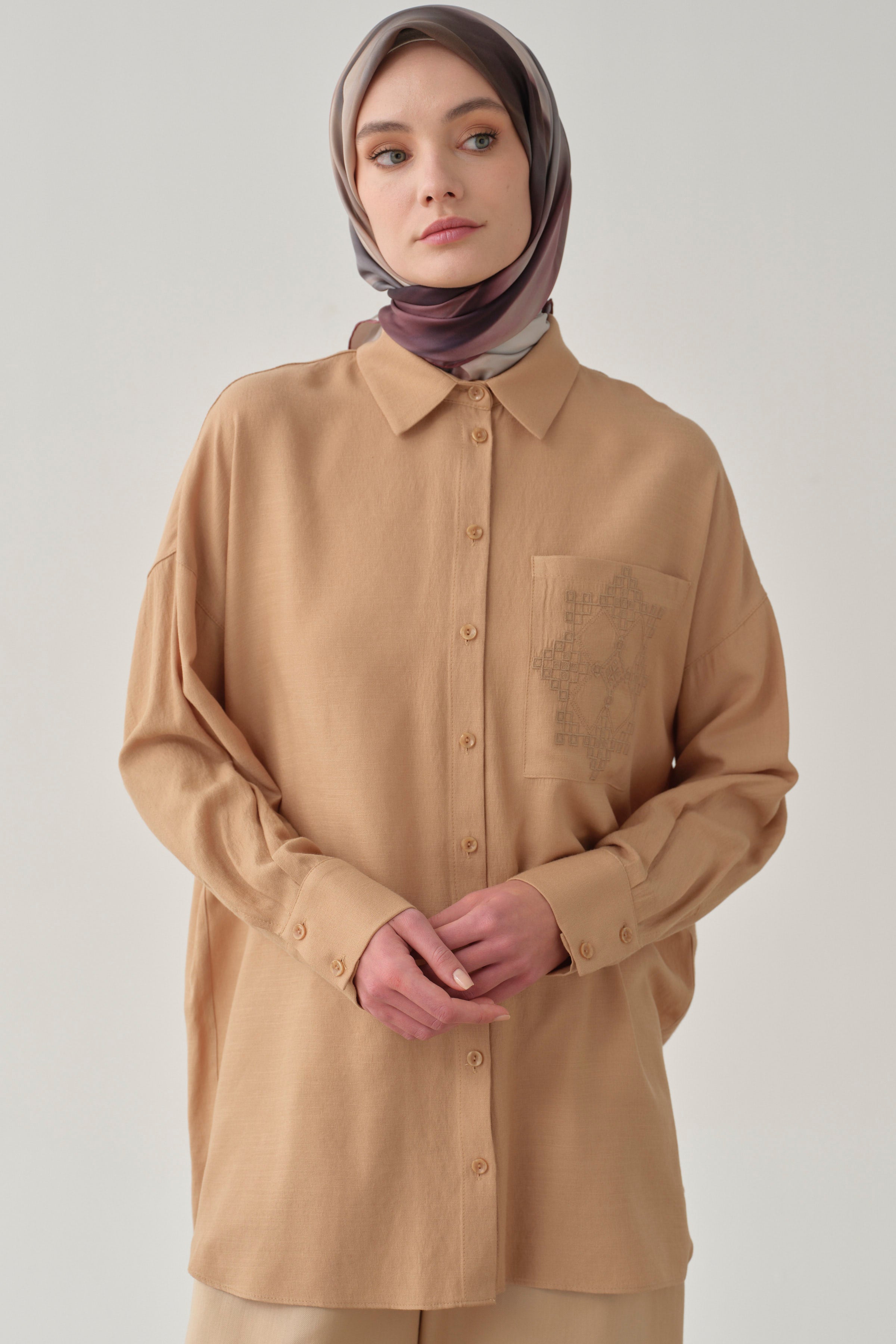 Chemise avec poche brodée - Beige
