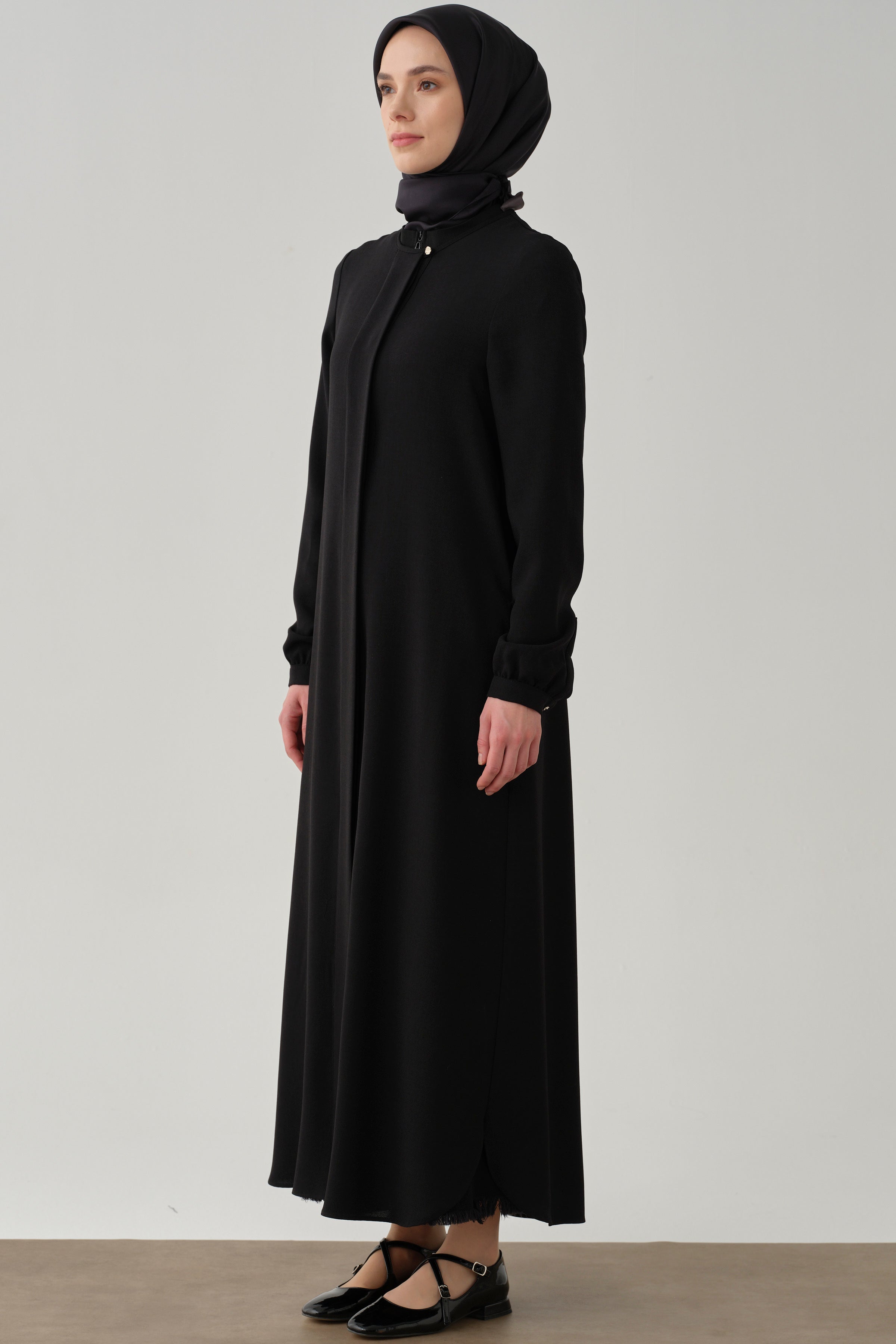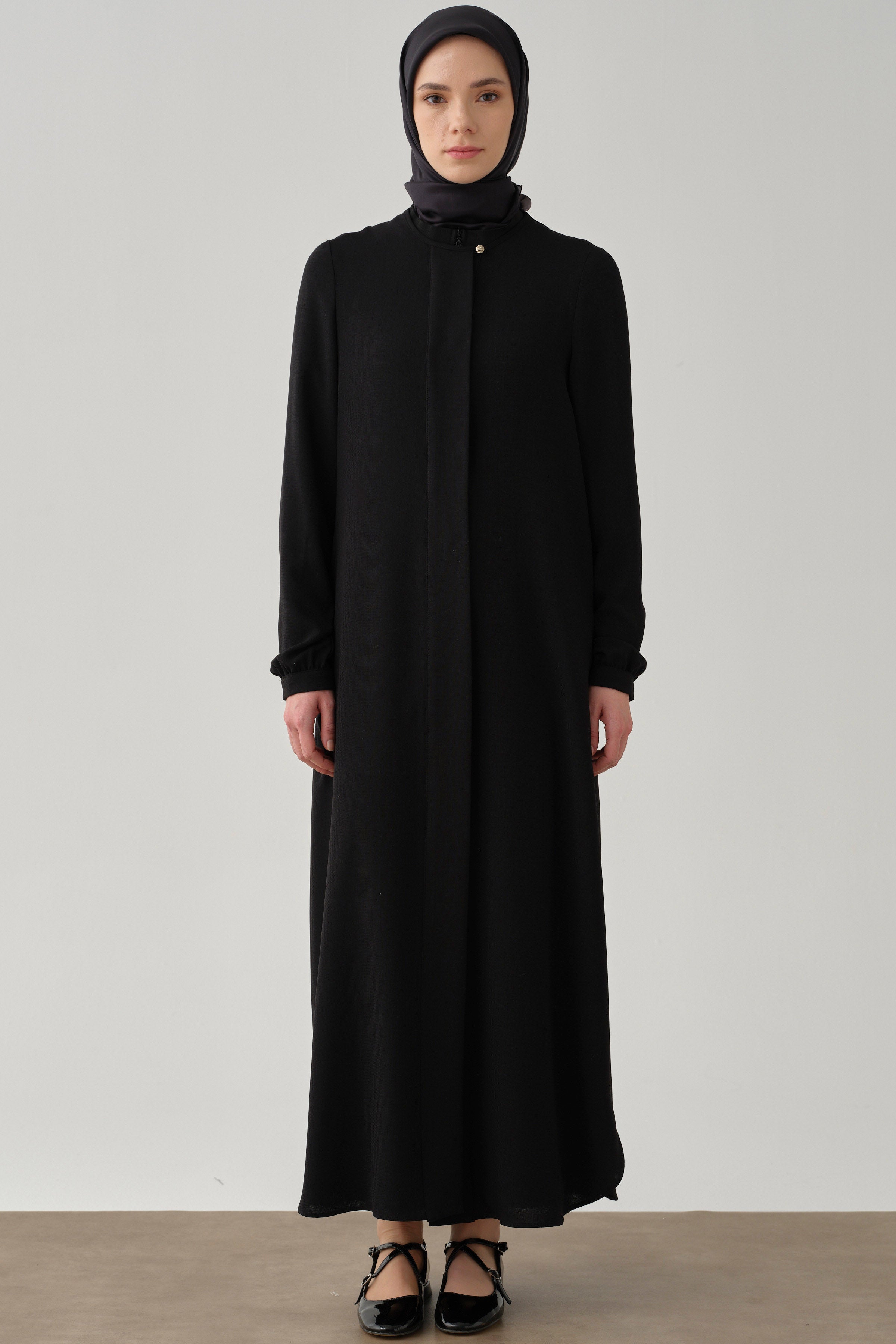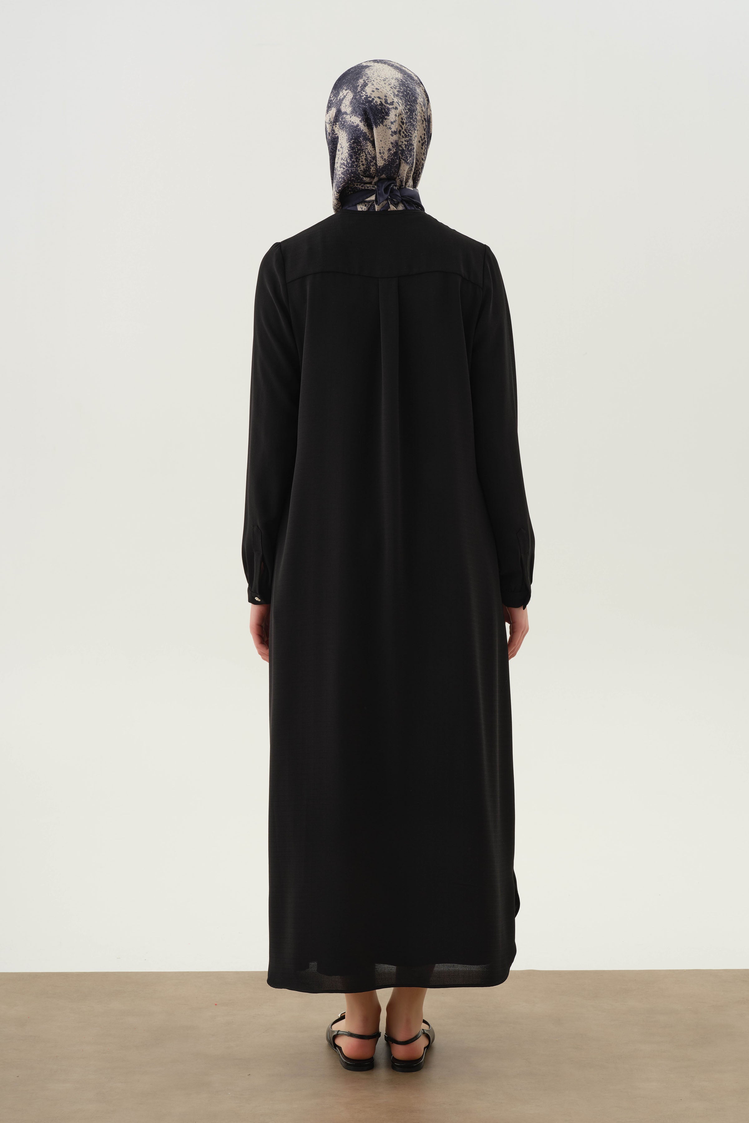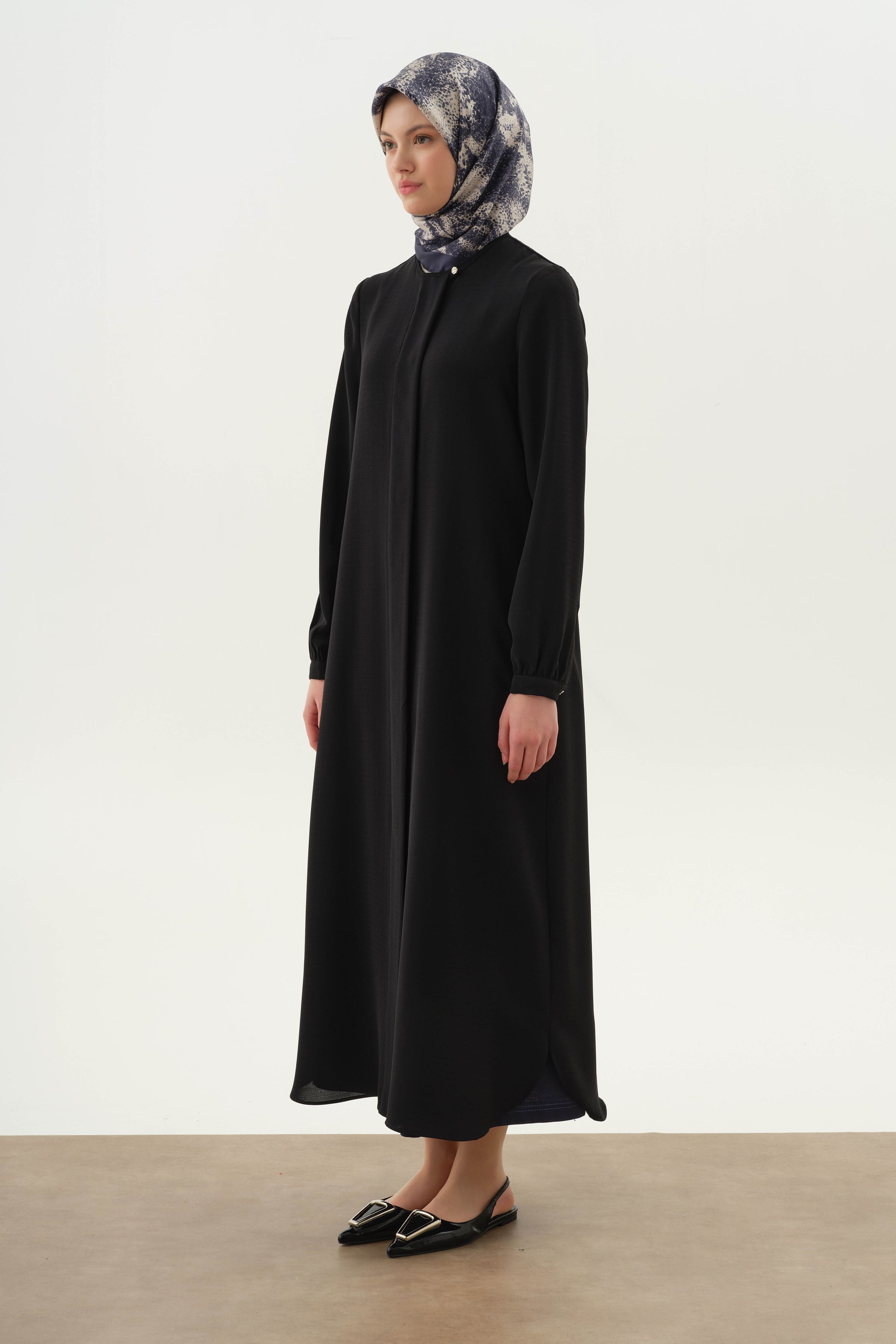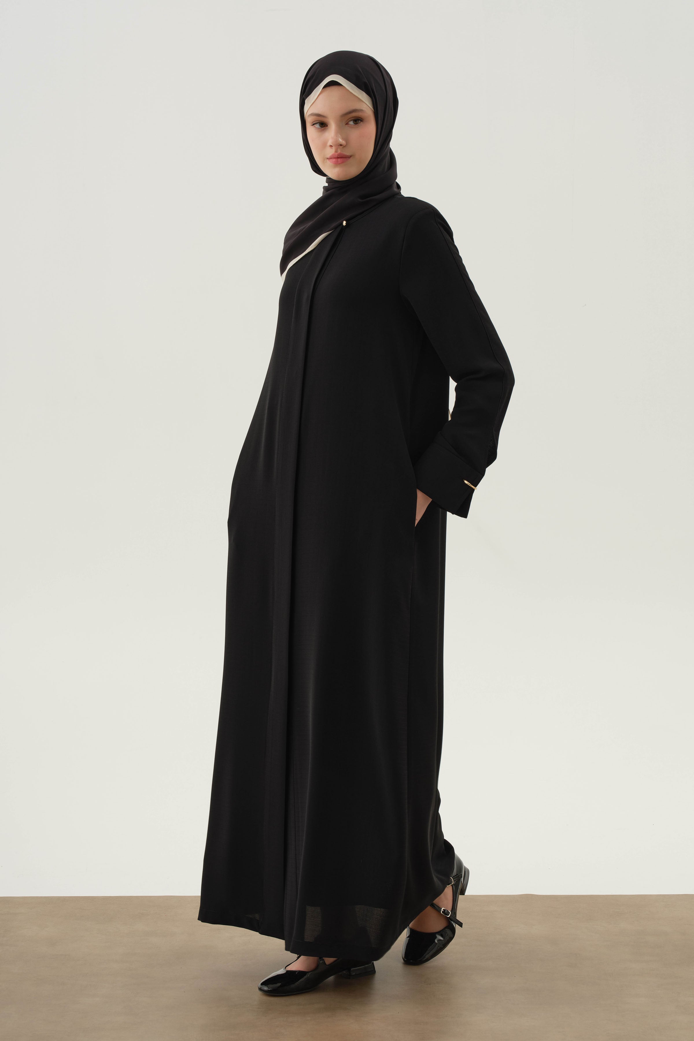 Abaya à col rond avec patte de boutonnage cachée - Noir