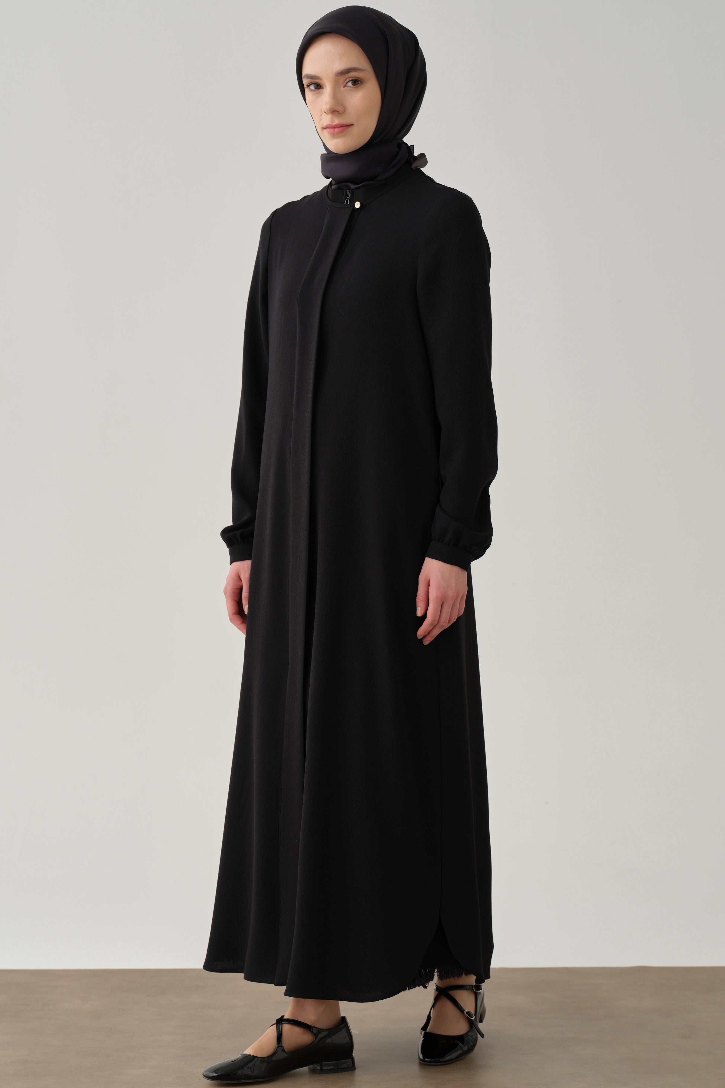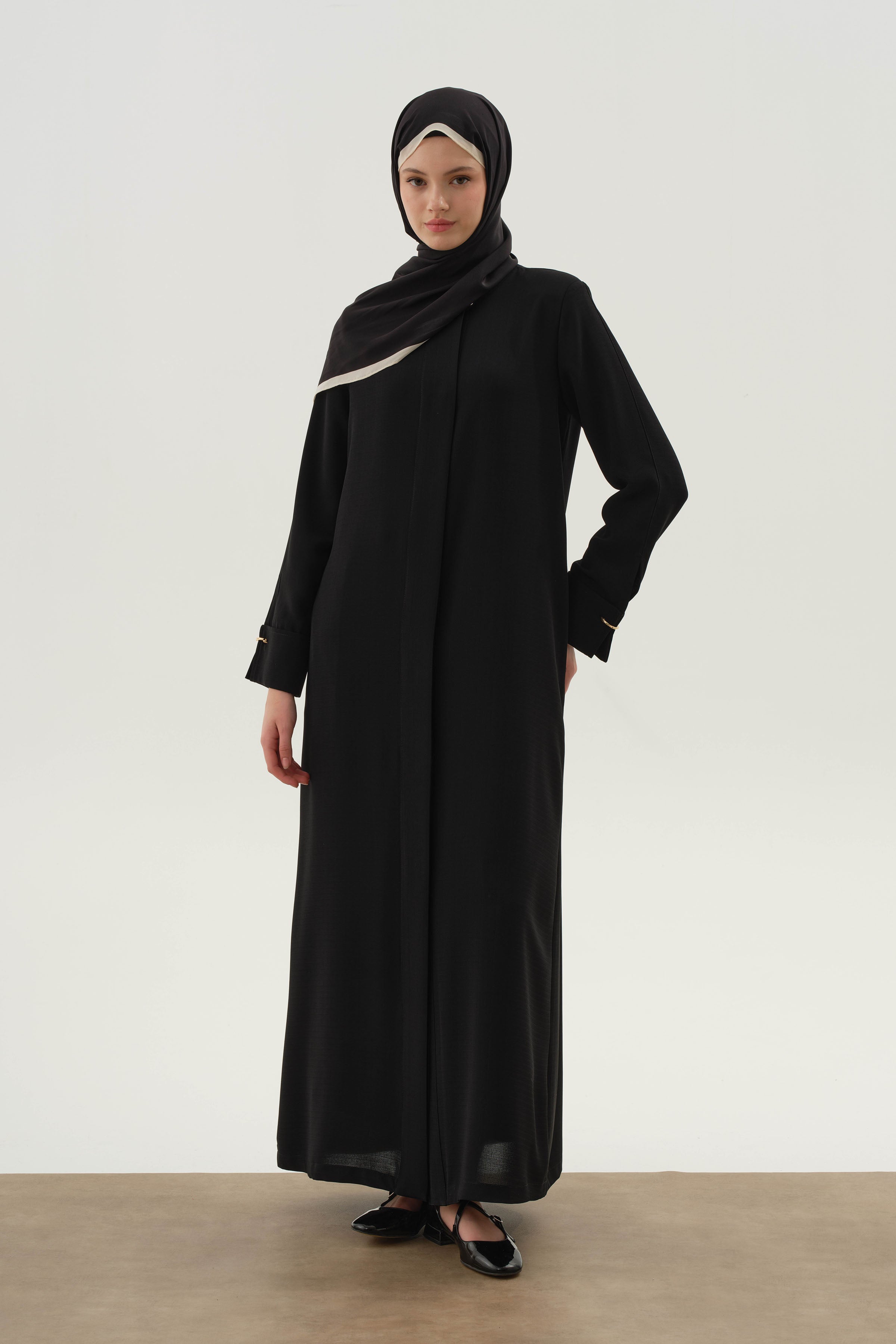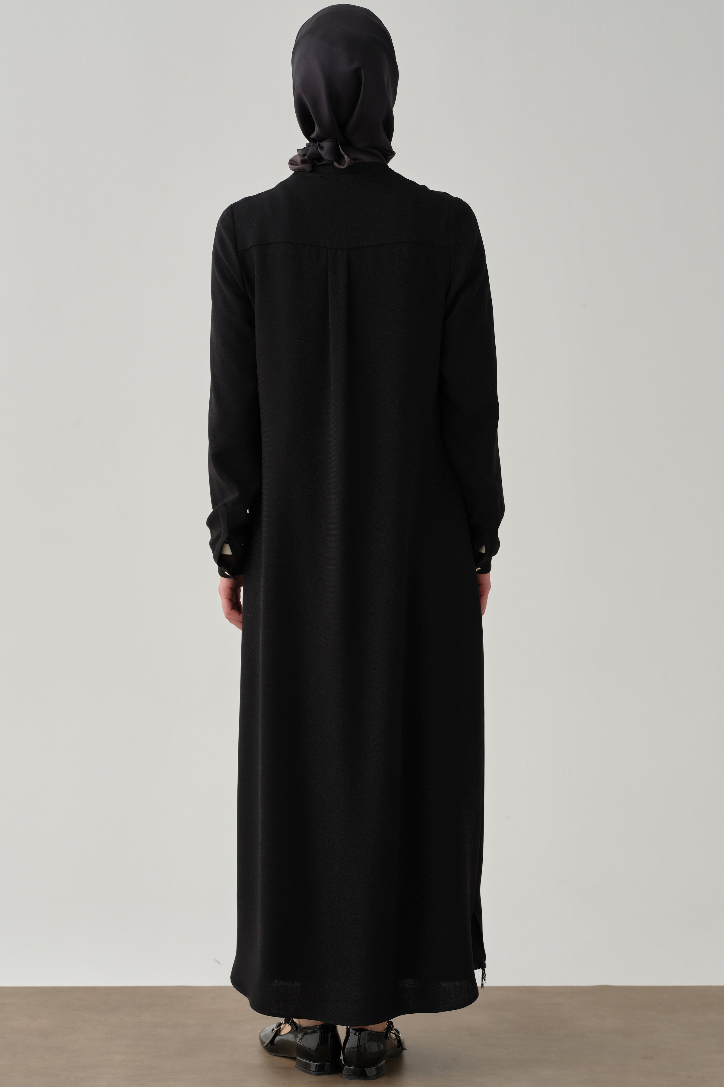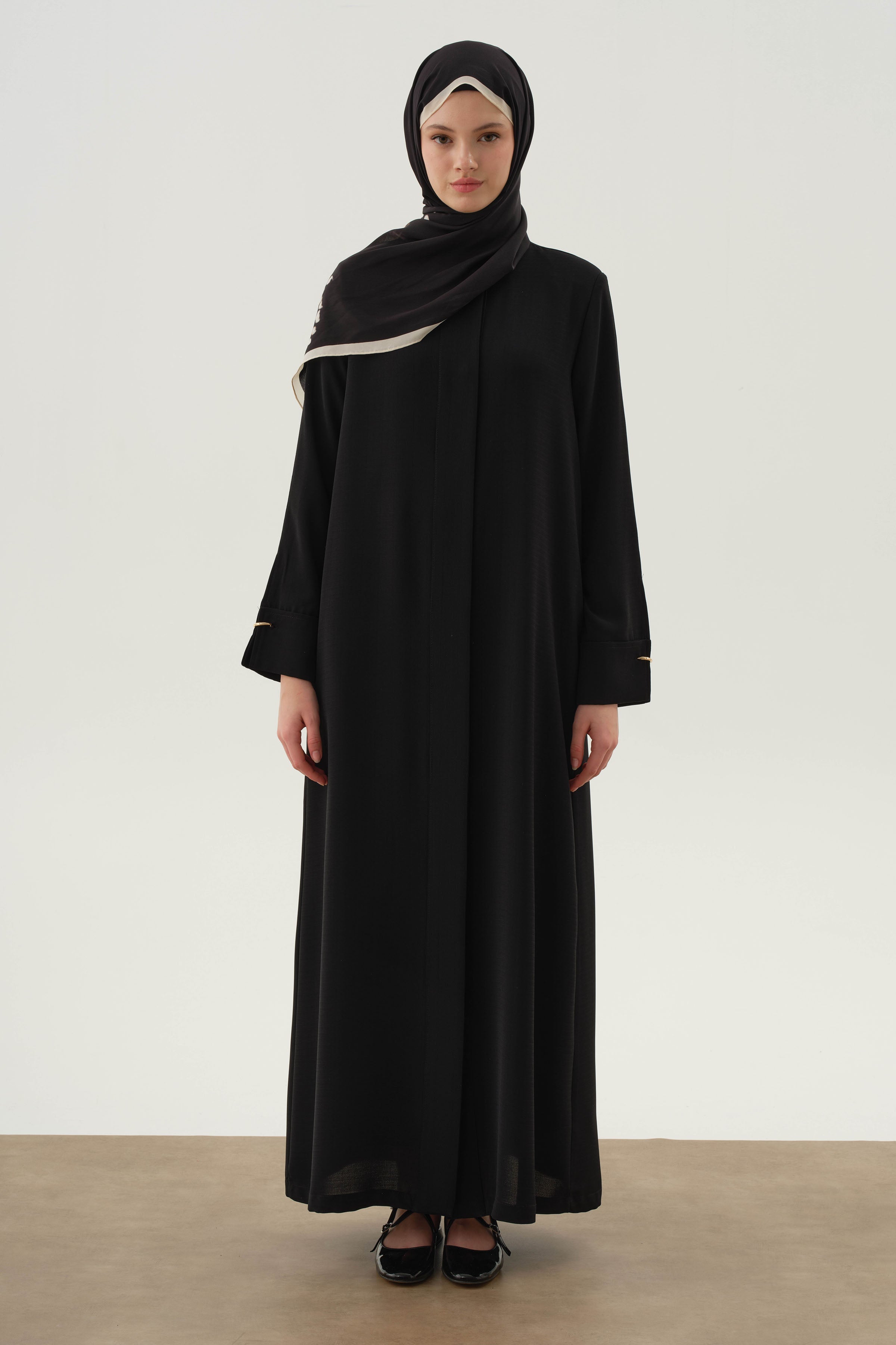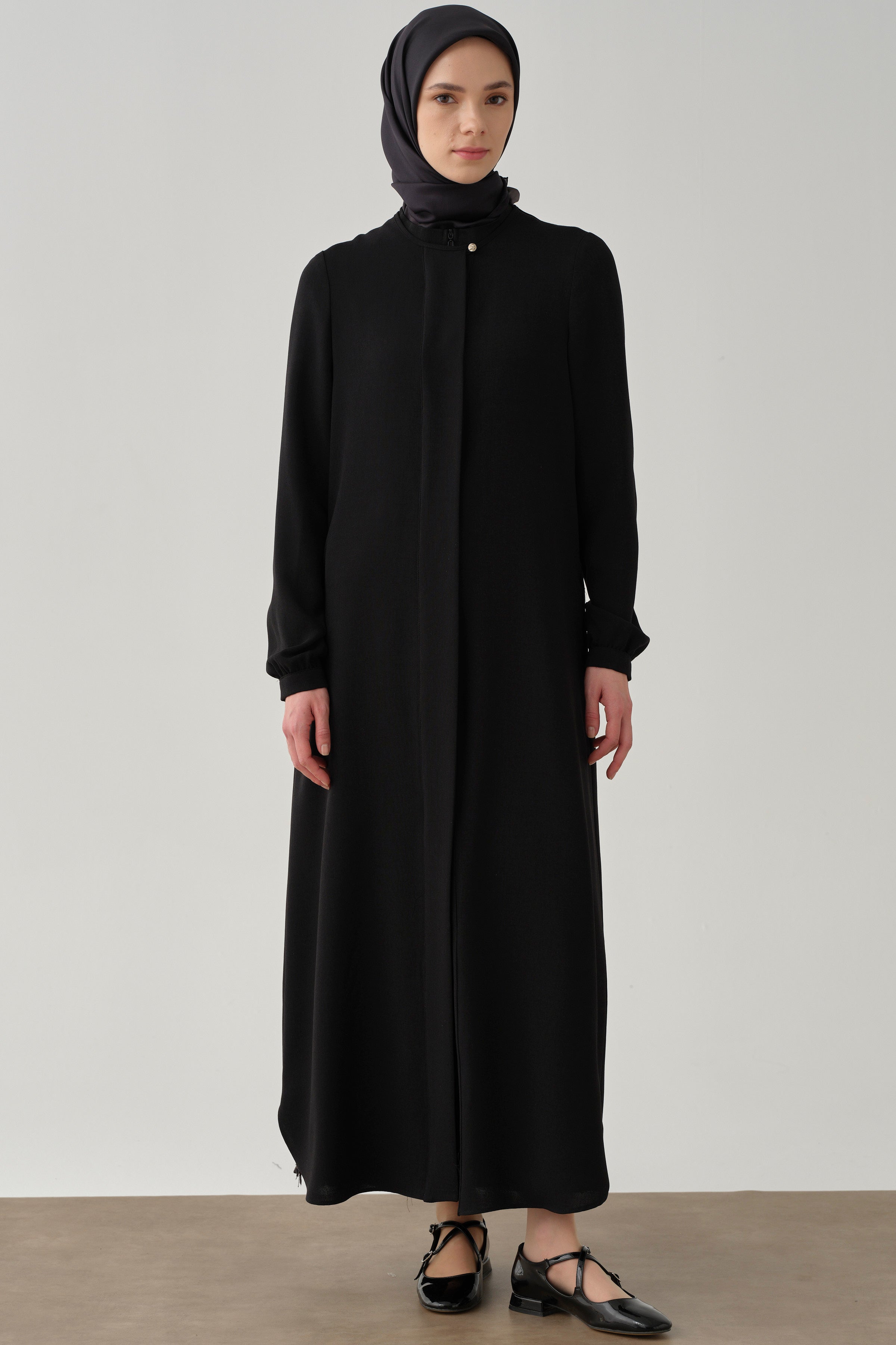 Abaya à col rond avec patte de boutonnage cachée - Noir