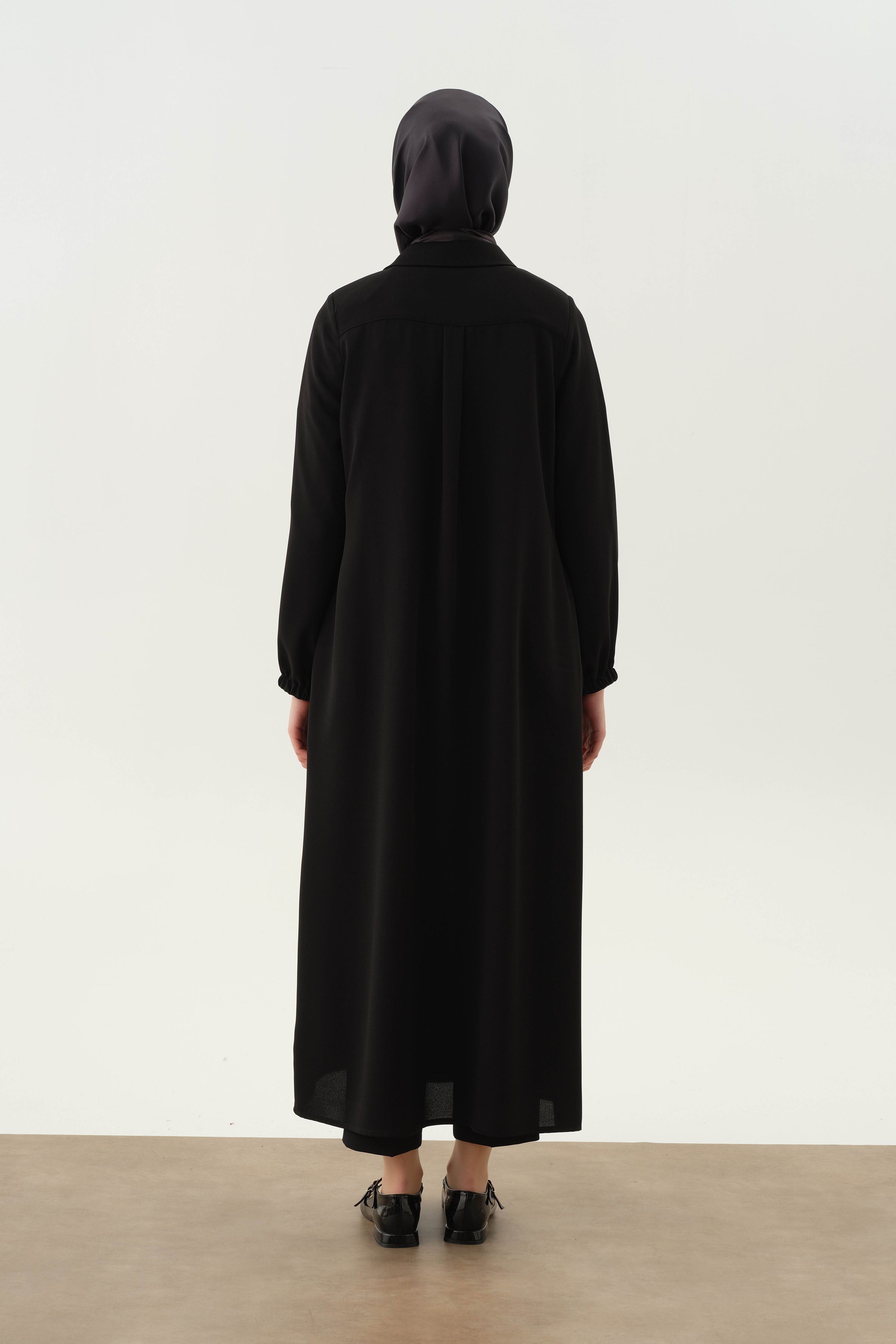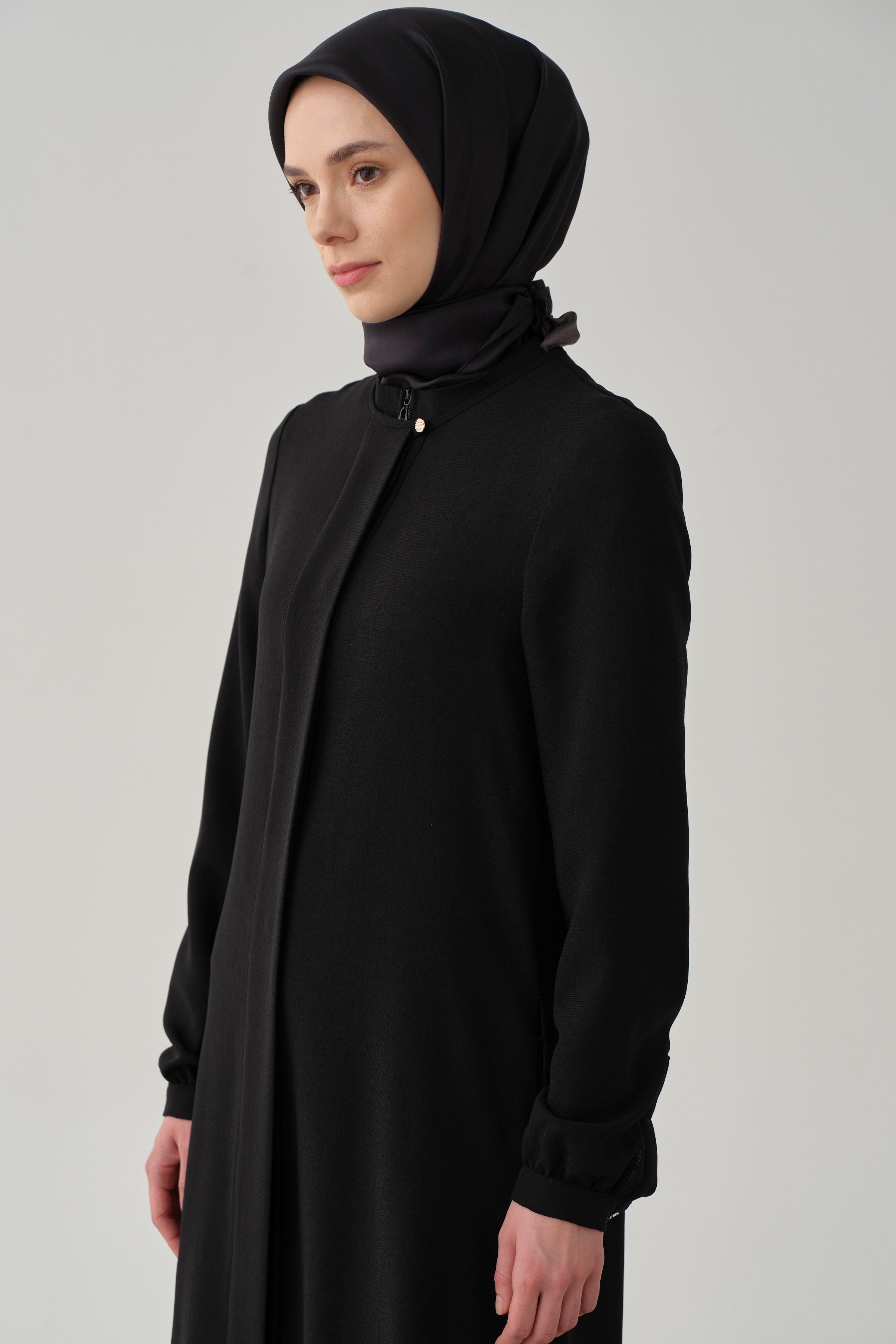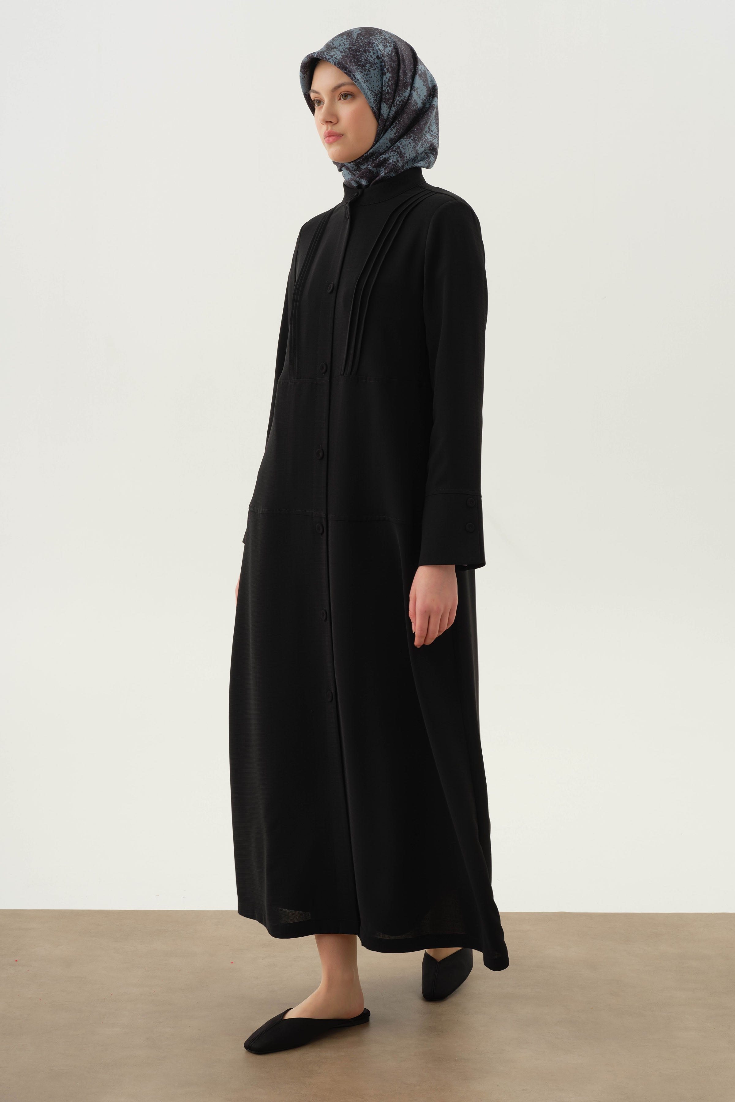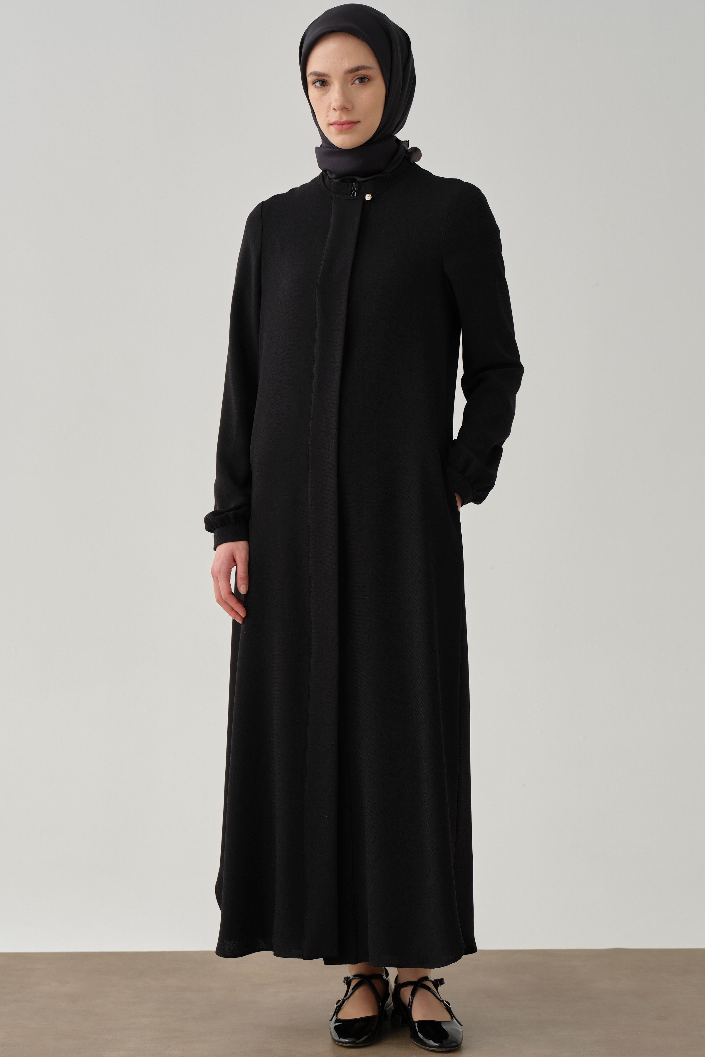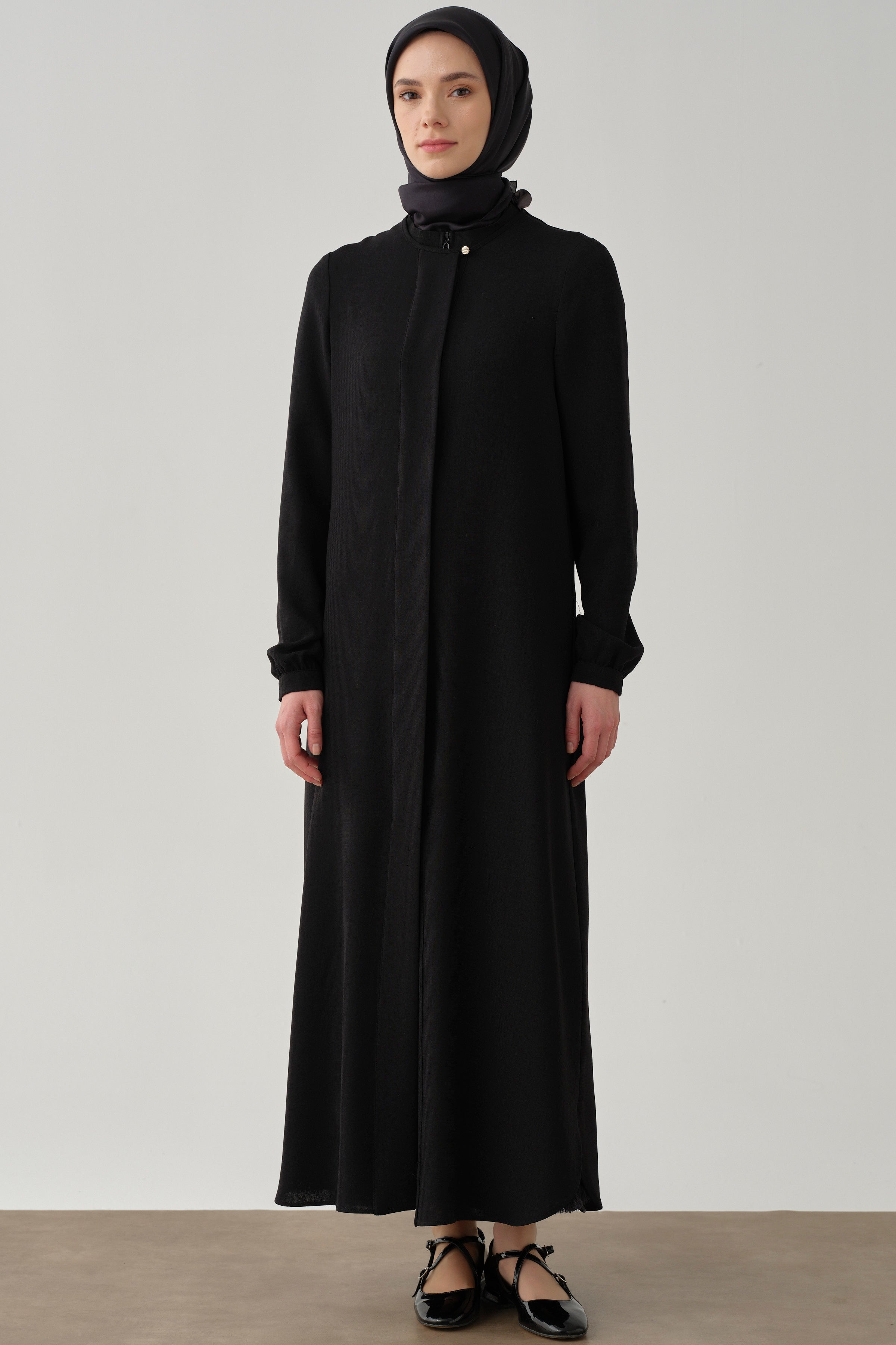 Abaya à col rond avec patte de boutonnage cachée - Noir