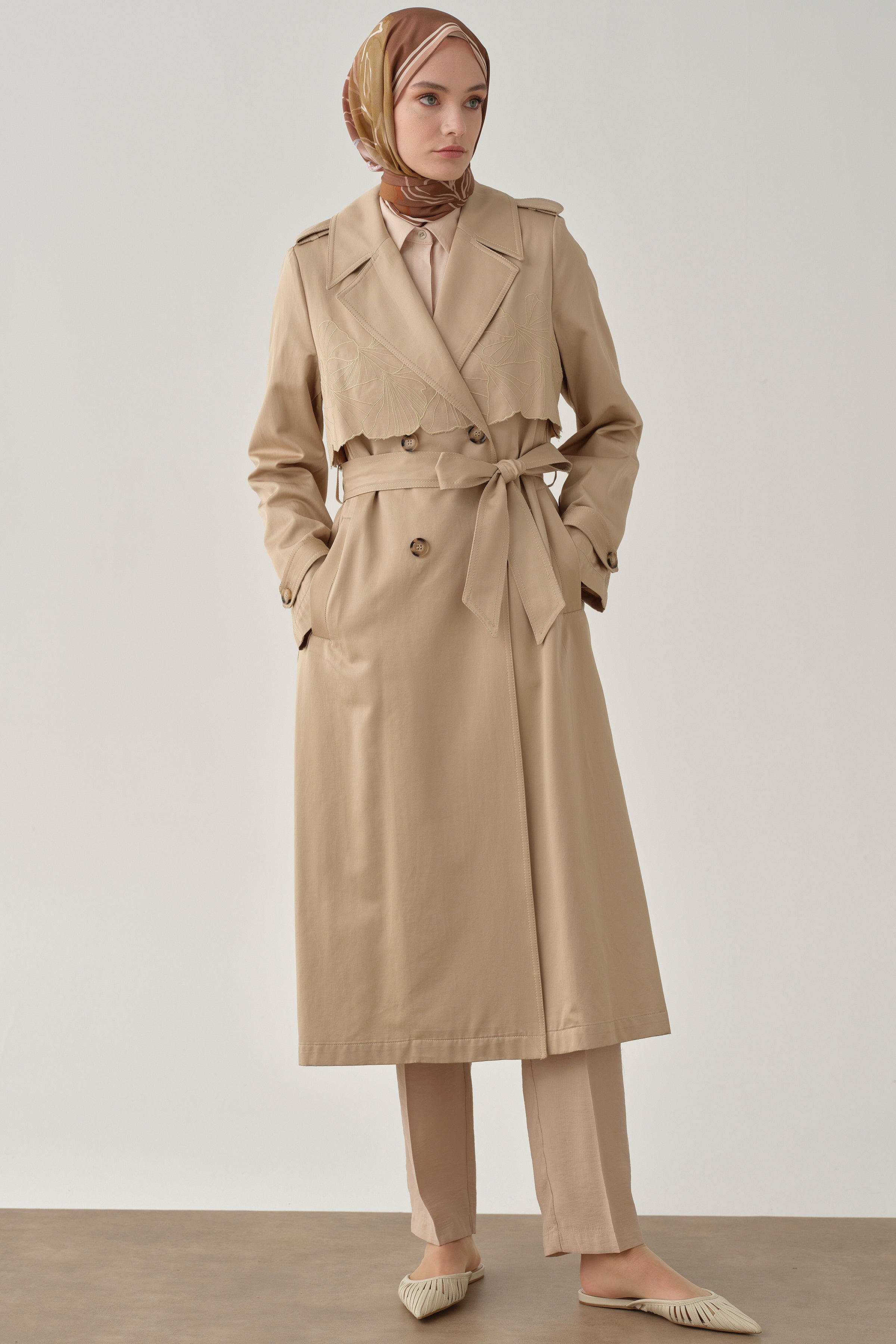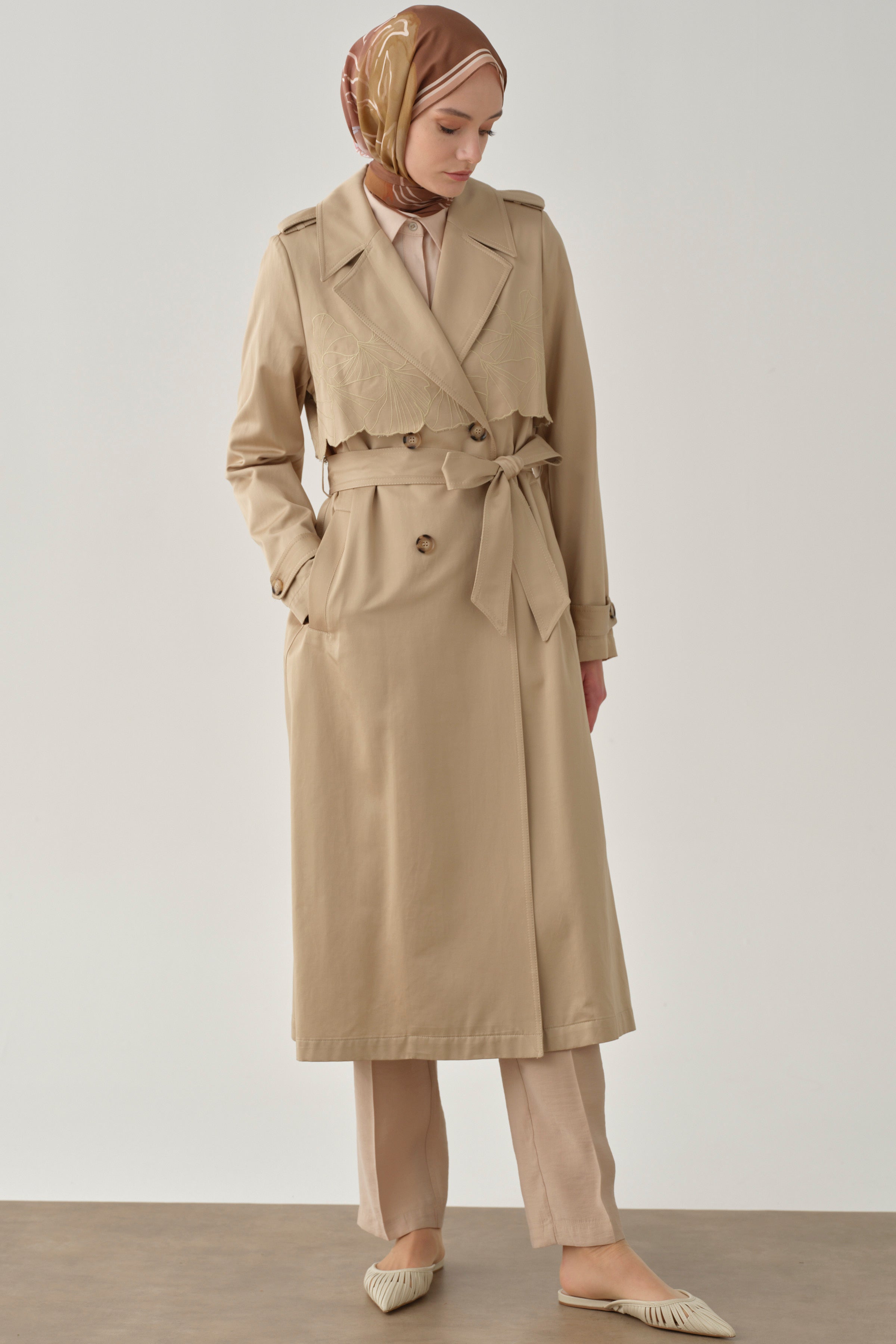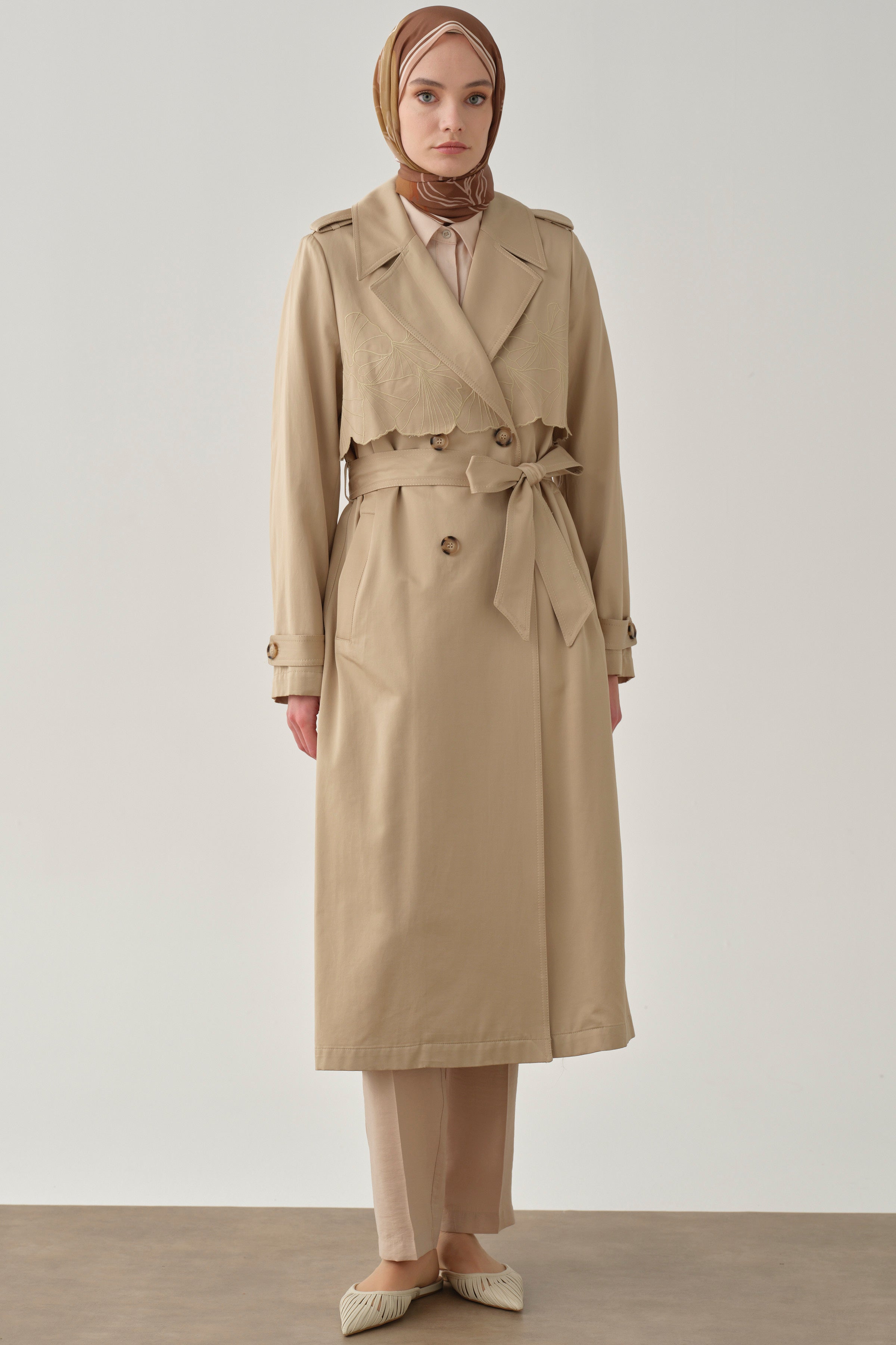 Trench-coat avec détails de broderie et rabat coupe-vent - Grége clair