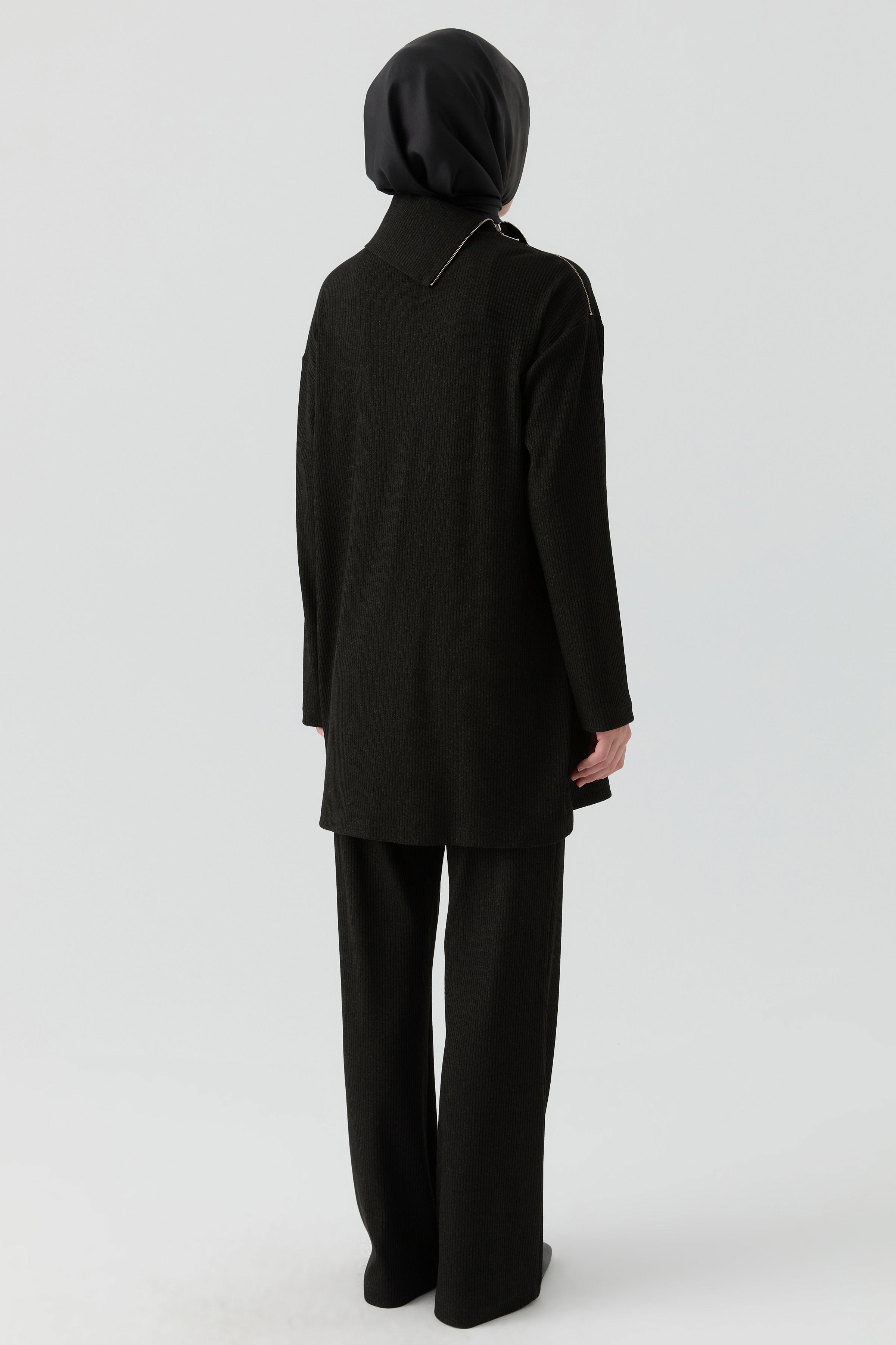 Ensemble tunique pantalon tricoté à col roulé - Café