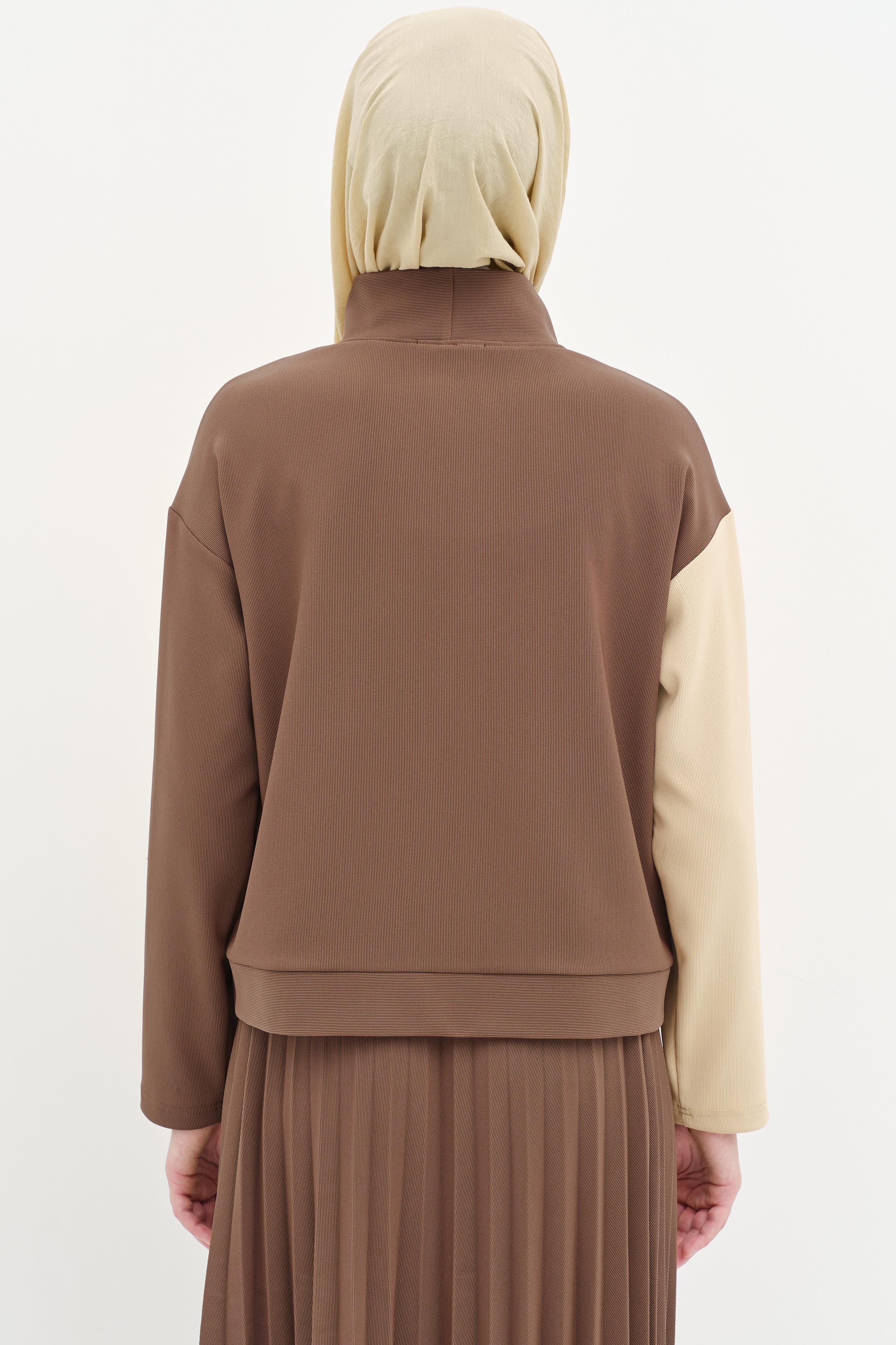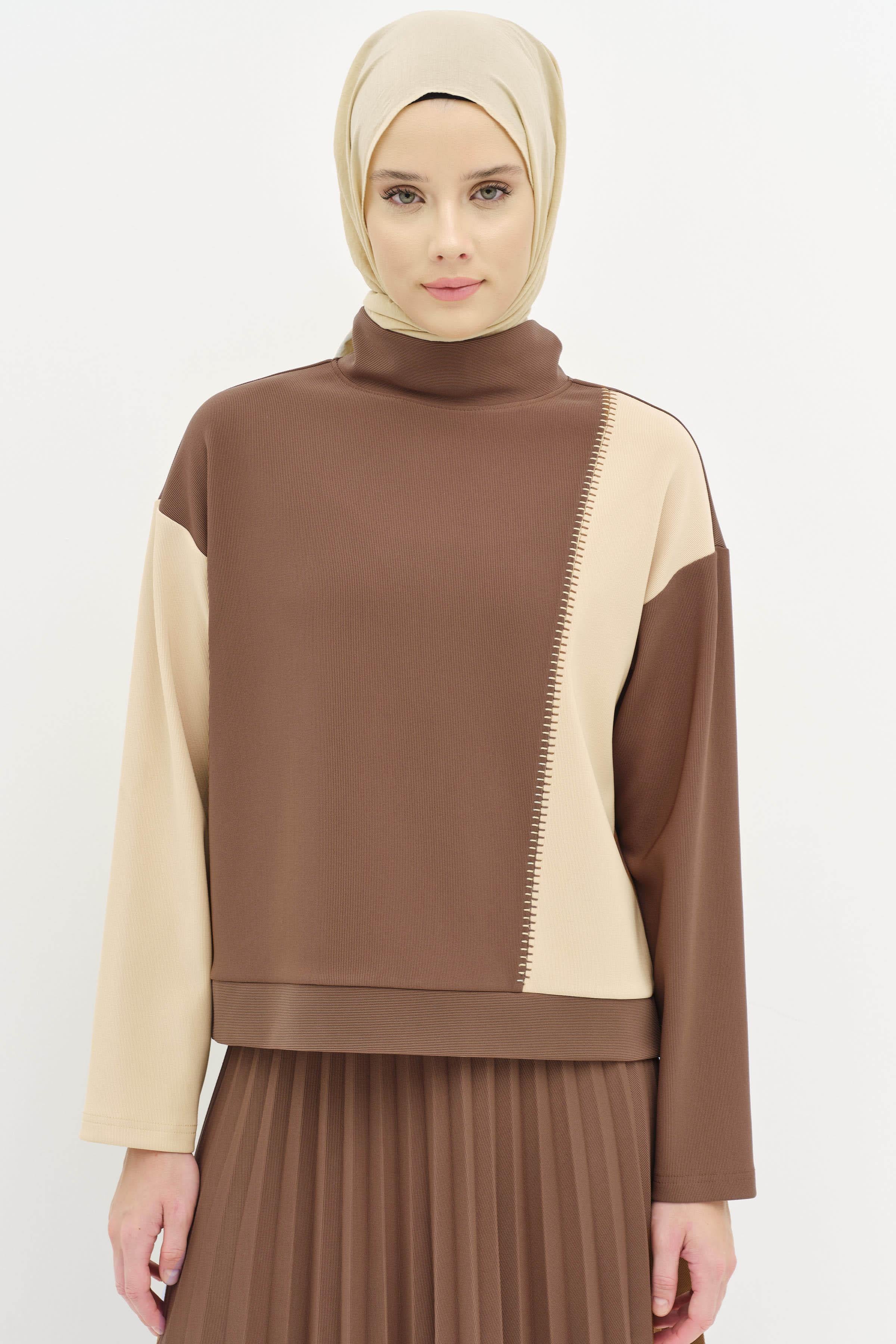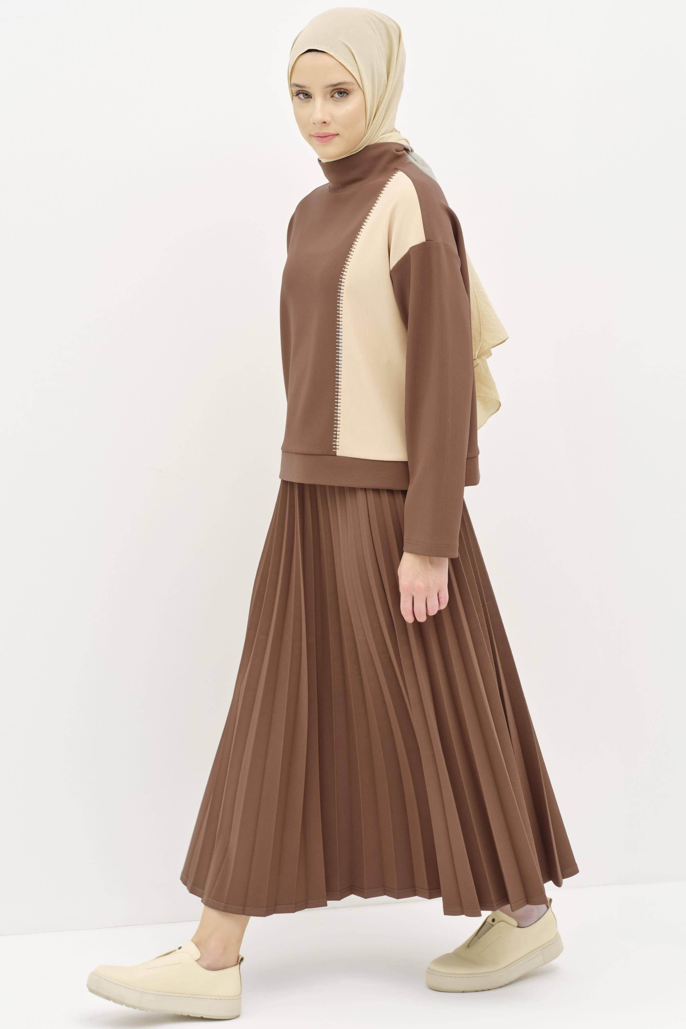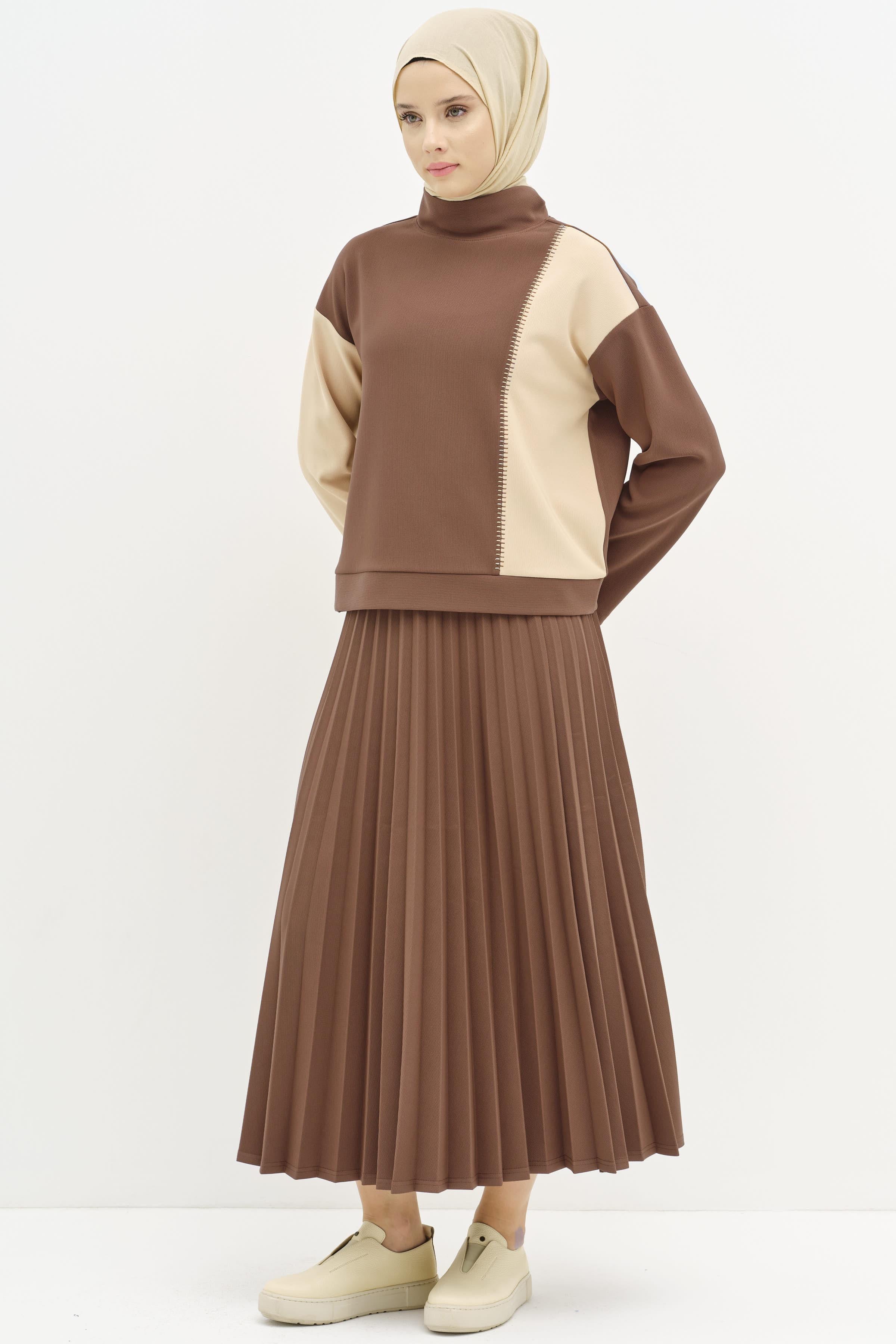 Ensemble en tricot avec jupe et blouse à broderies et garnitures - Café