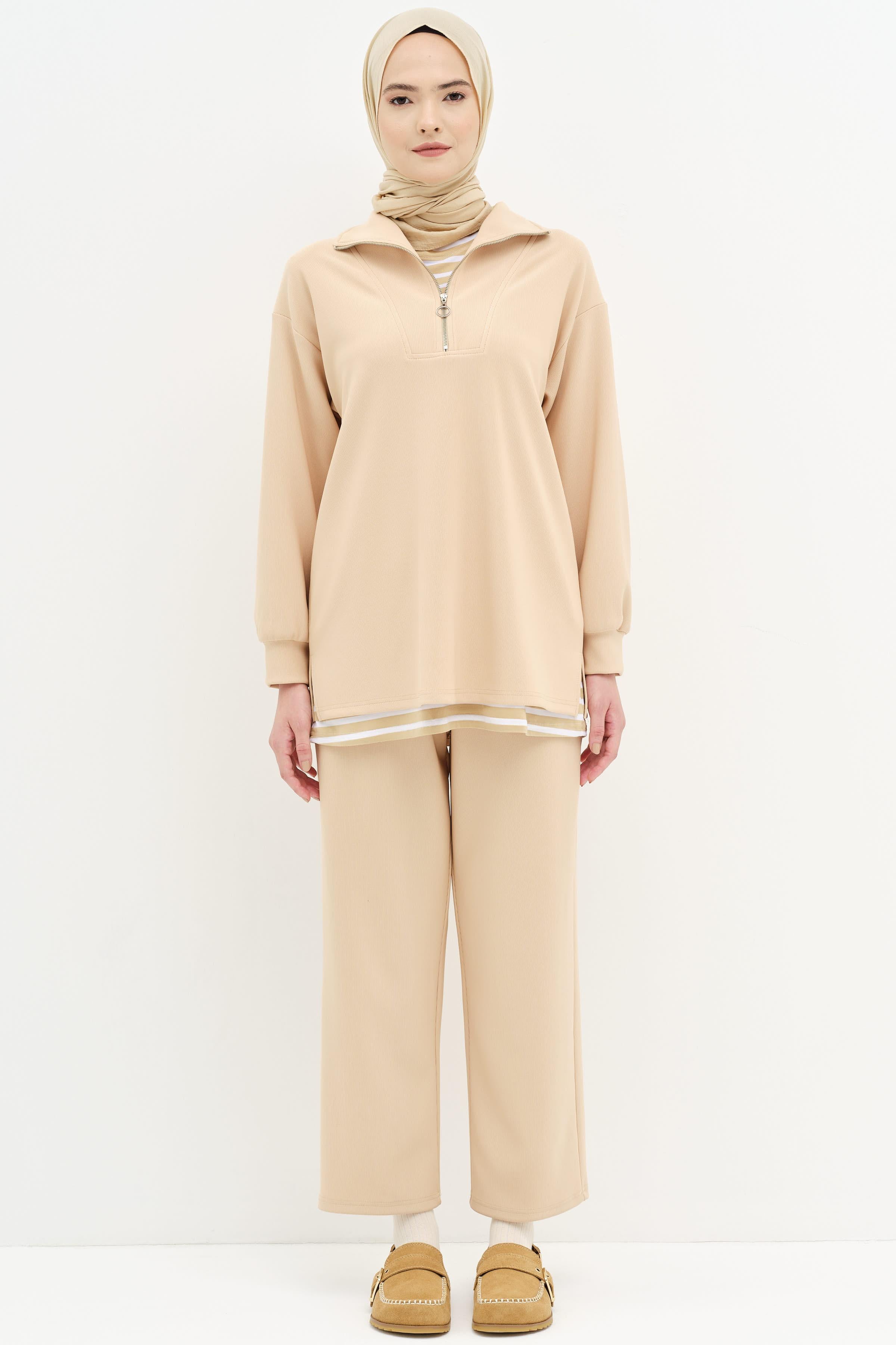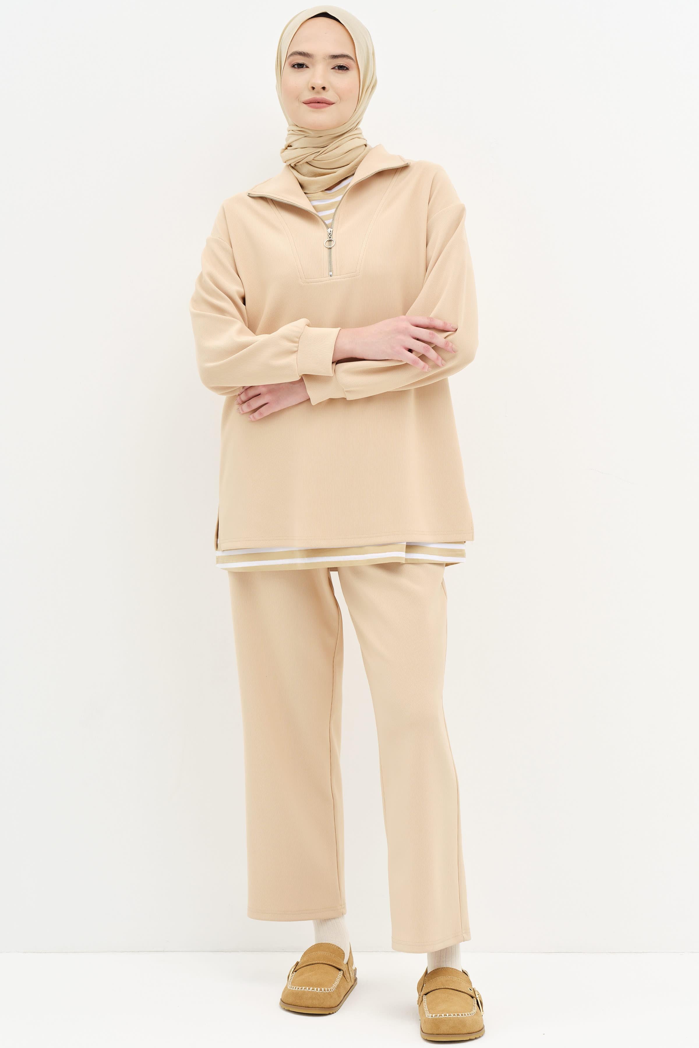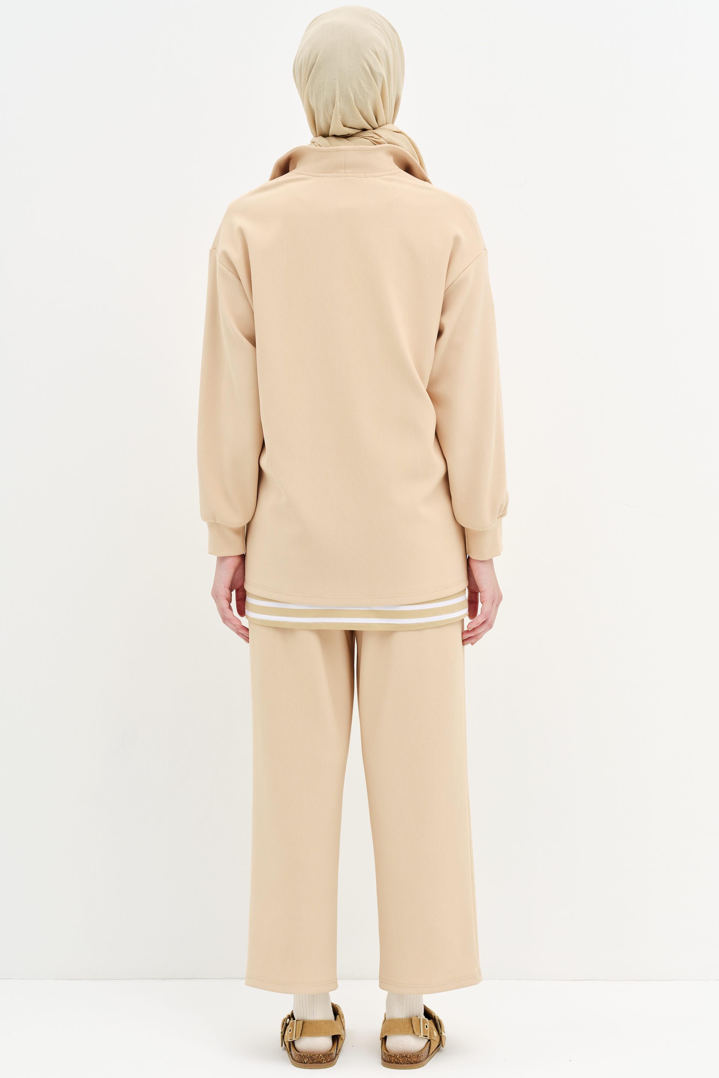 Ensemble tunique pantalon tricoté à col roulé - Beige