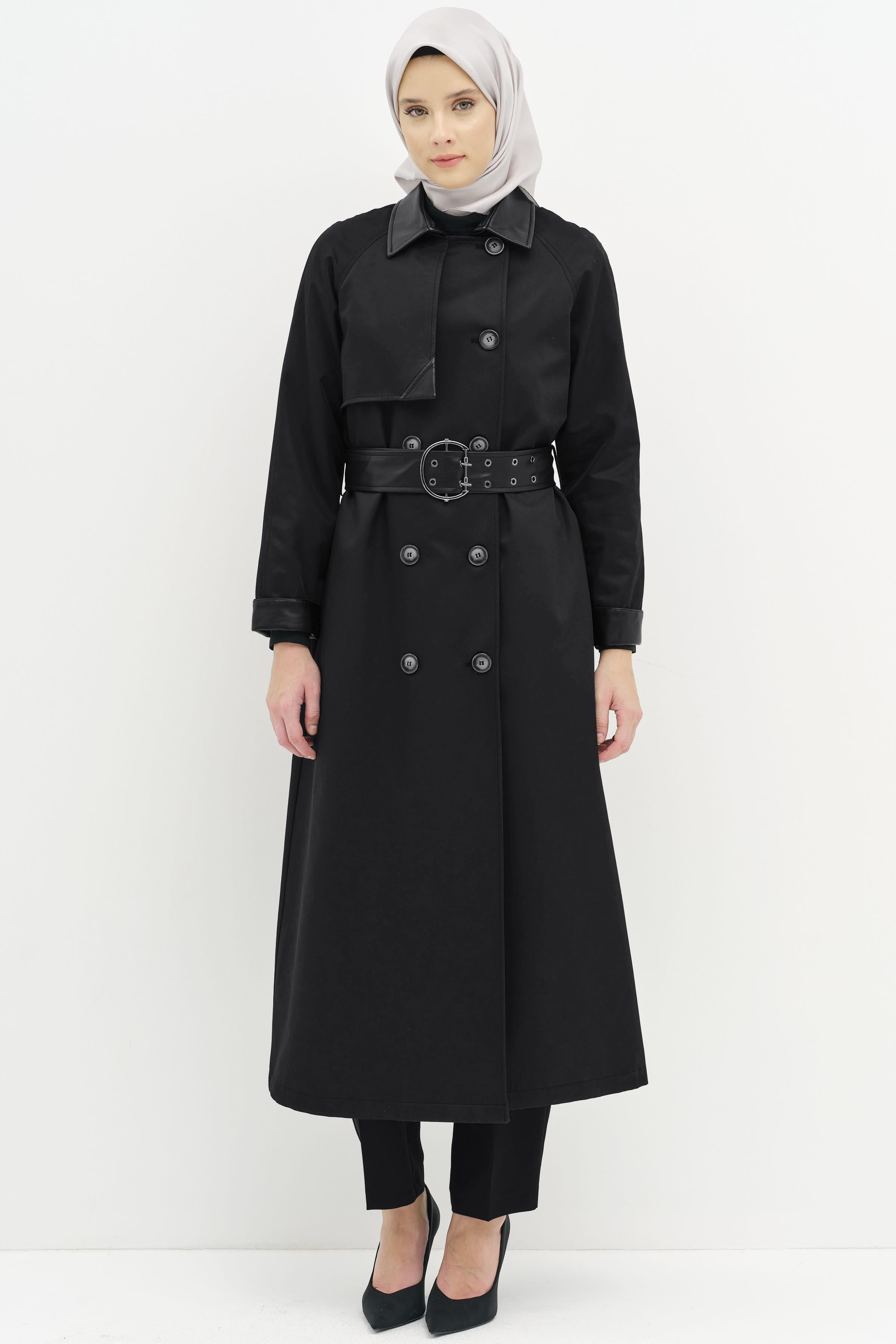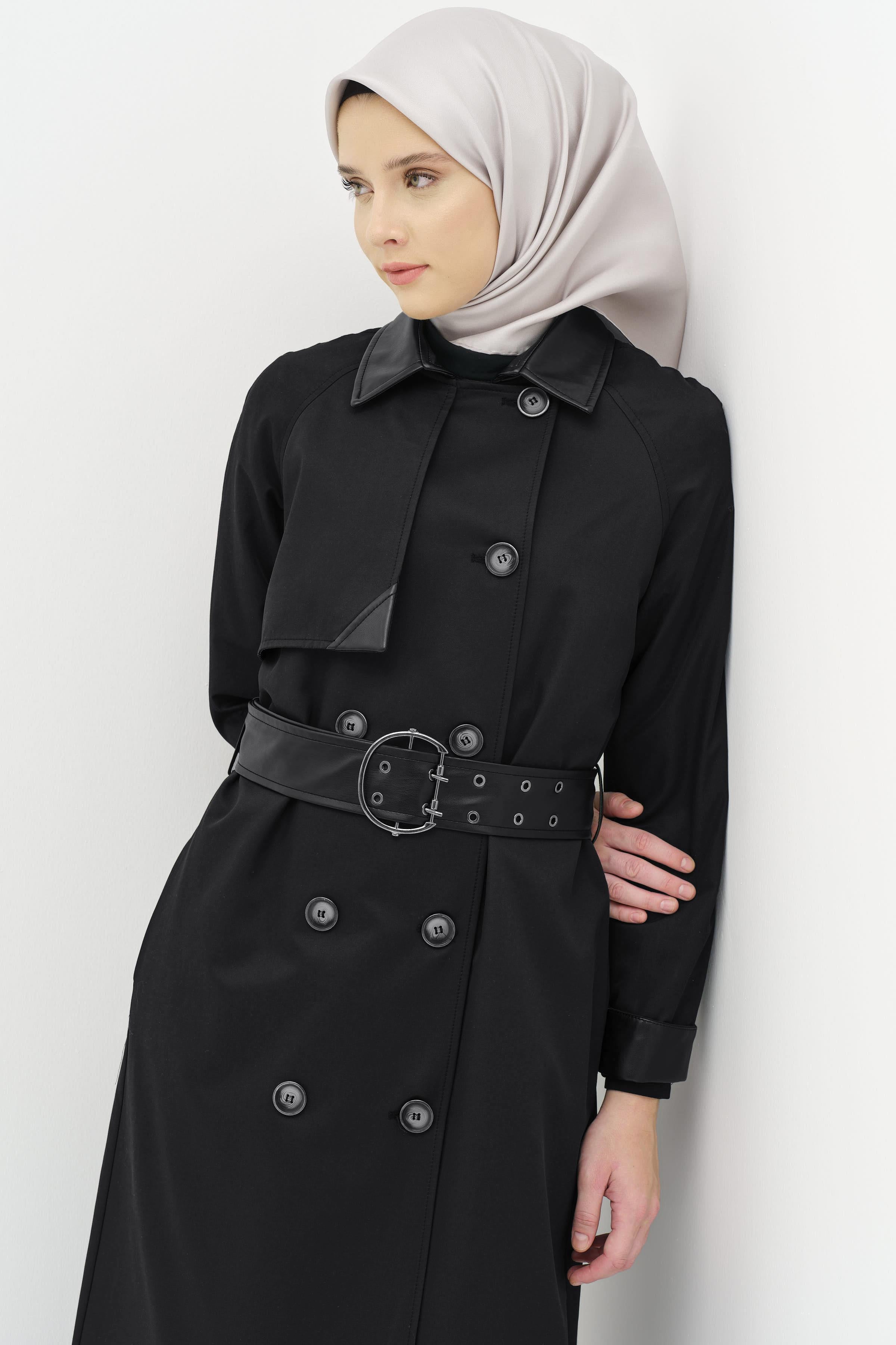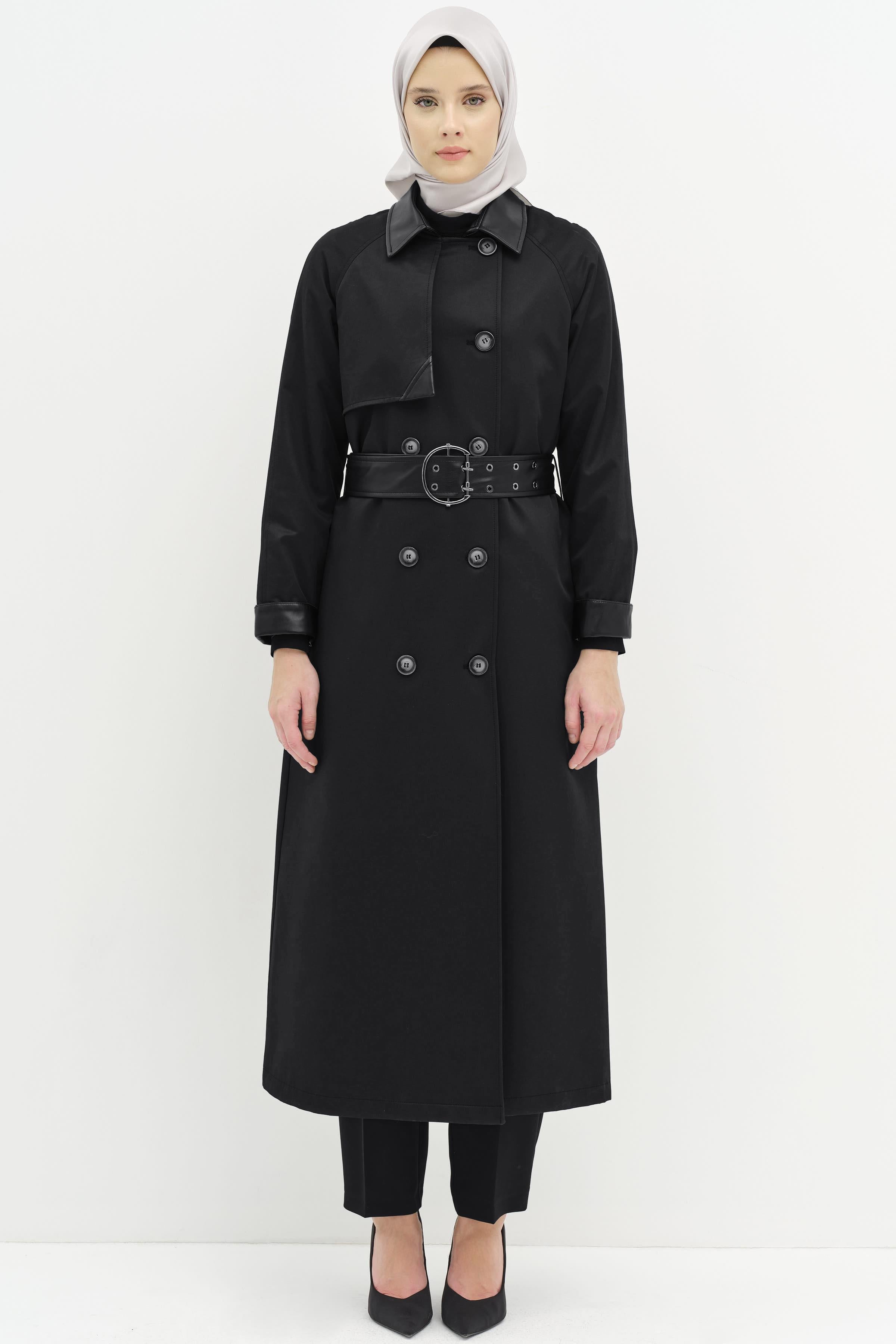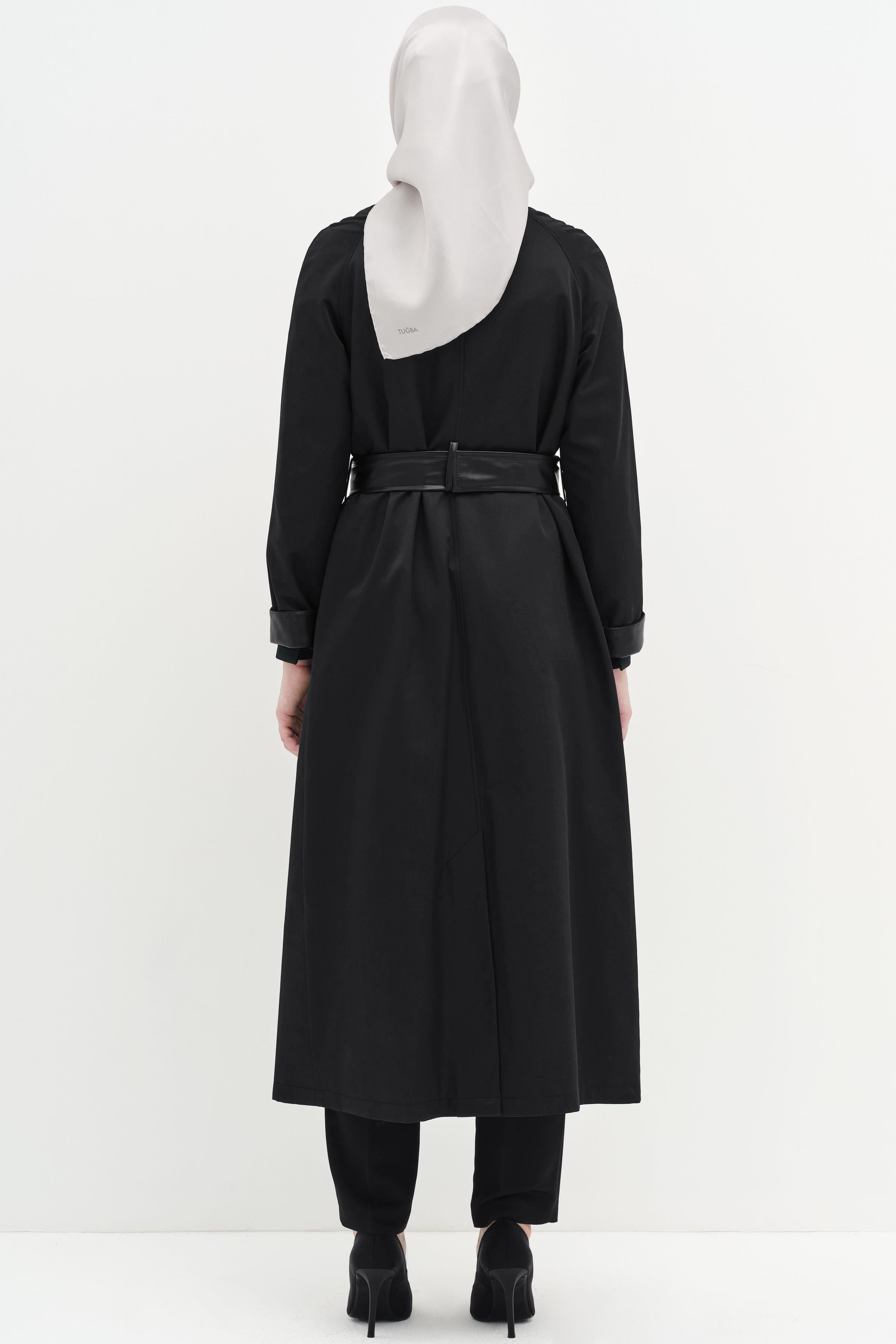 Trench-coat avec détails de ceinture et garnitures en cuir - Noir