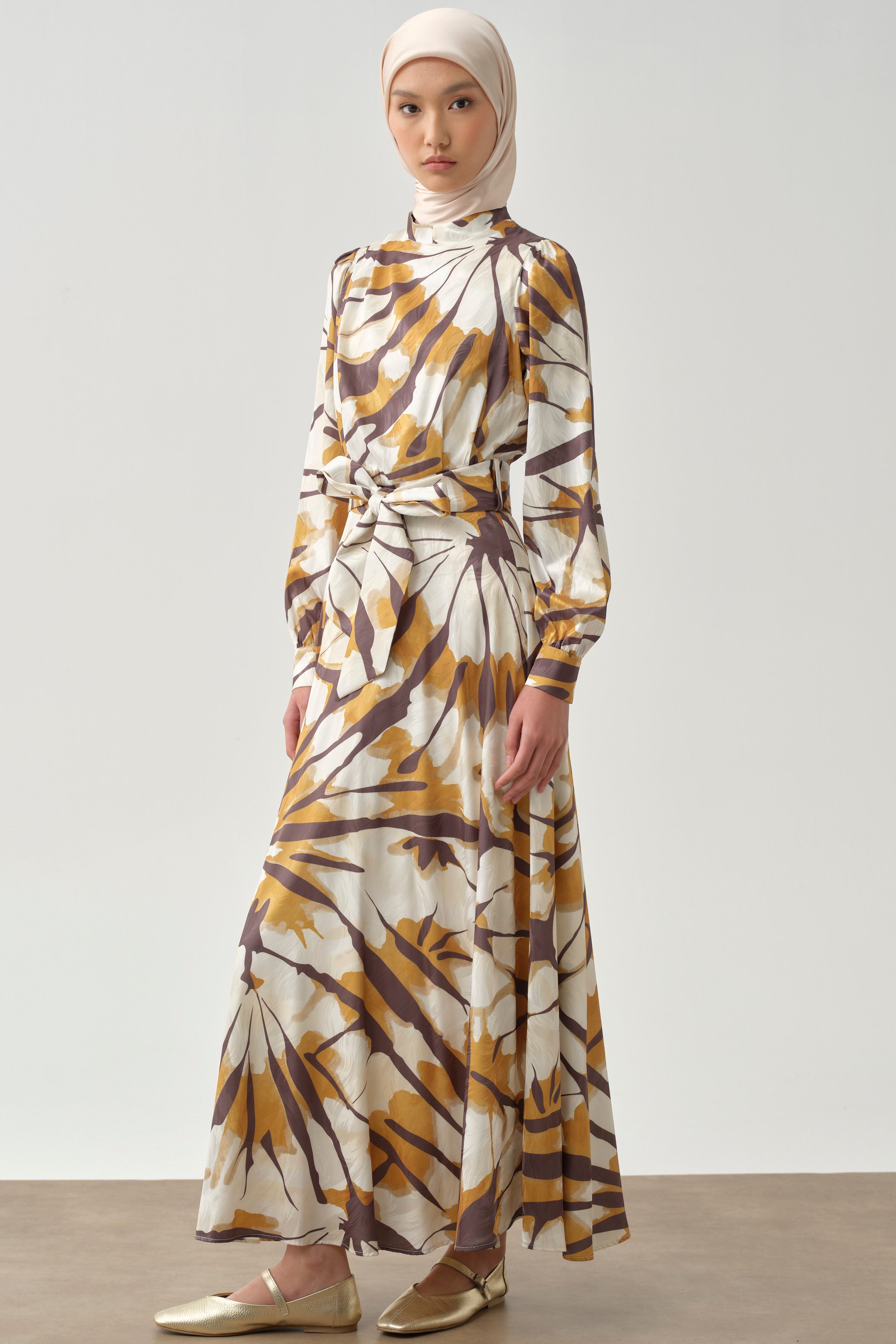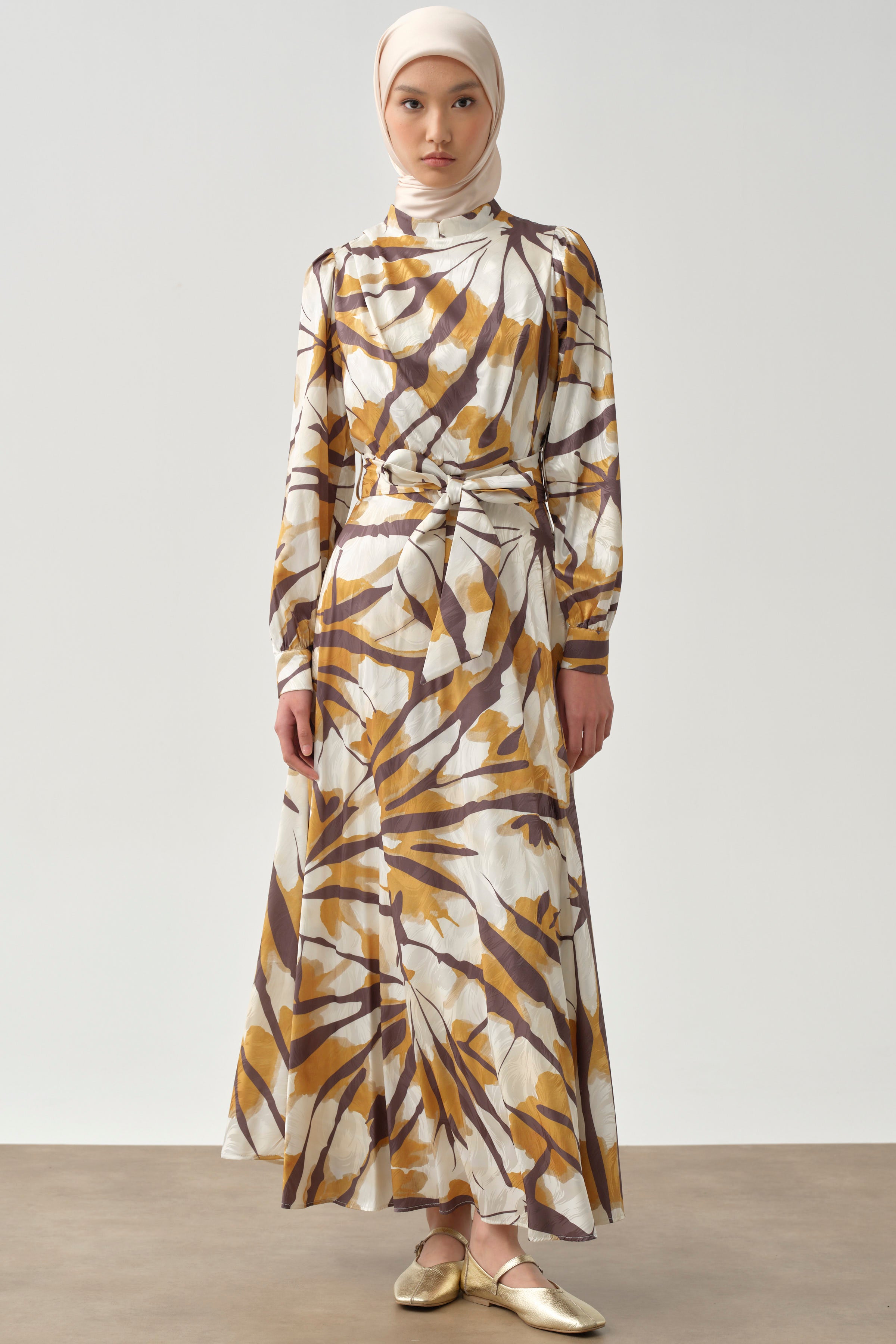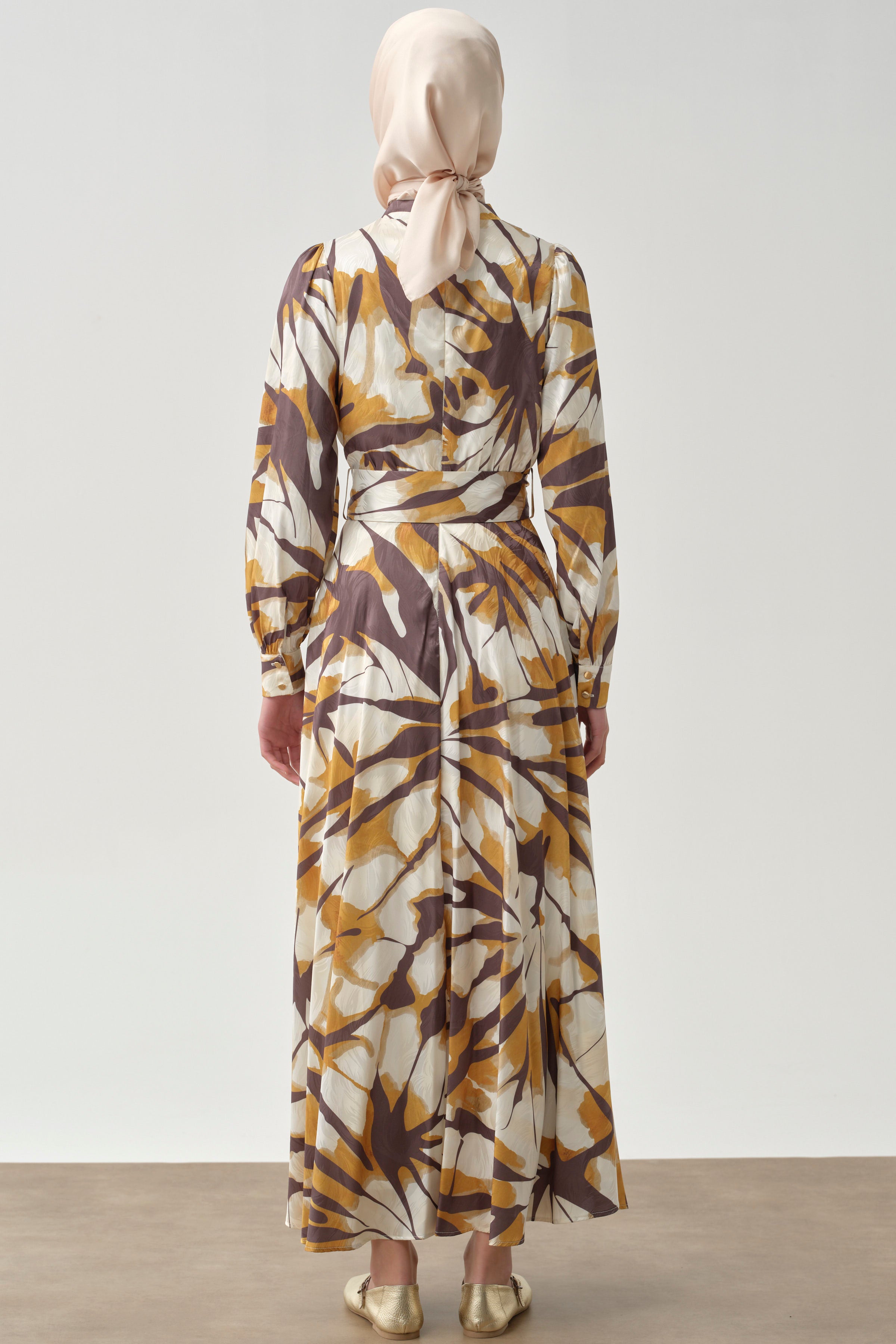 Robe à motifs avec plis et volants - Moutarde