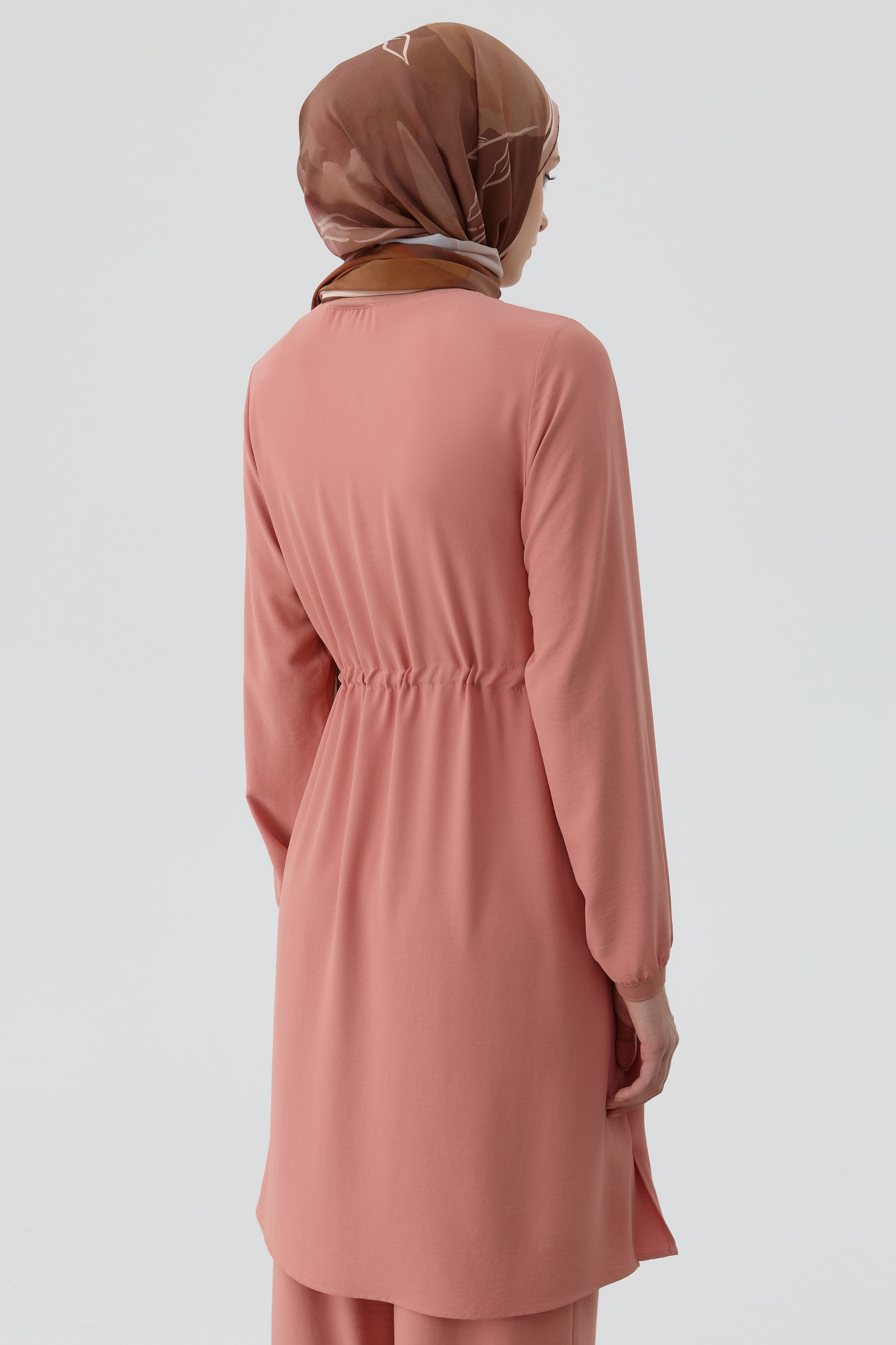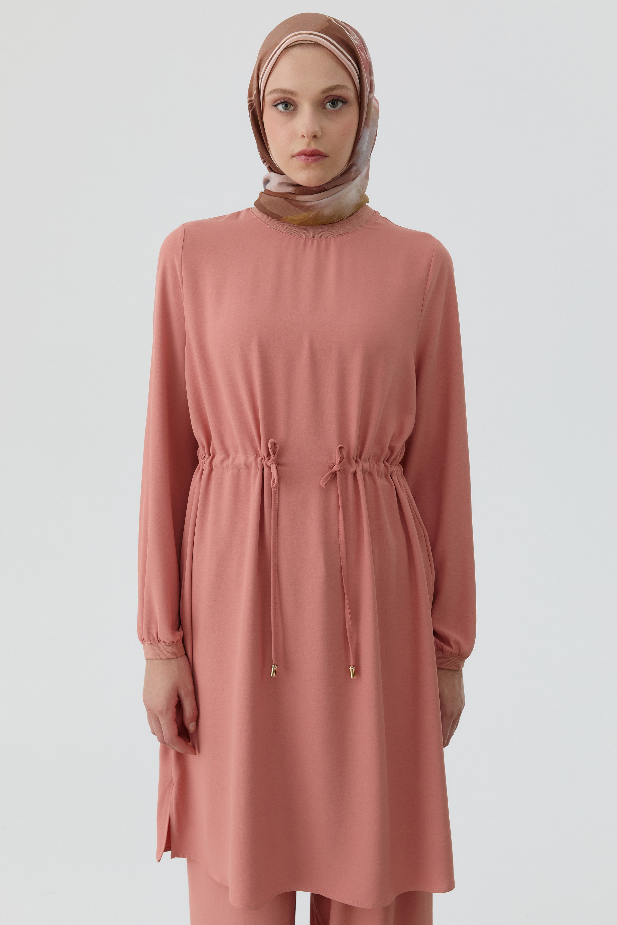 Tunique en maille côtelée avec cordon et pierres à la taille - Saumon