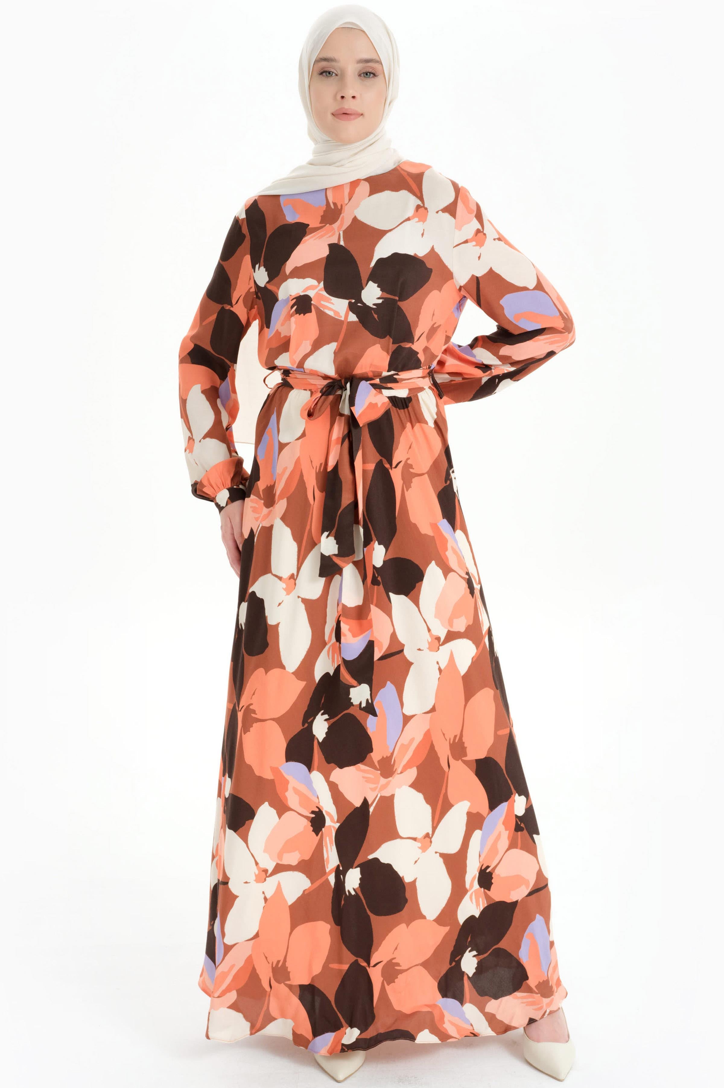 Robe à motifs à col rond et ceinture à la taille - Pêche