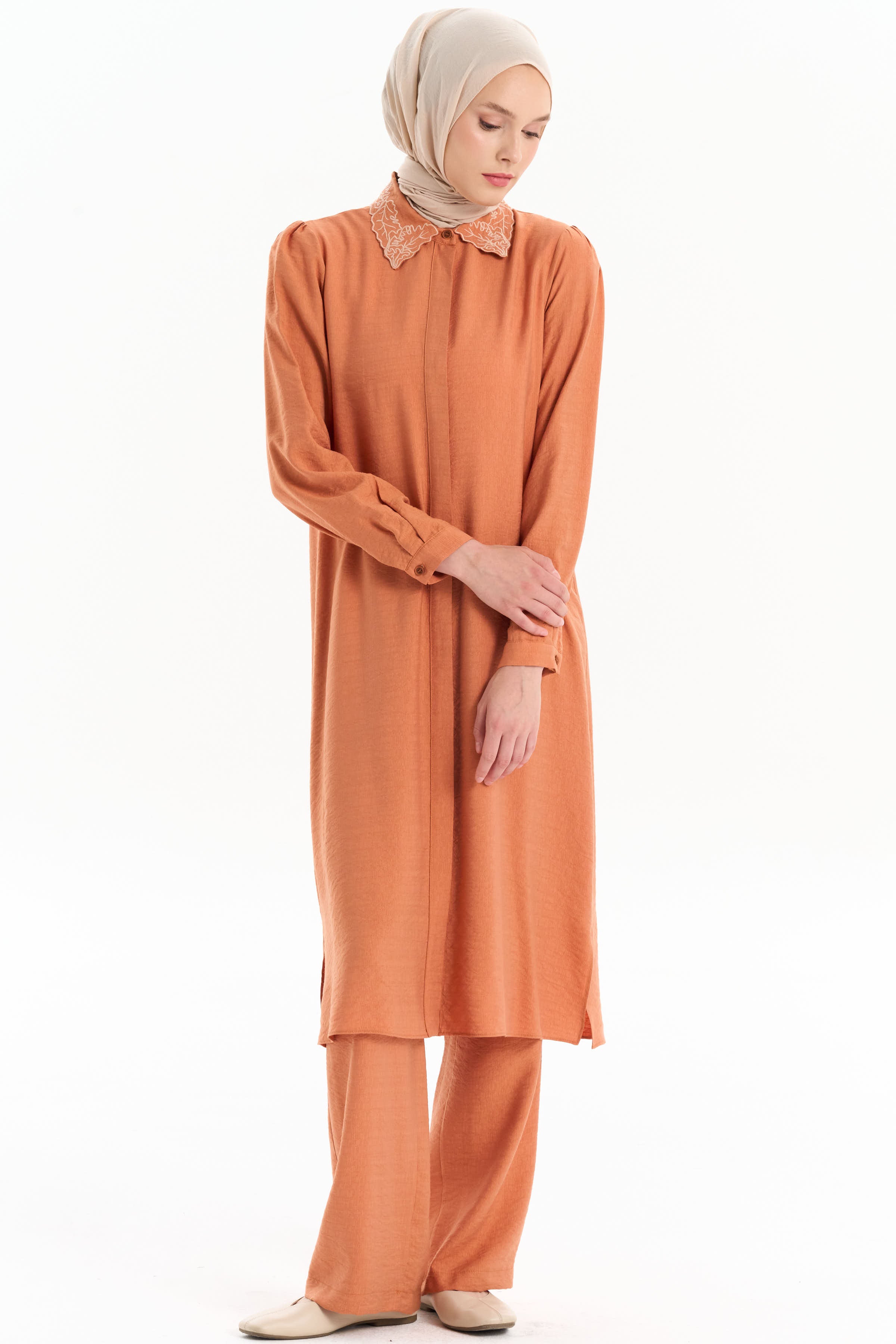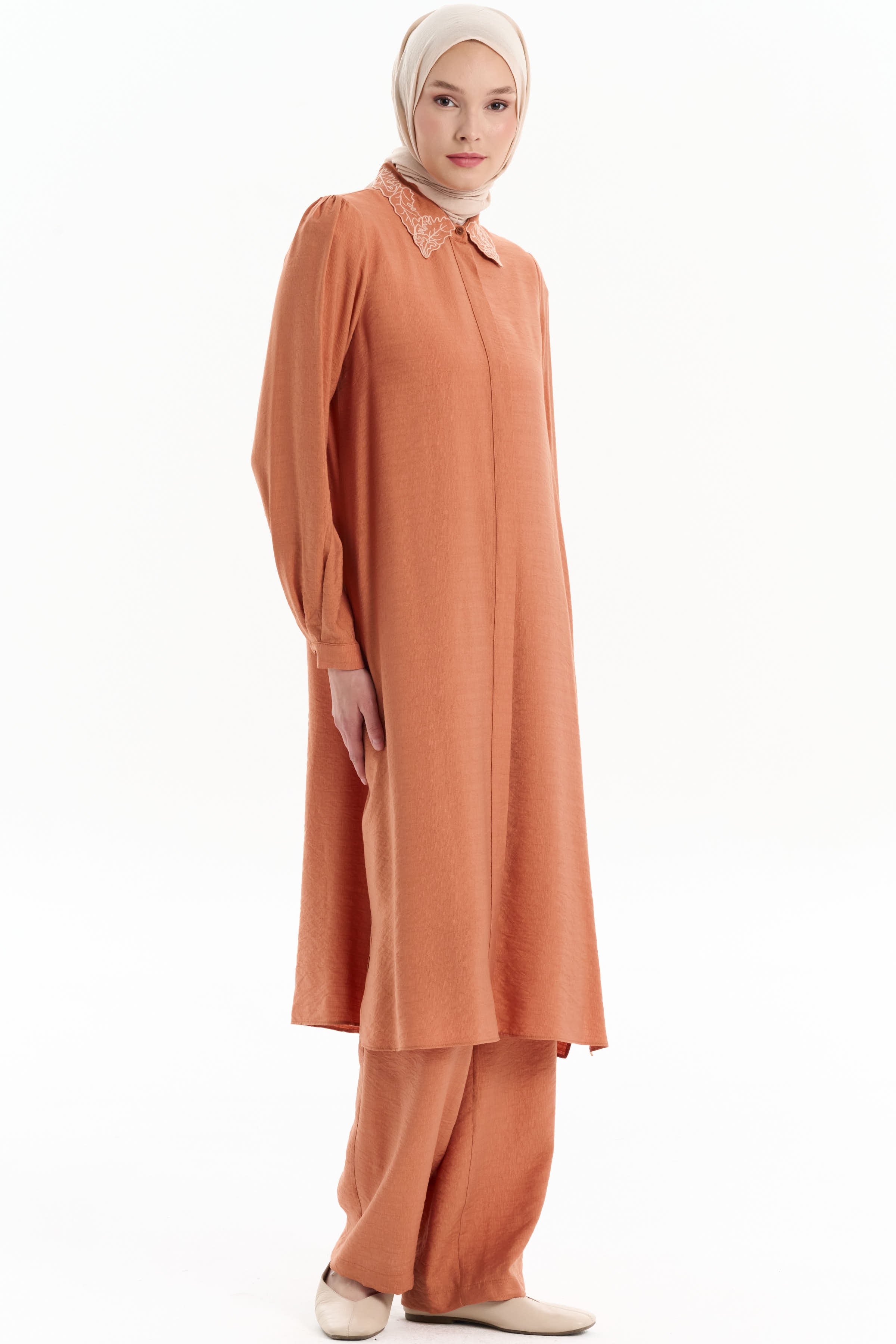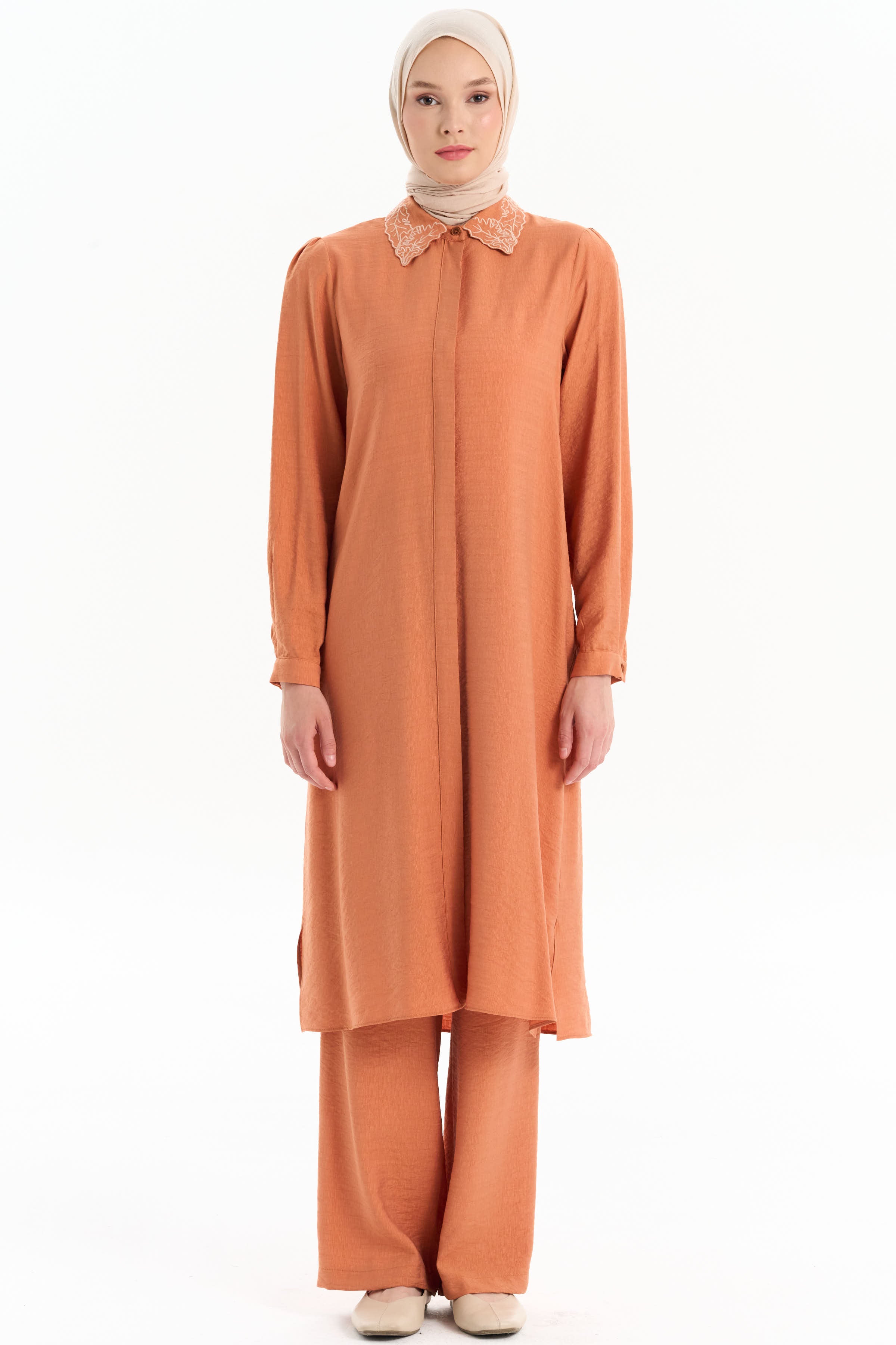 Embroidered Collar Tunic Pant Set - Brick Red