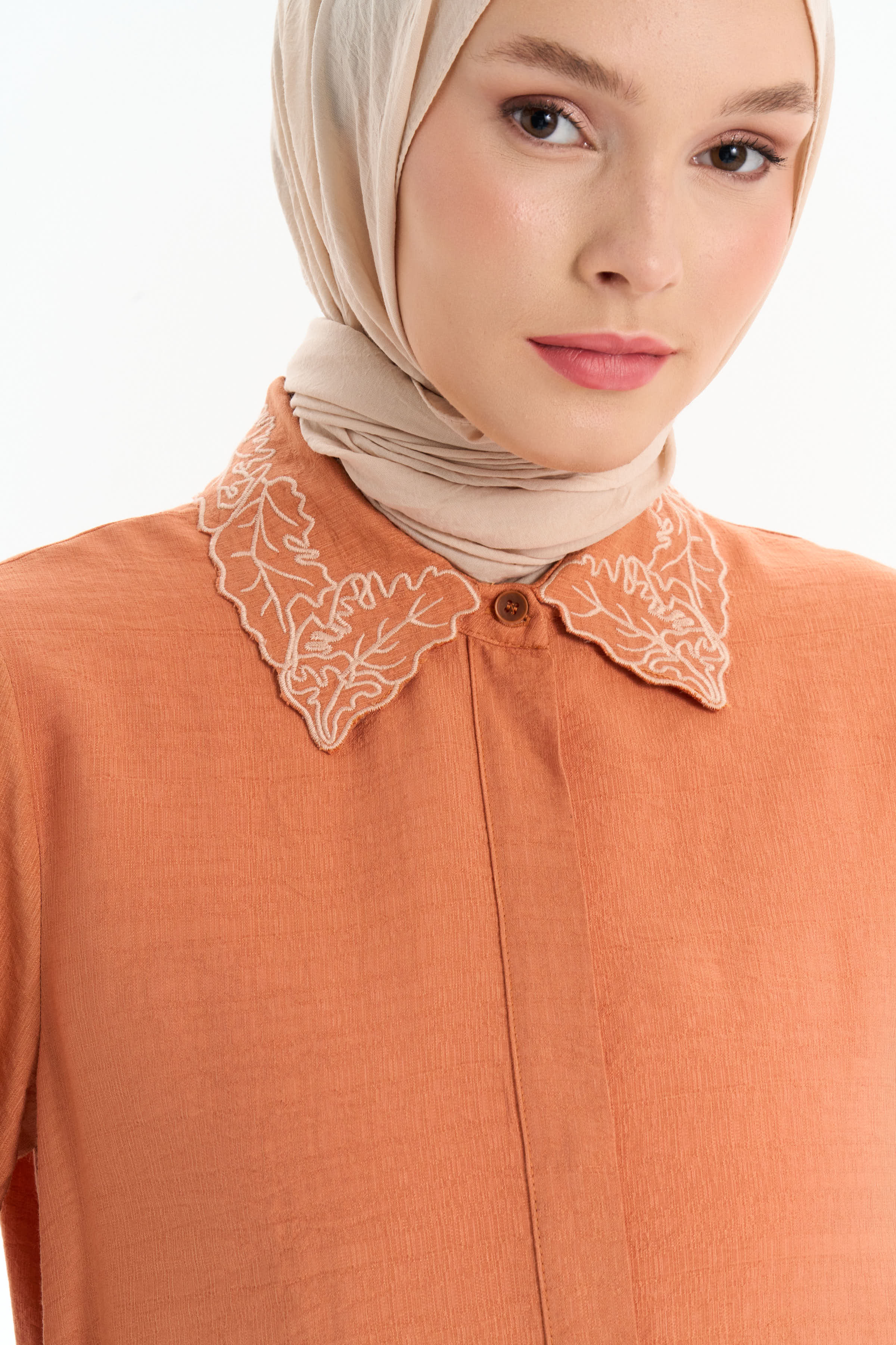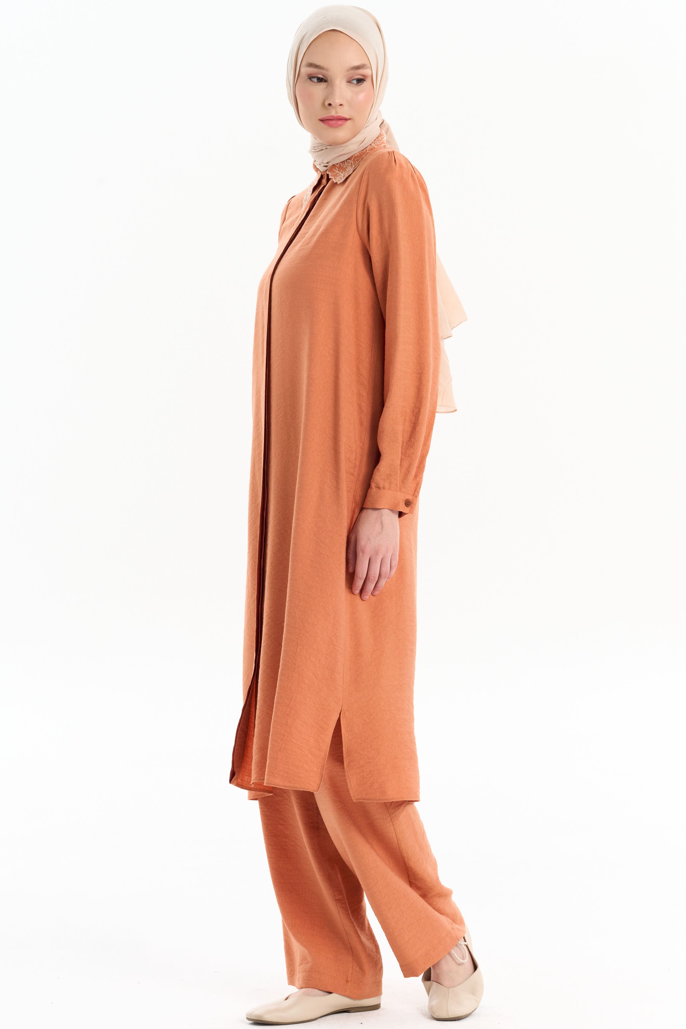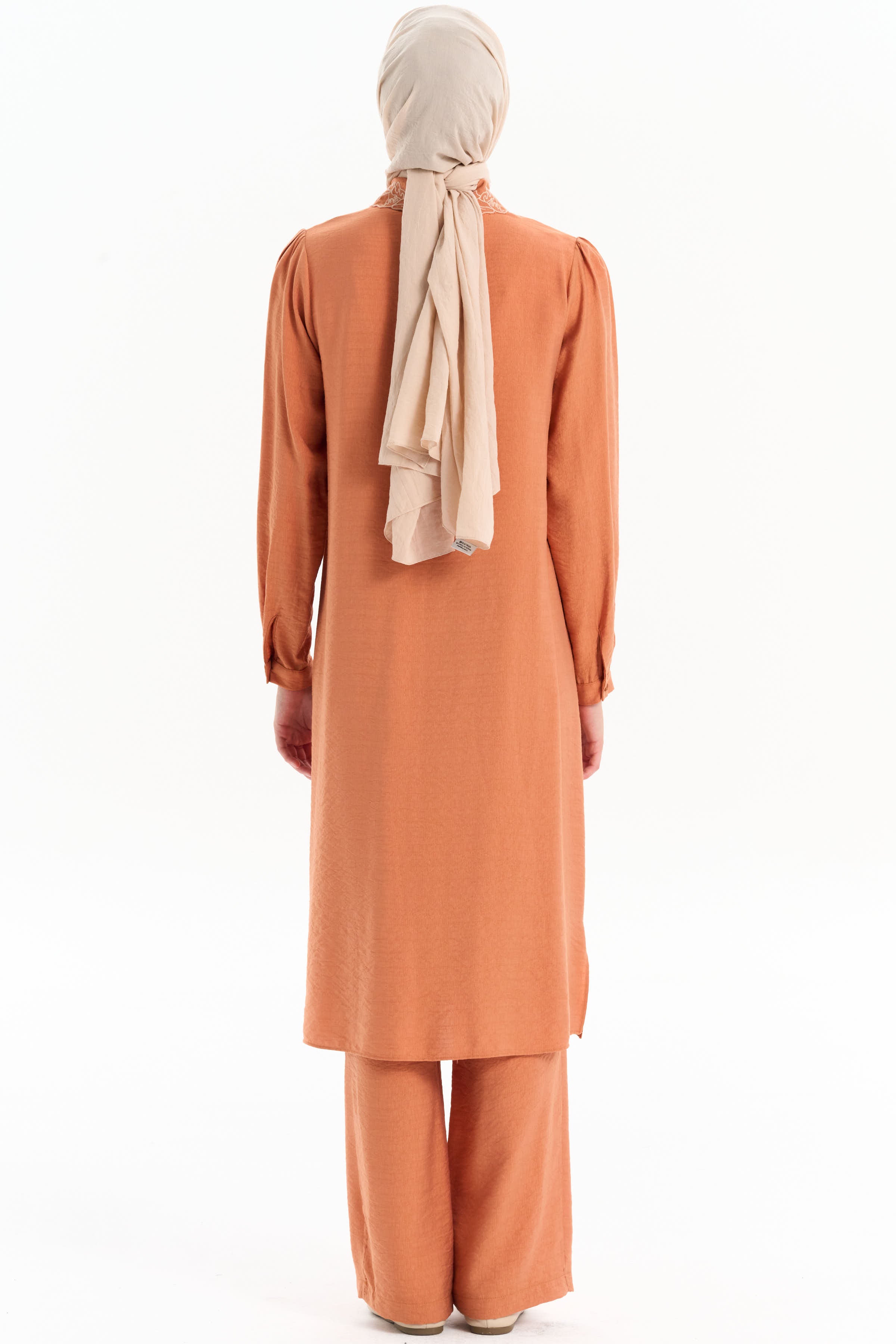 Embroidered Collar Tunic Pant Set - Brick Red