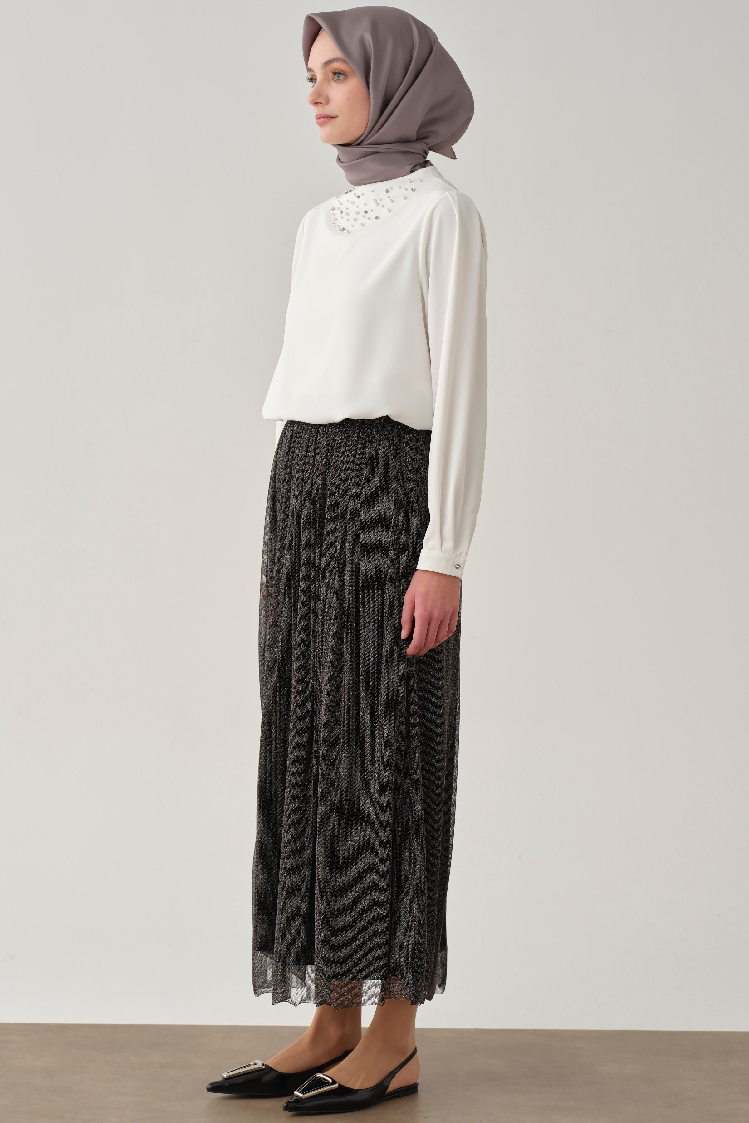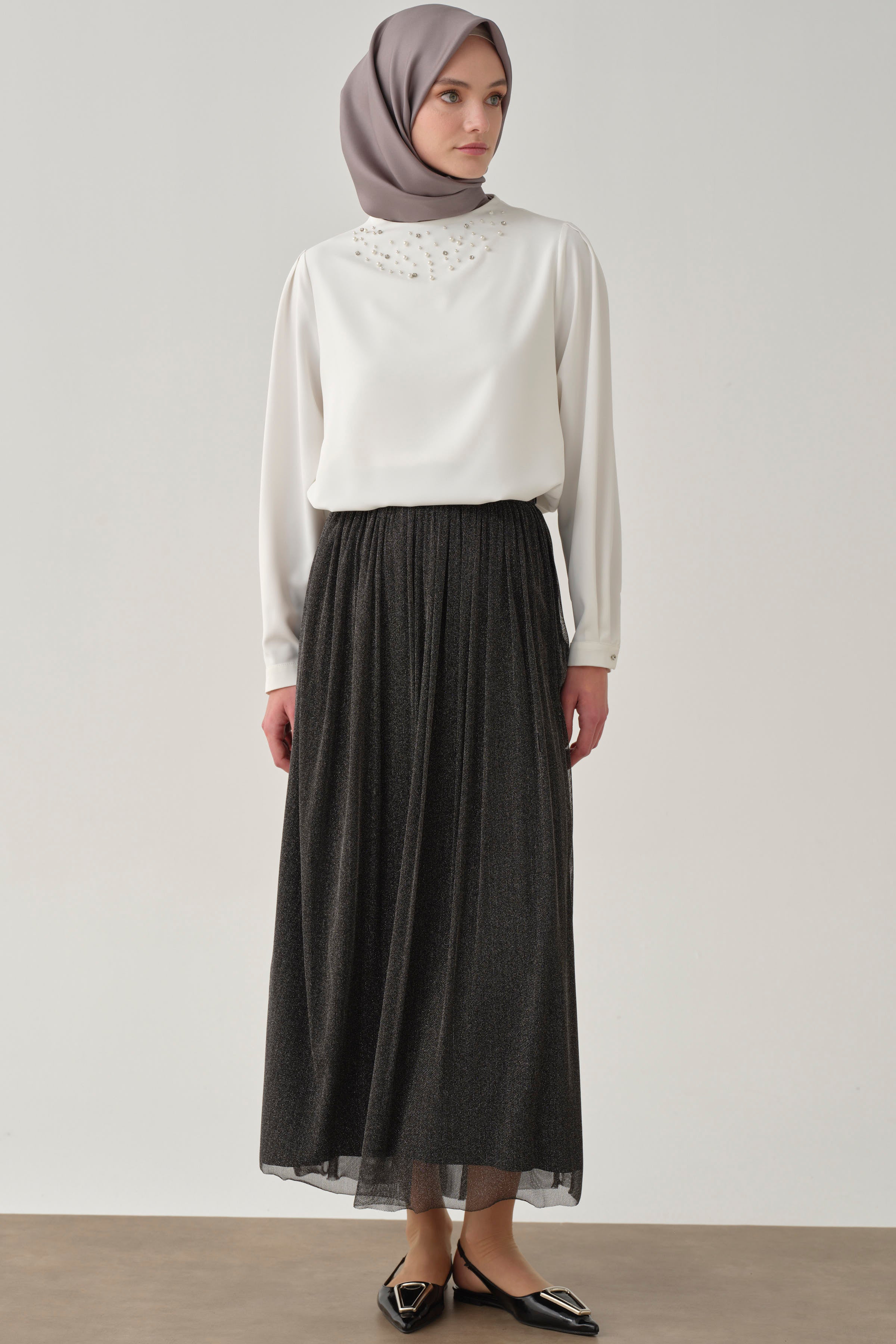 Tulle skirt with gathers and sequins - Anthracite
