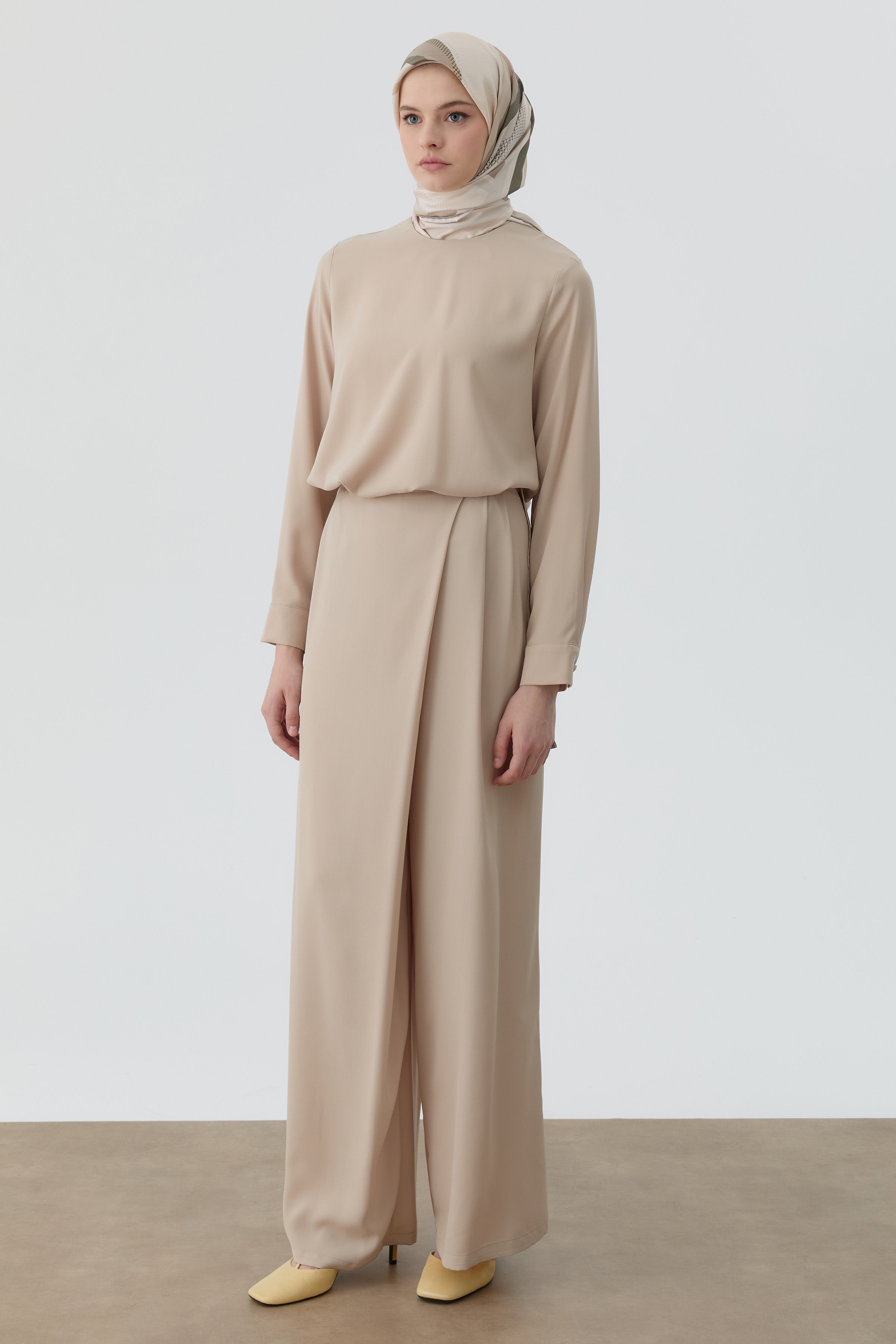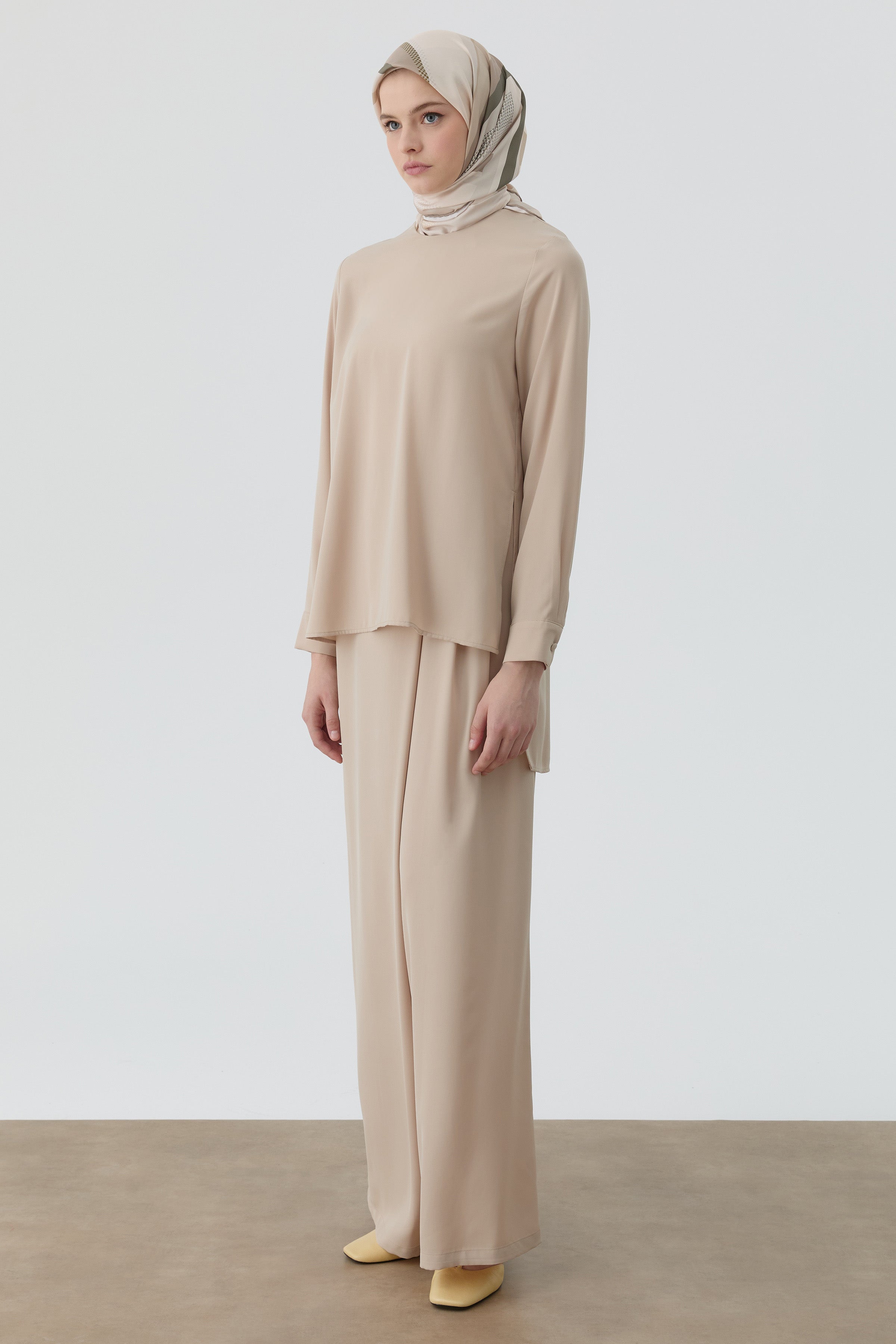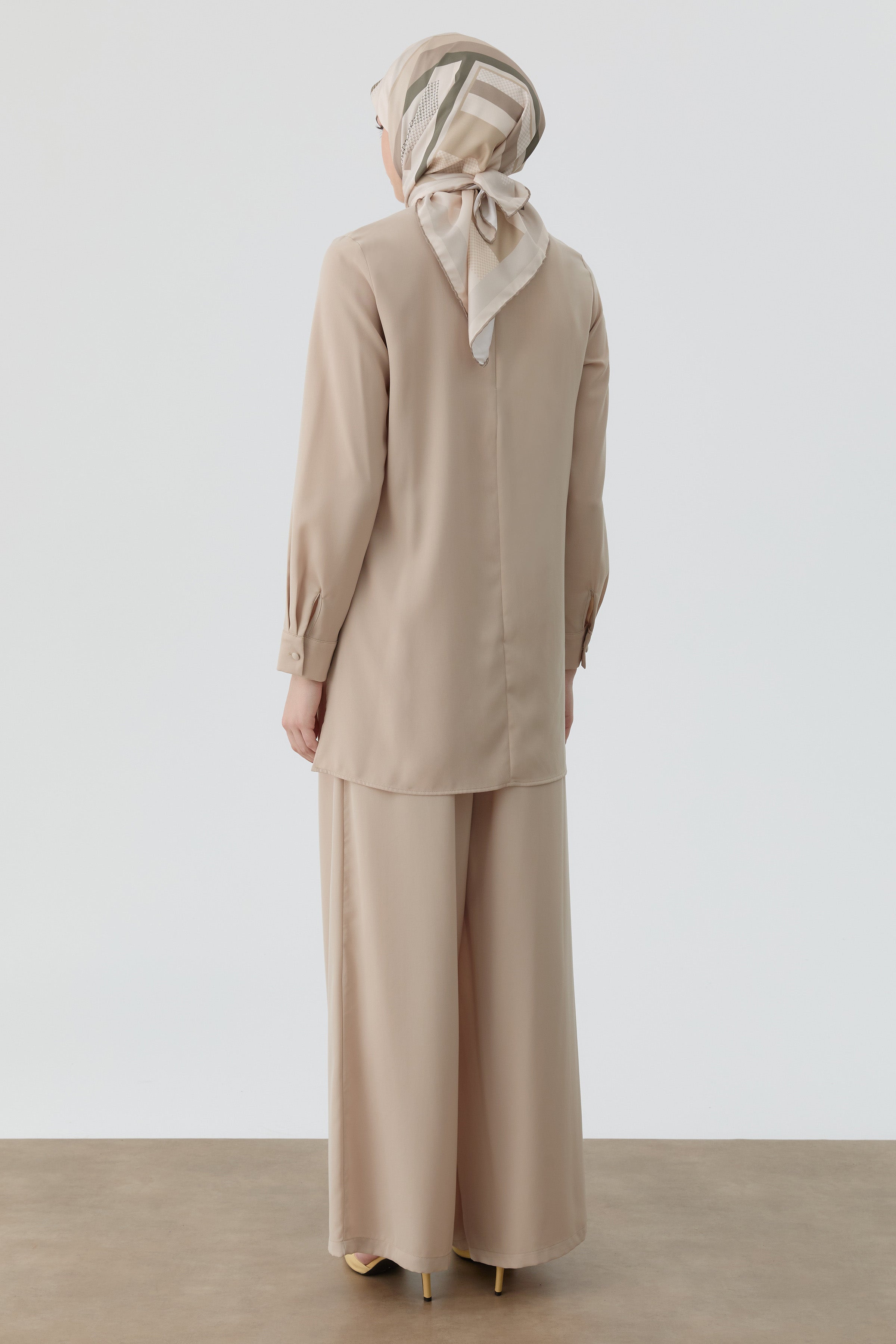 Tunic with pleated collar and sleeves, decorated with a brooch - Beige
