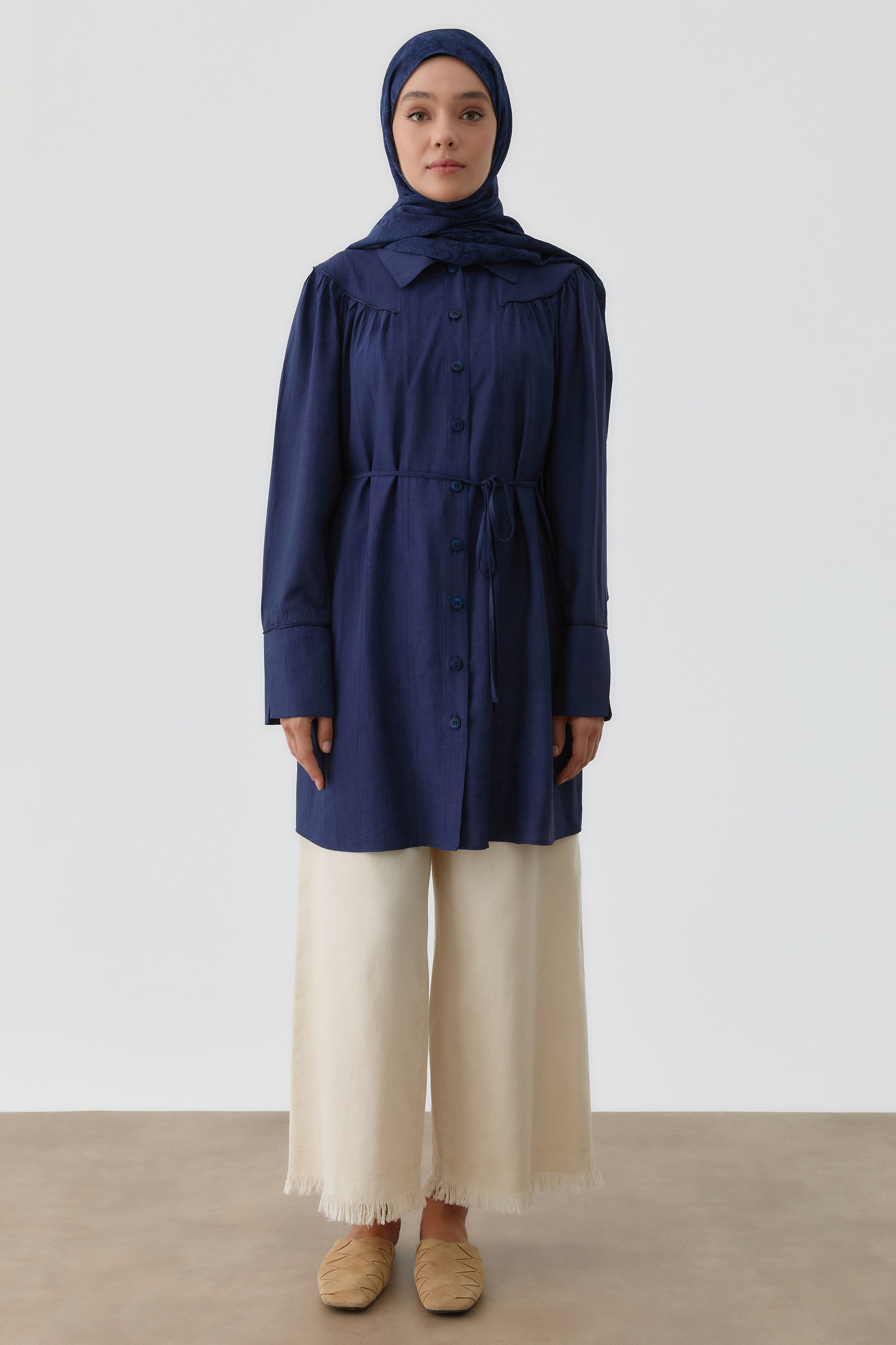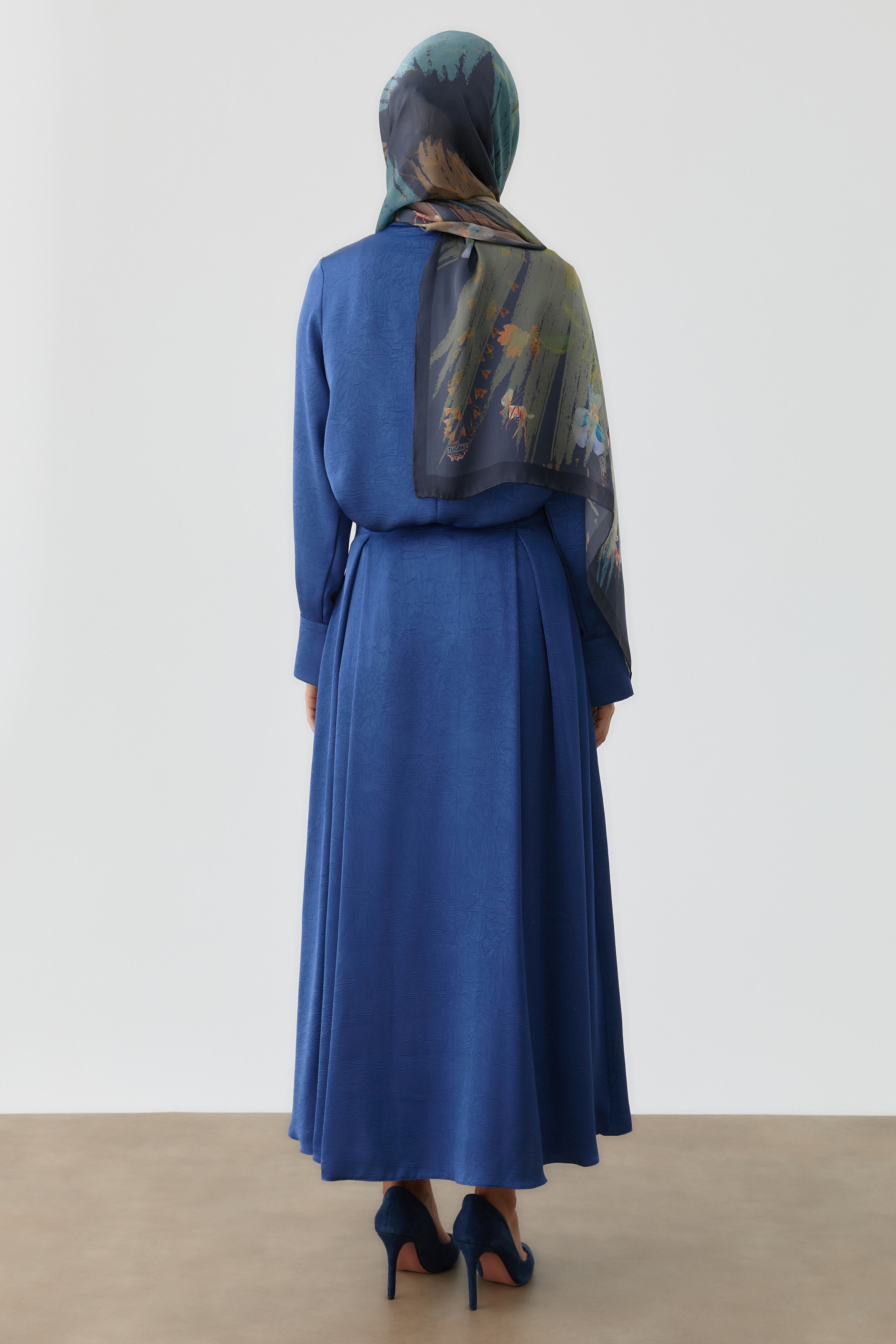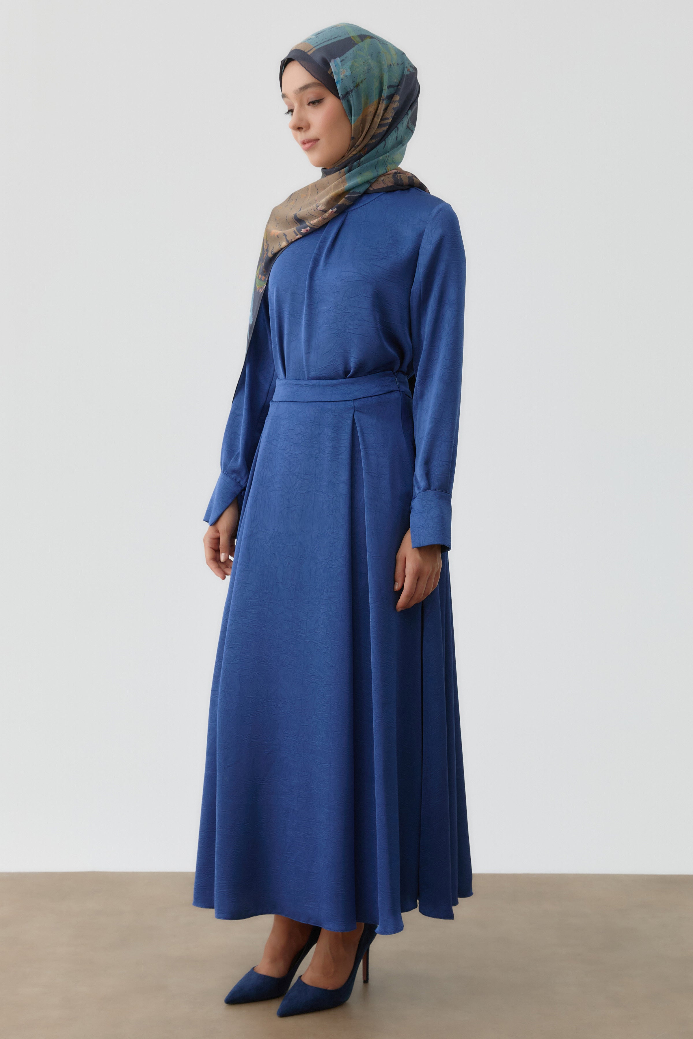 Jacquard pinafore dress with V-neck and belt - Indigo