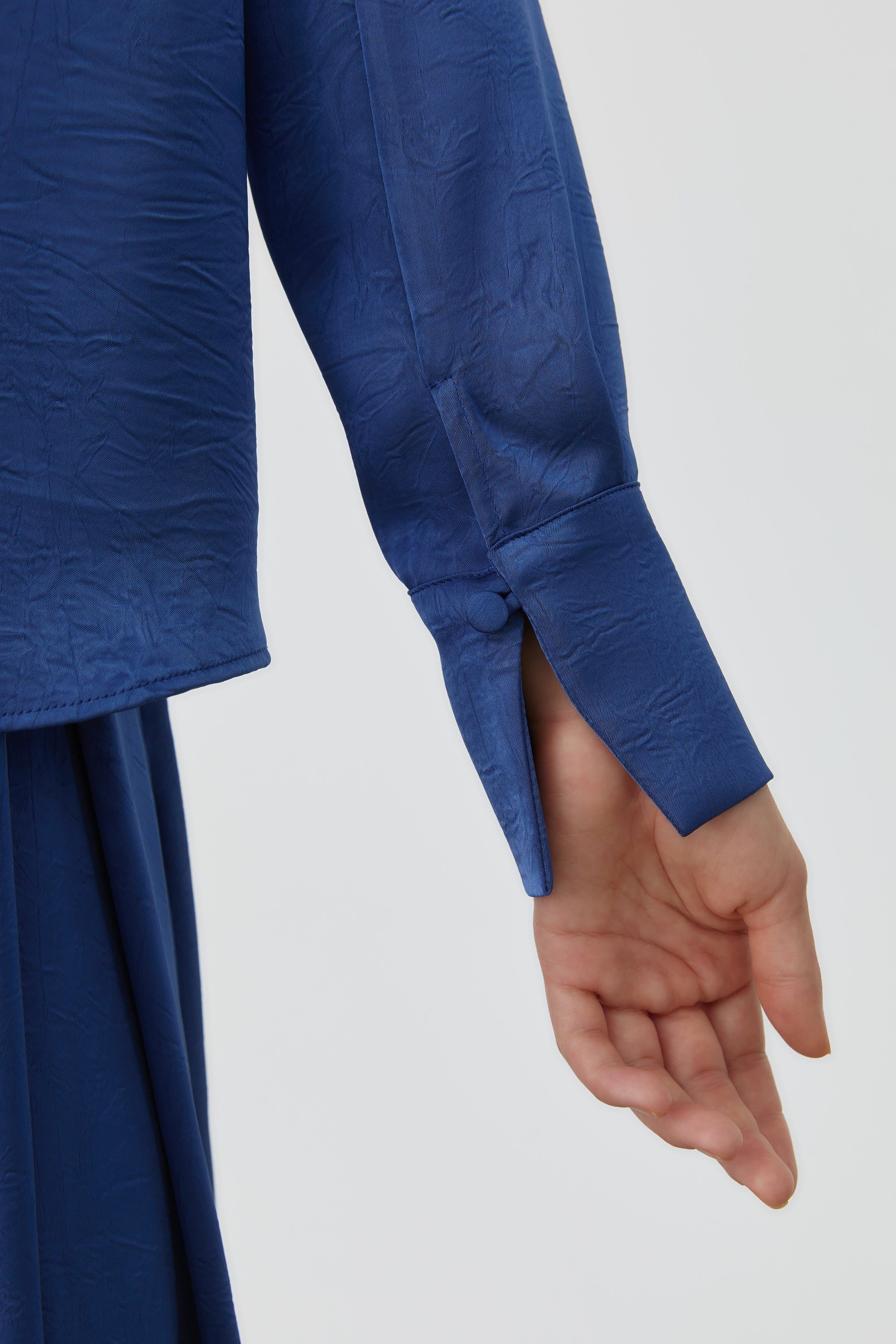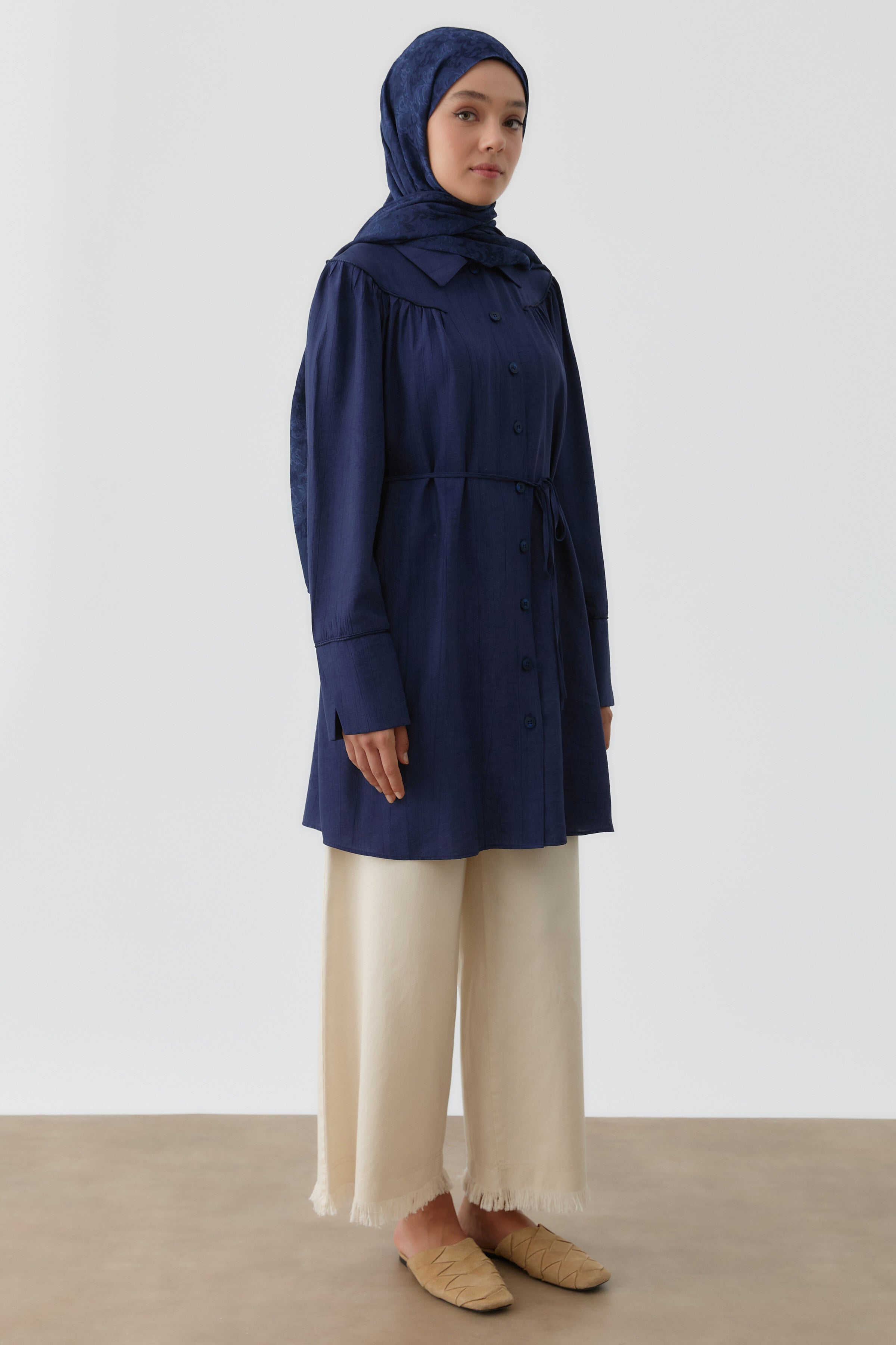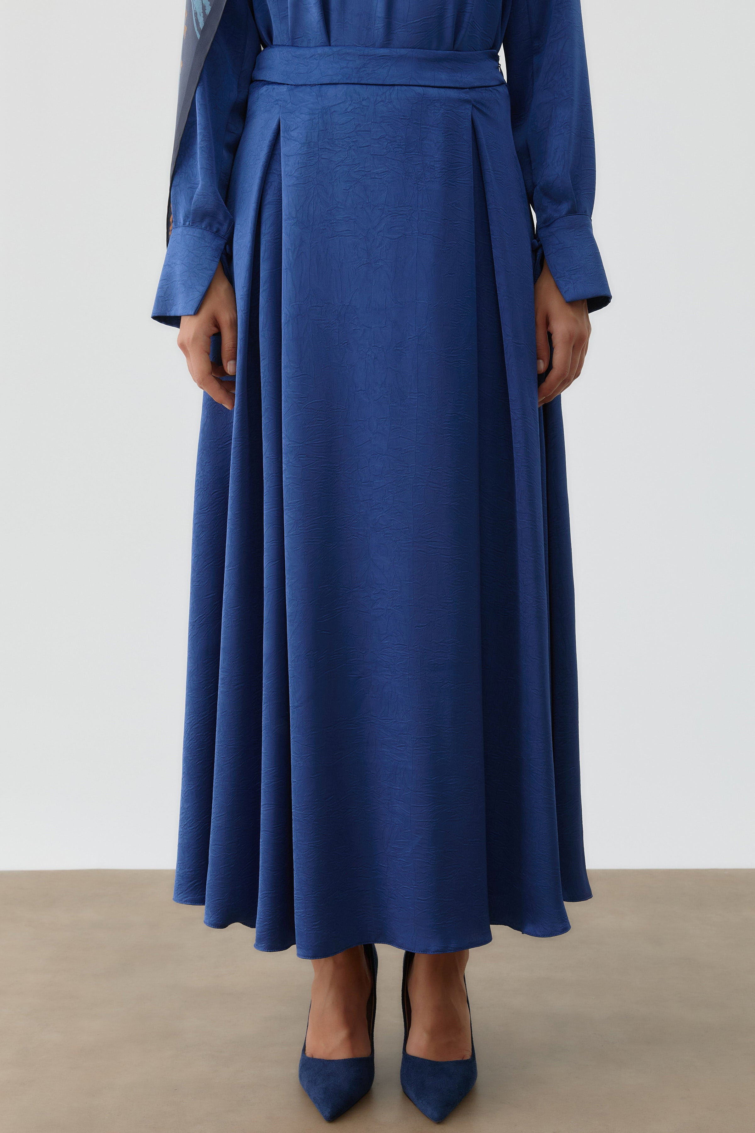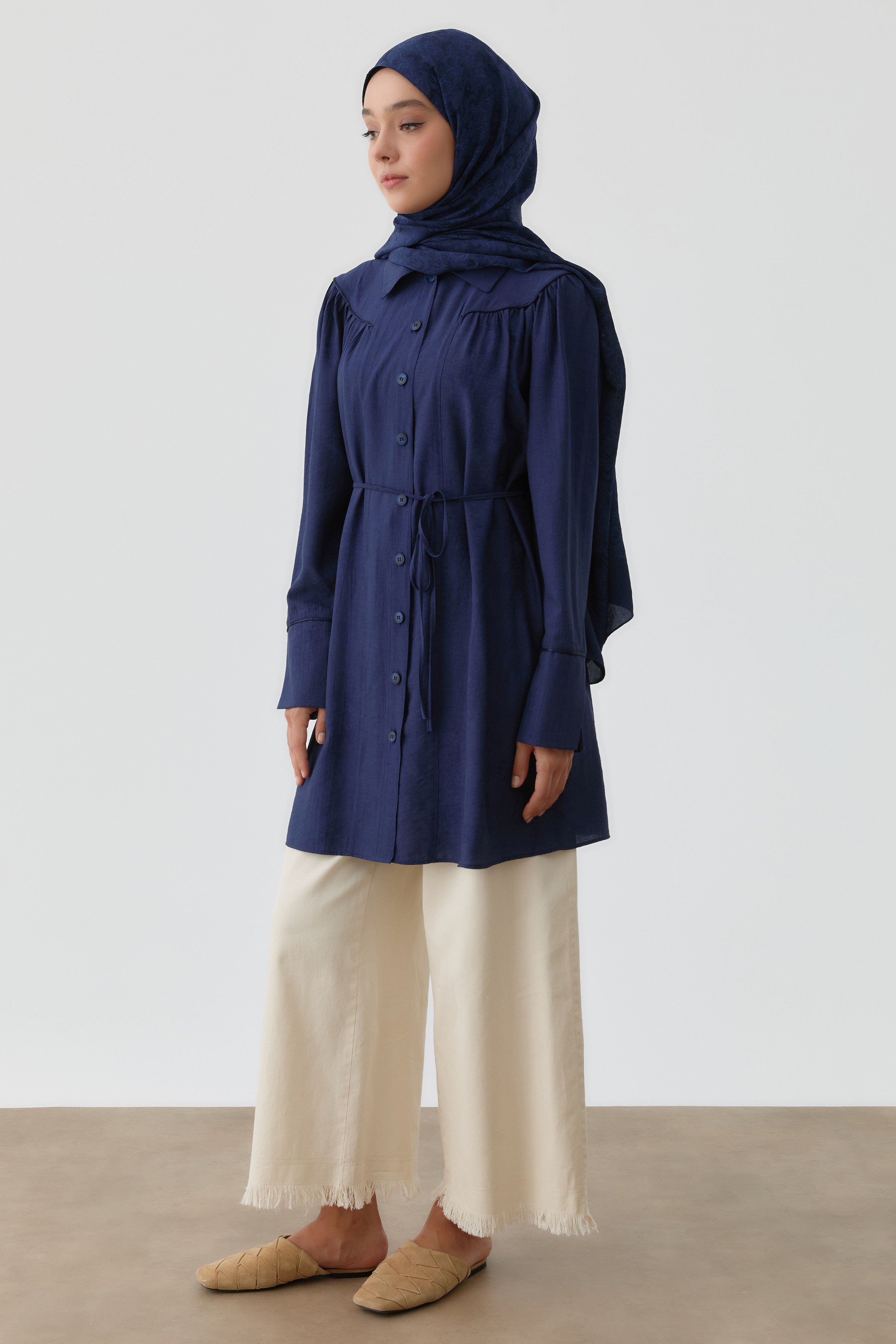 Jacquard pinafore dress with V-neck and belt - Indigo