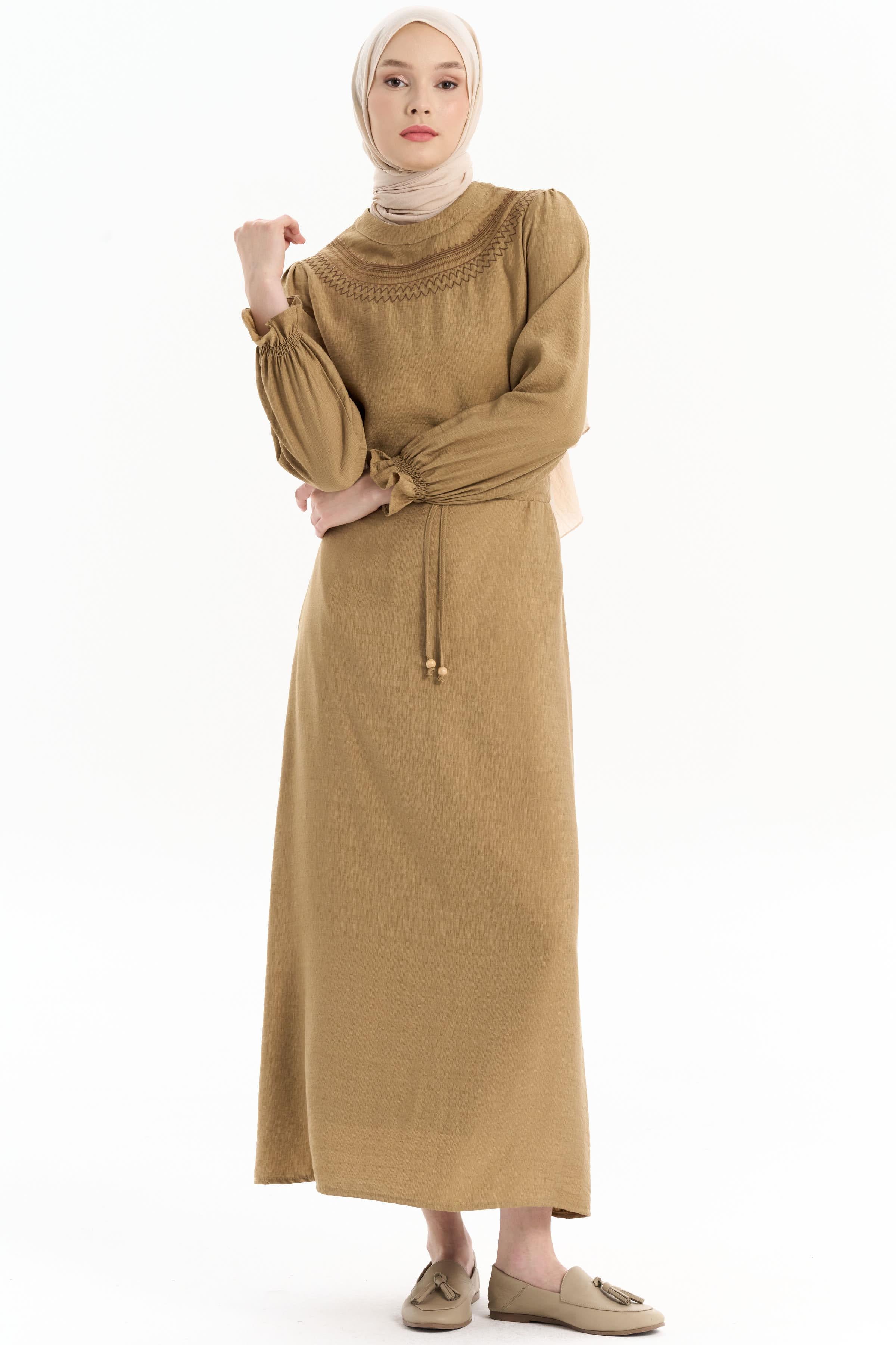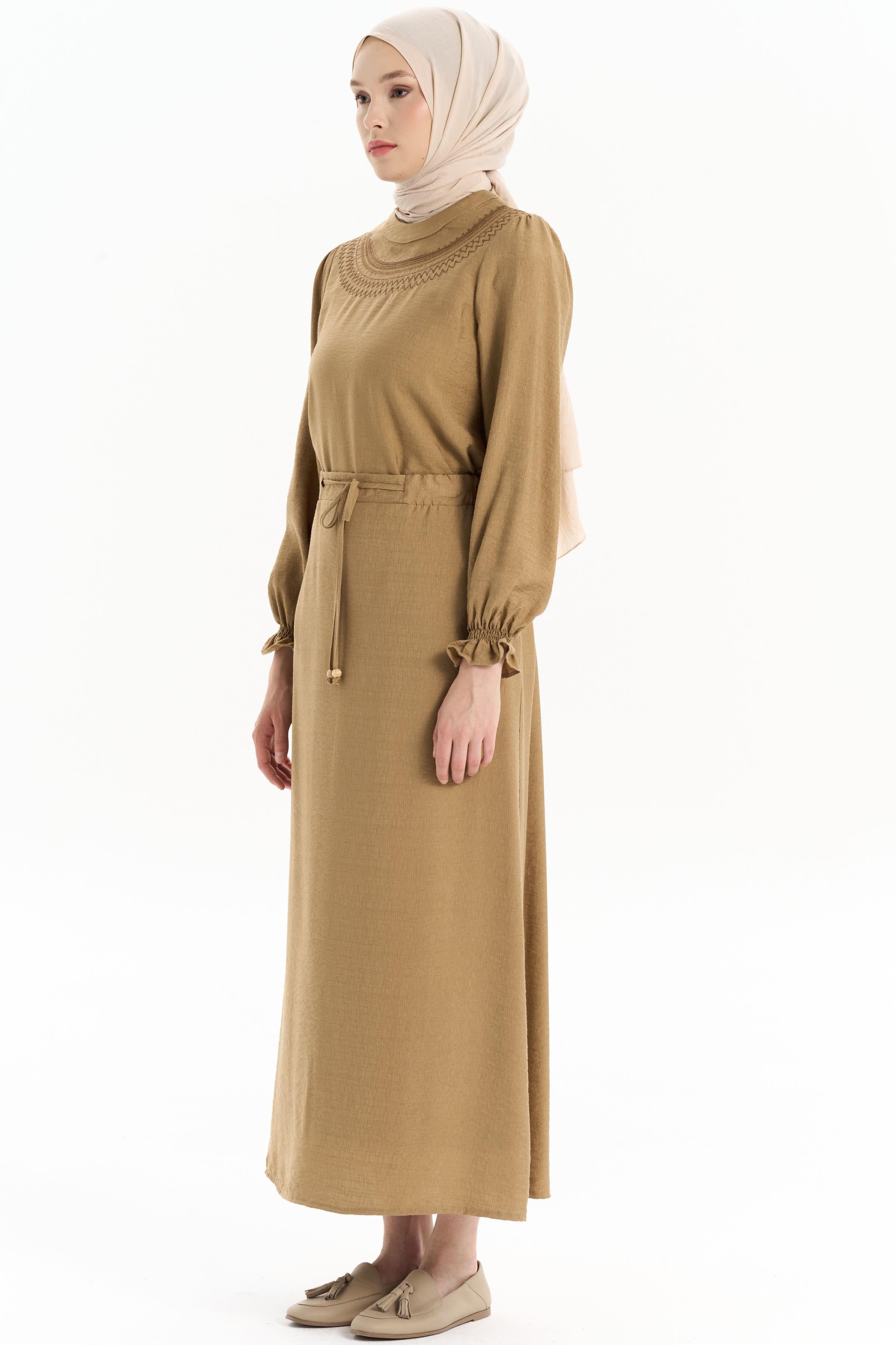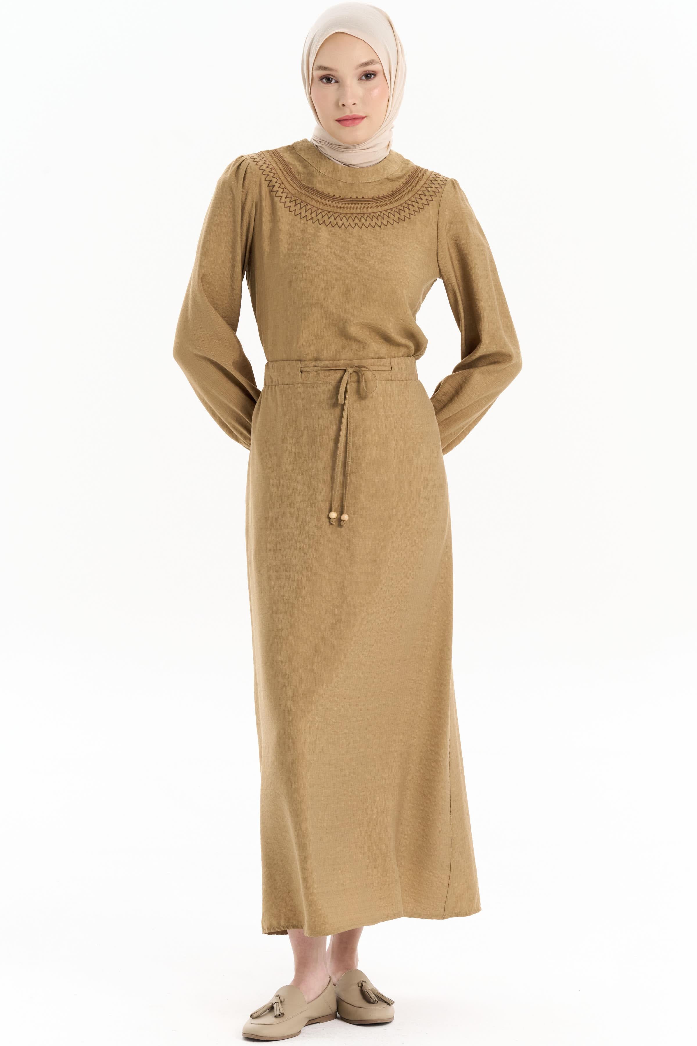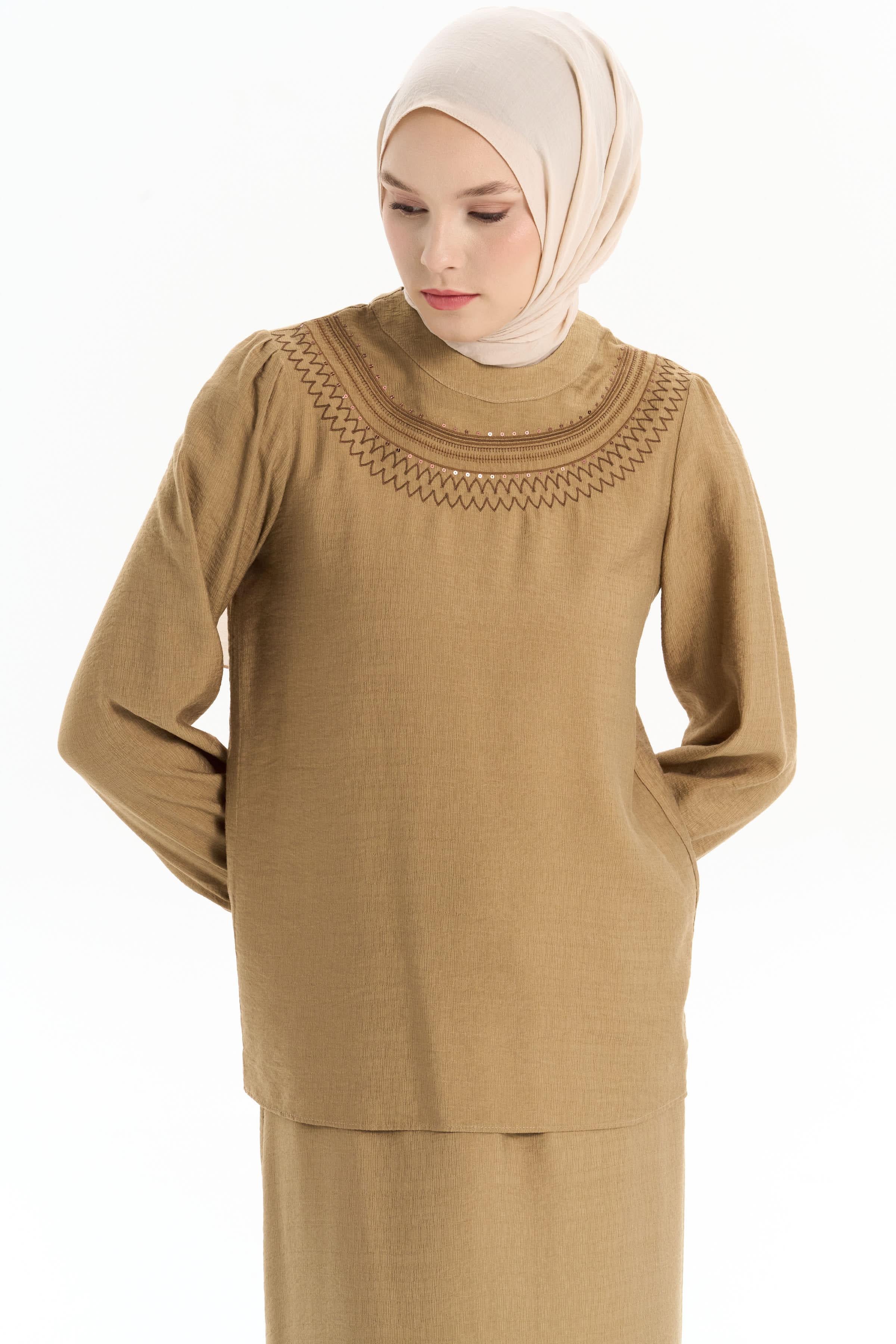 Detailed Blouse Skirt Set with Embroidery - Chamois