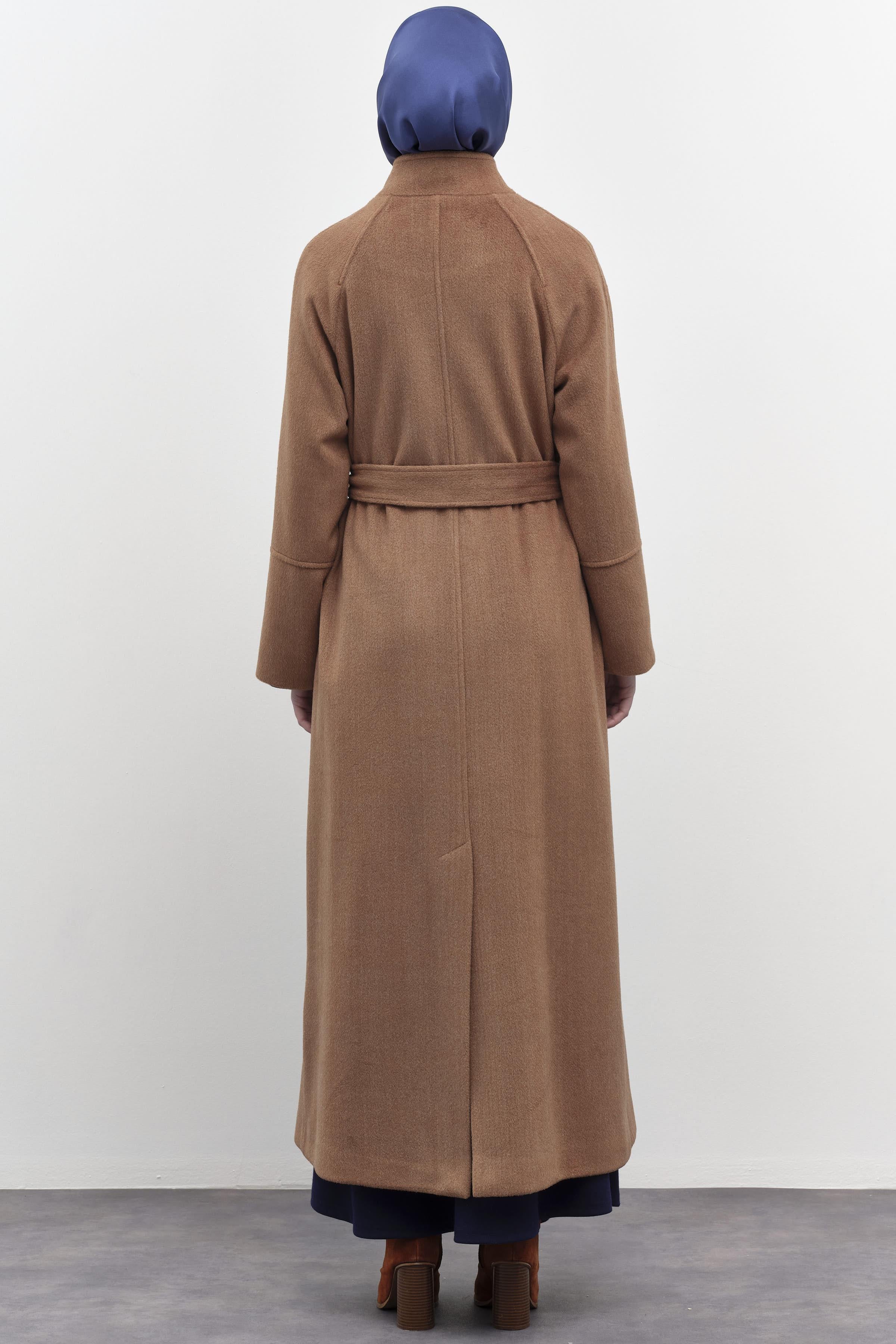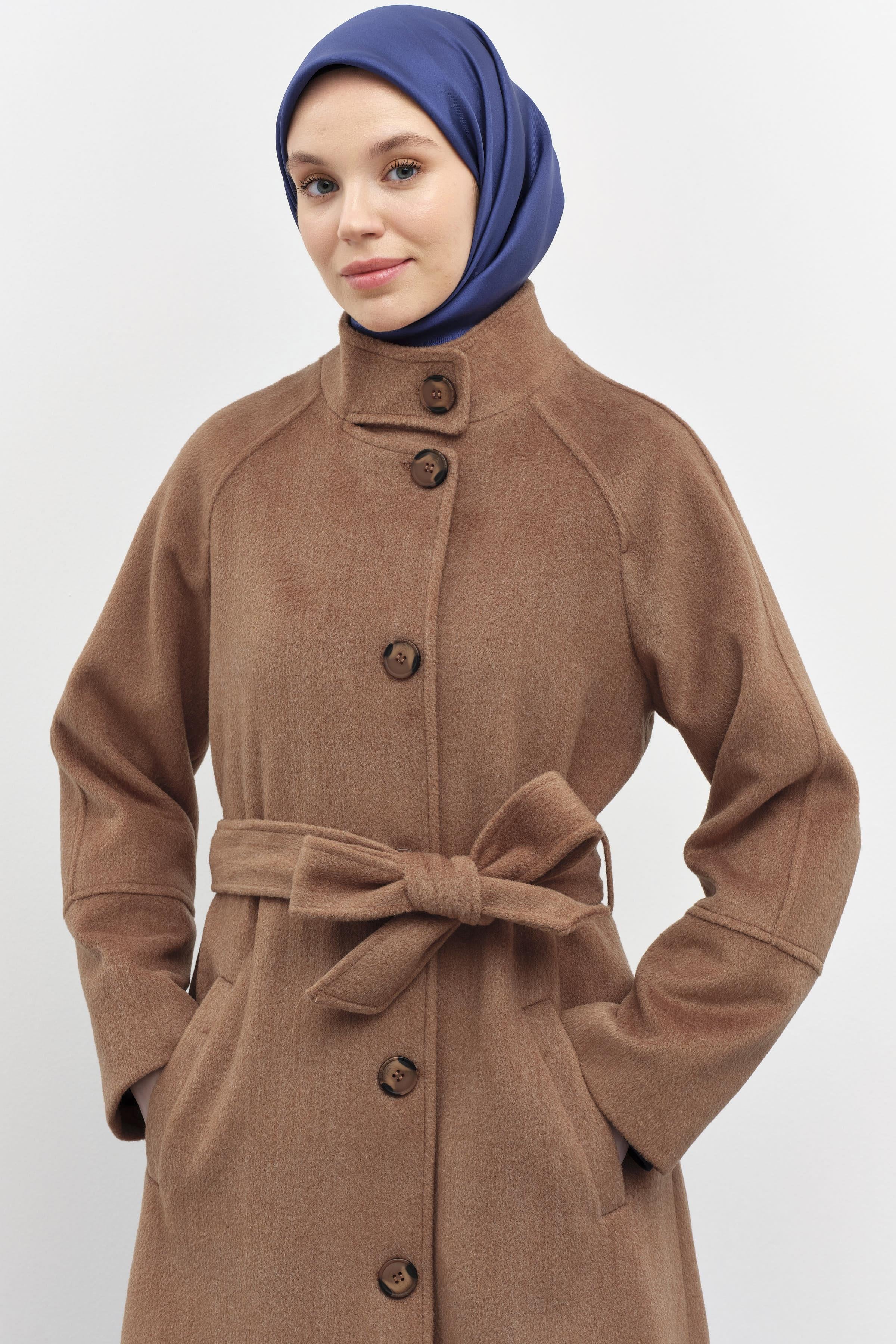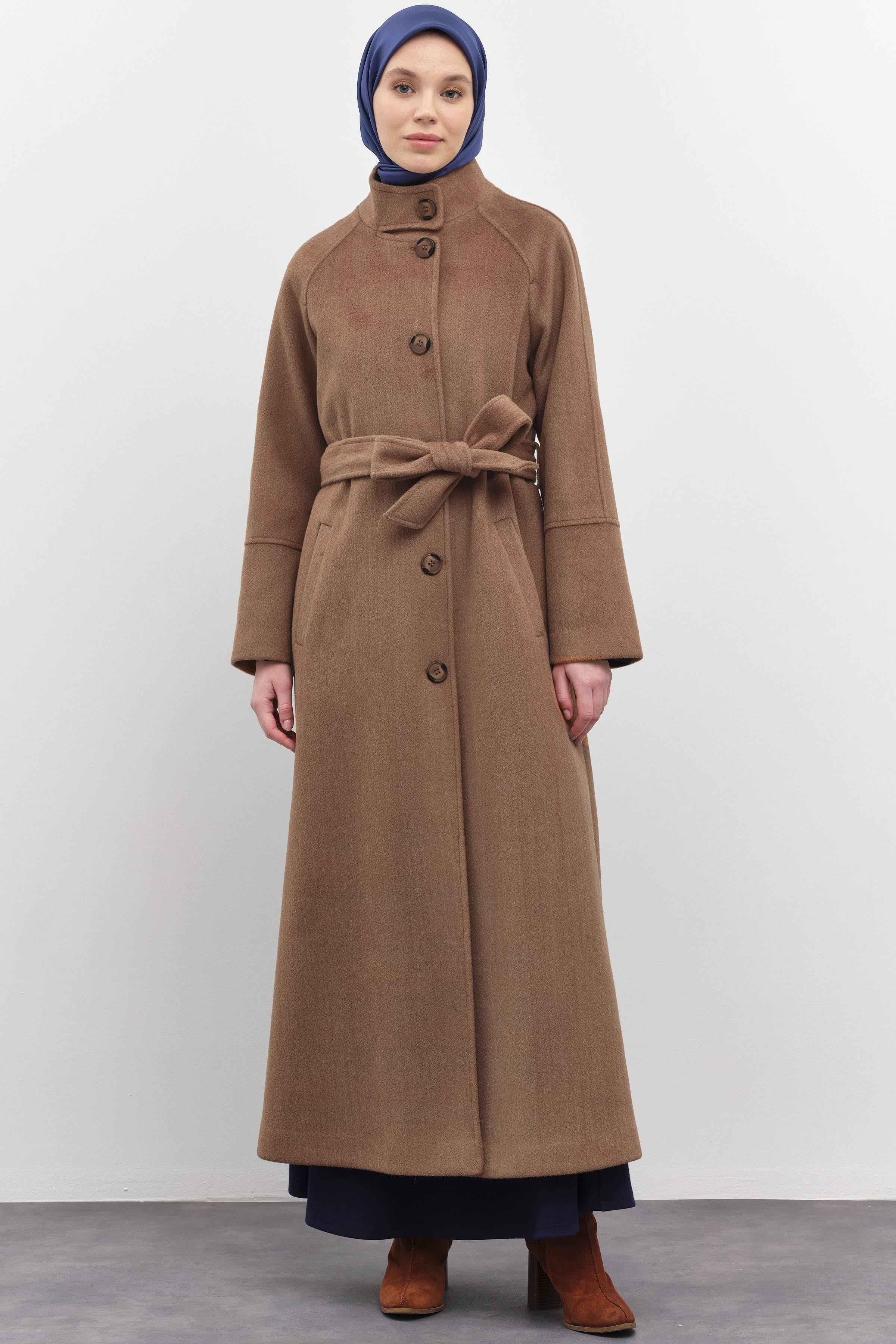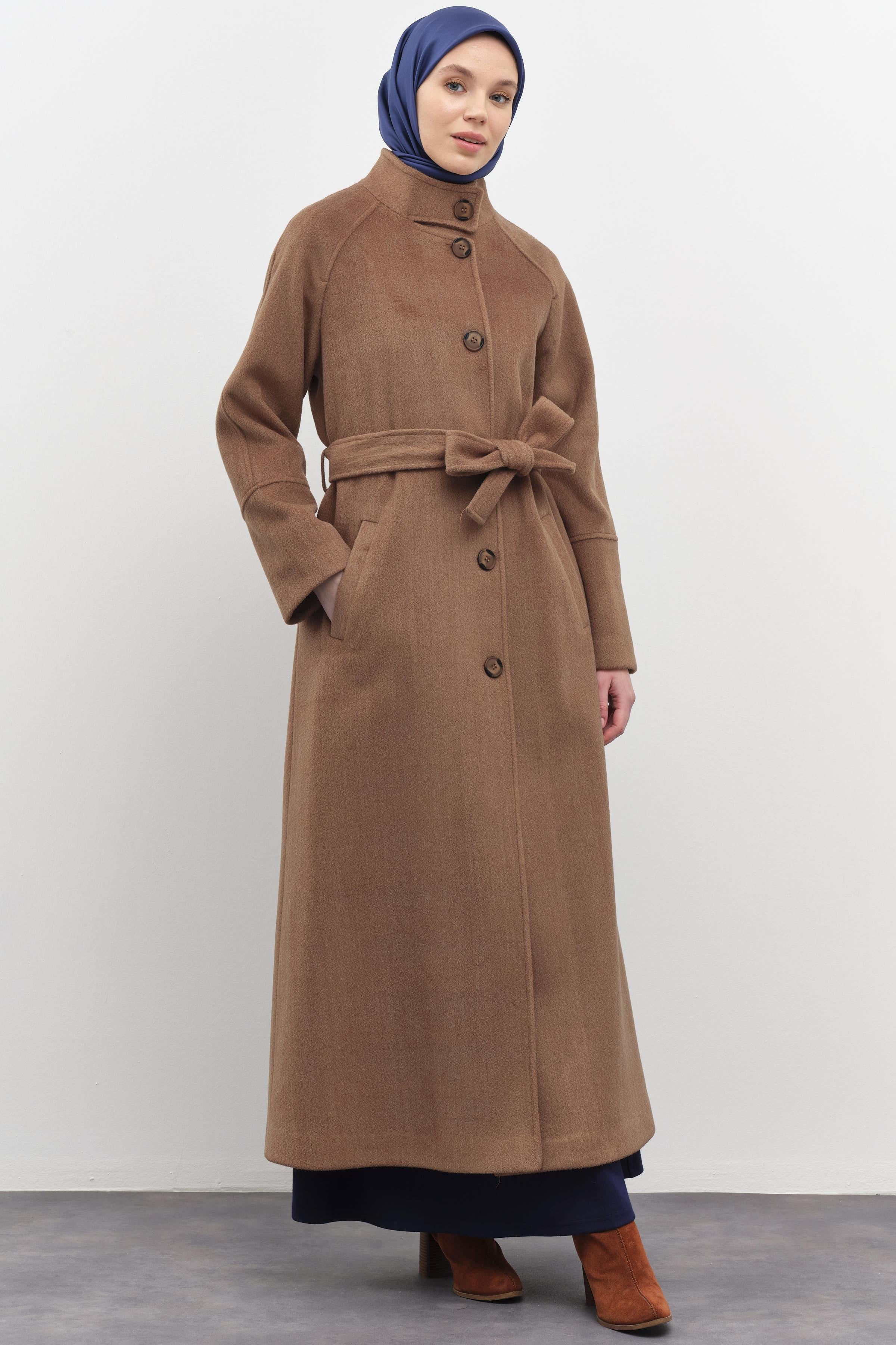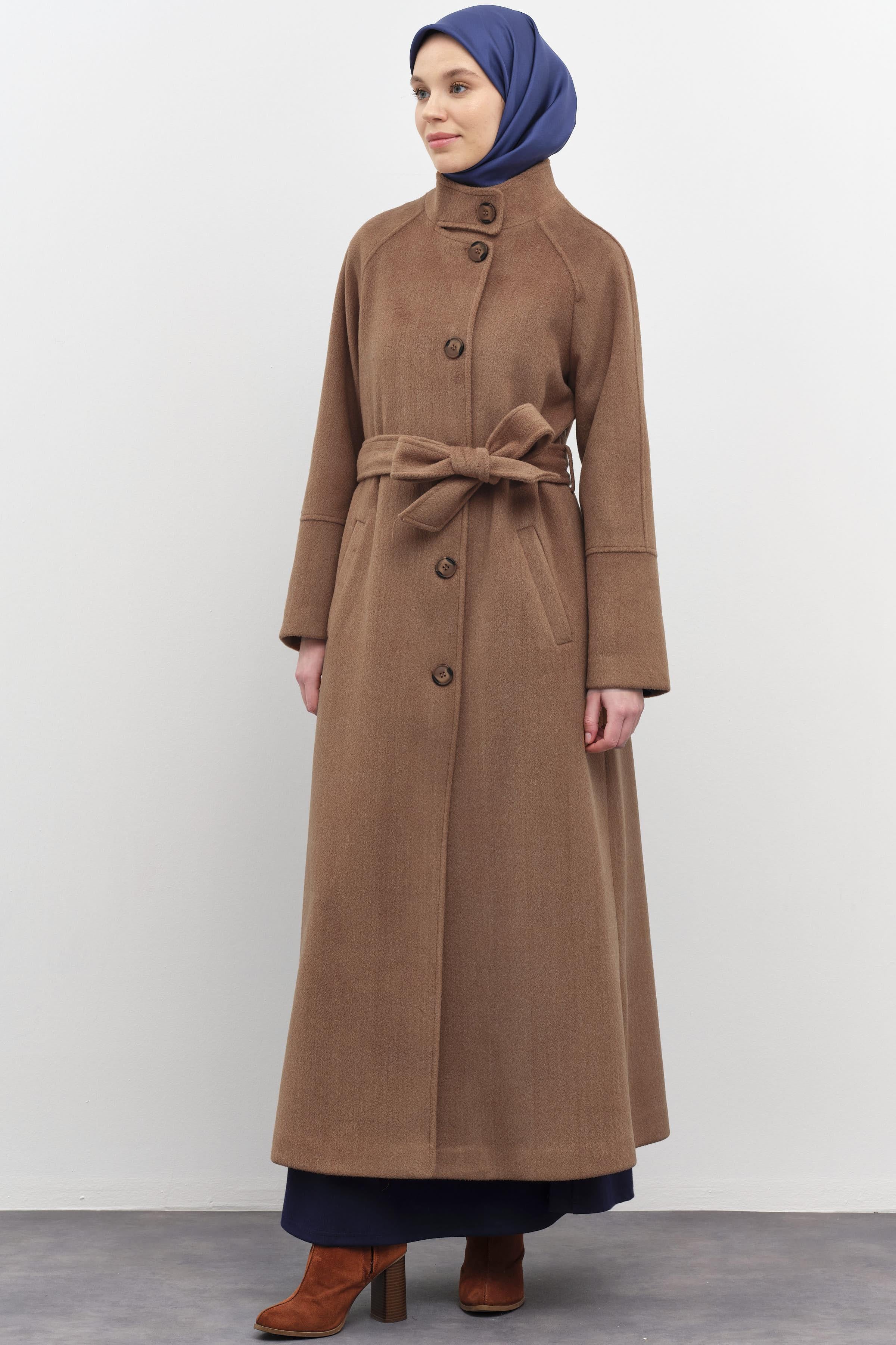 Coat with stand-up collar and belted waist - Cinnamon