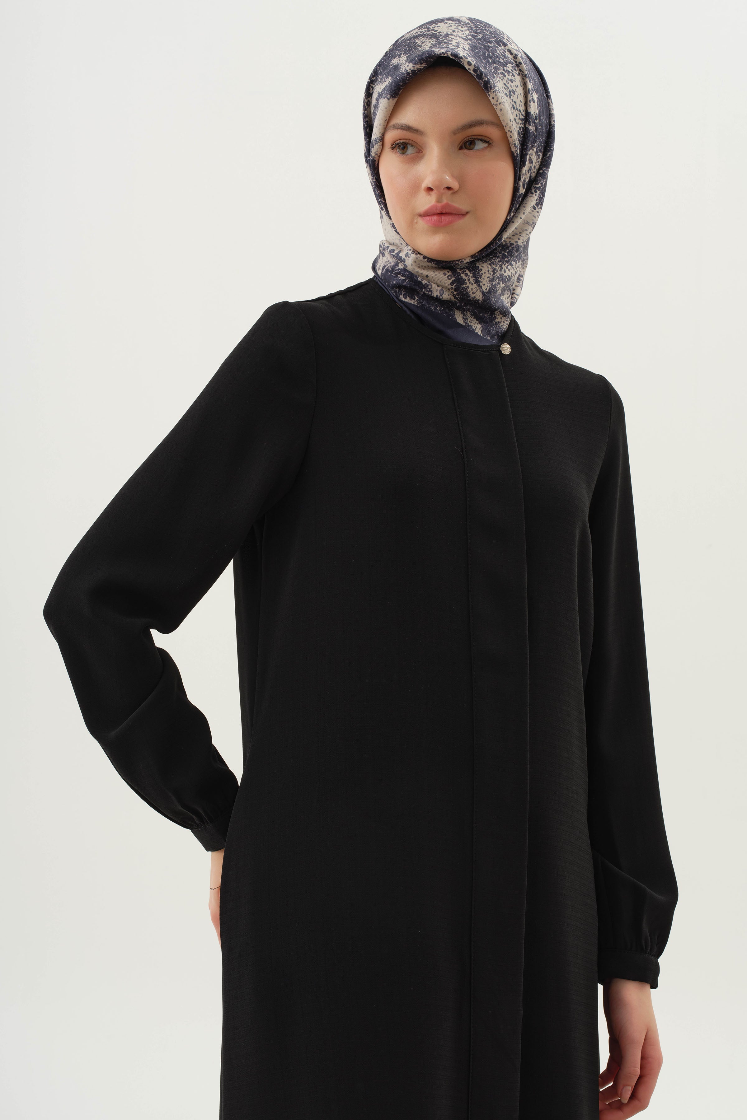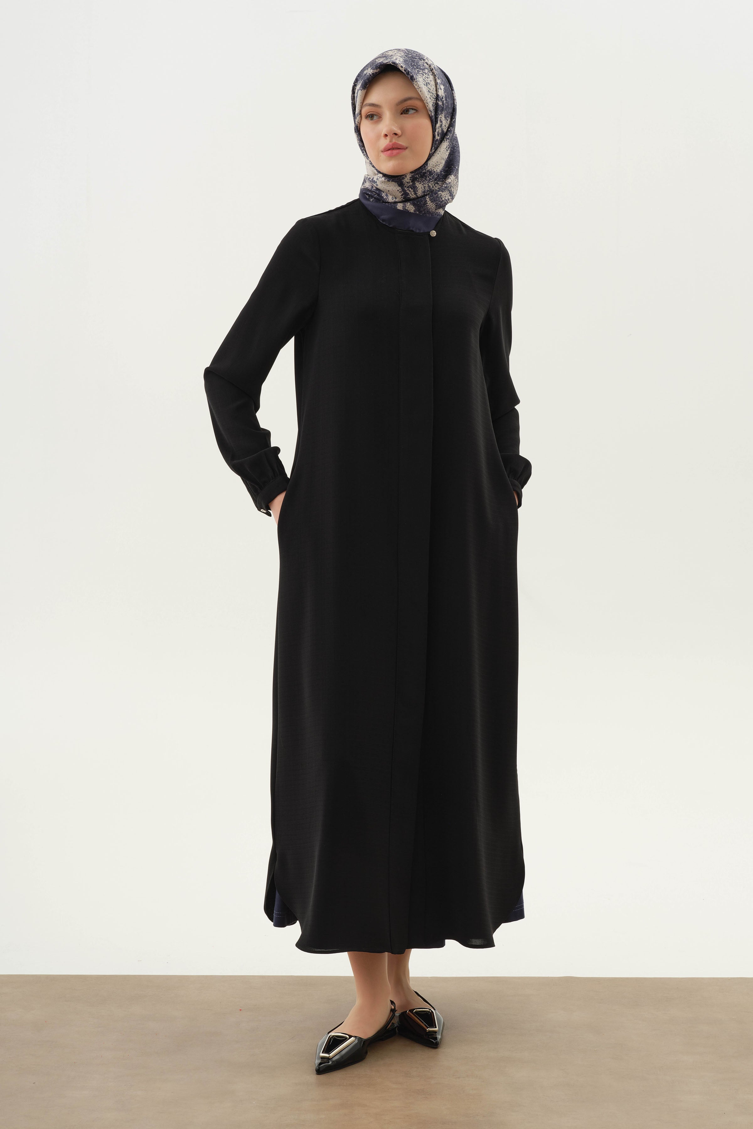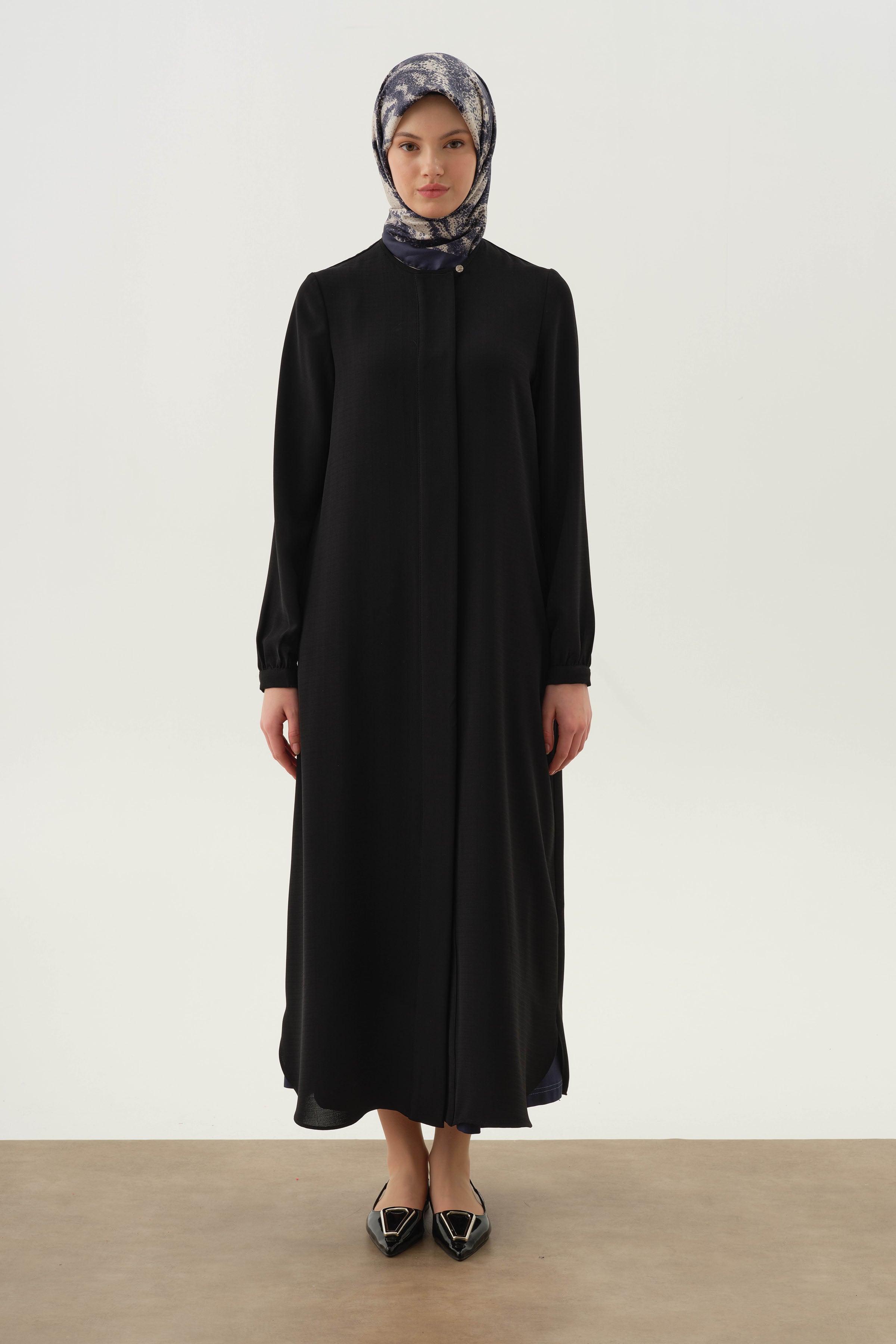 Abaya à col rond avec patte de boutonnage cachée - Noir