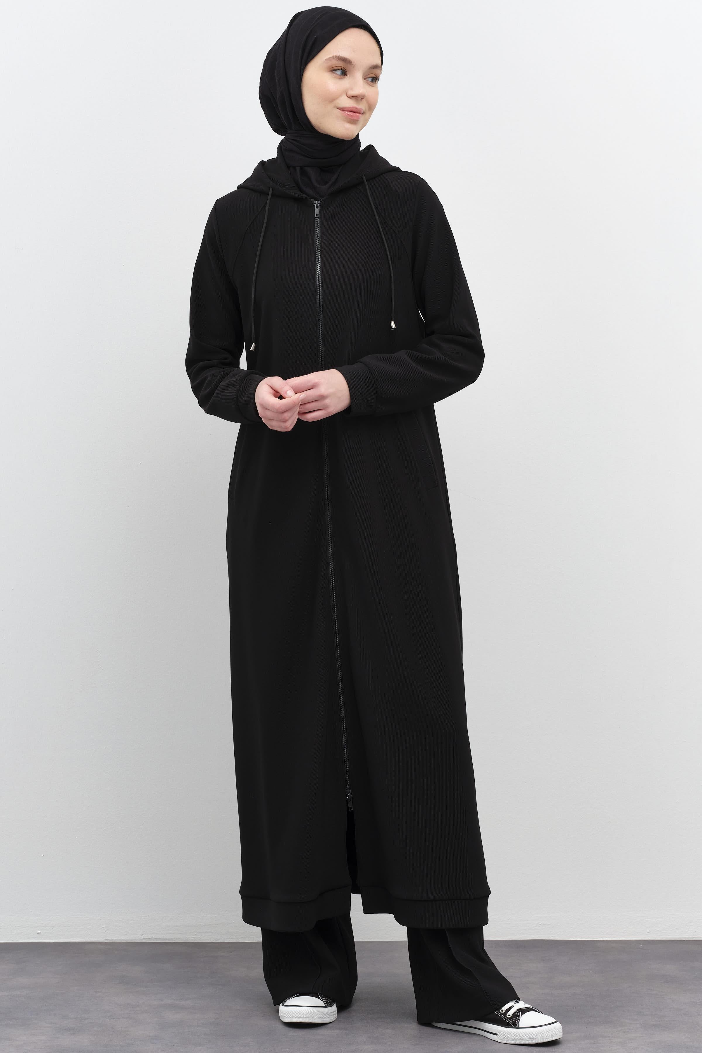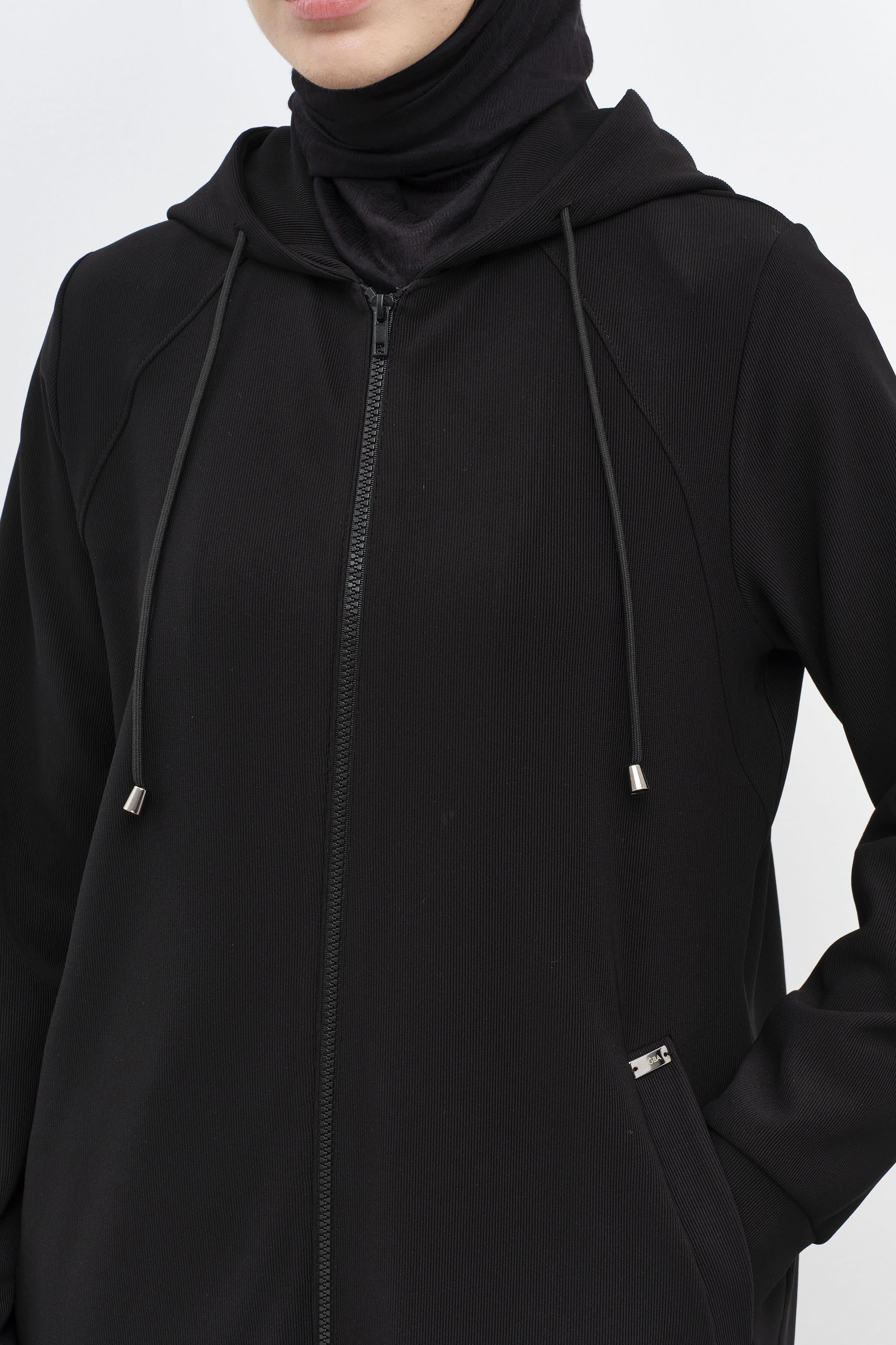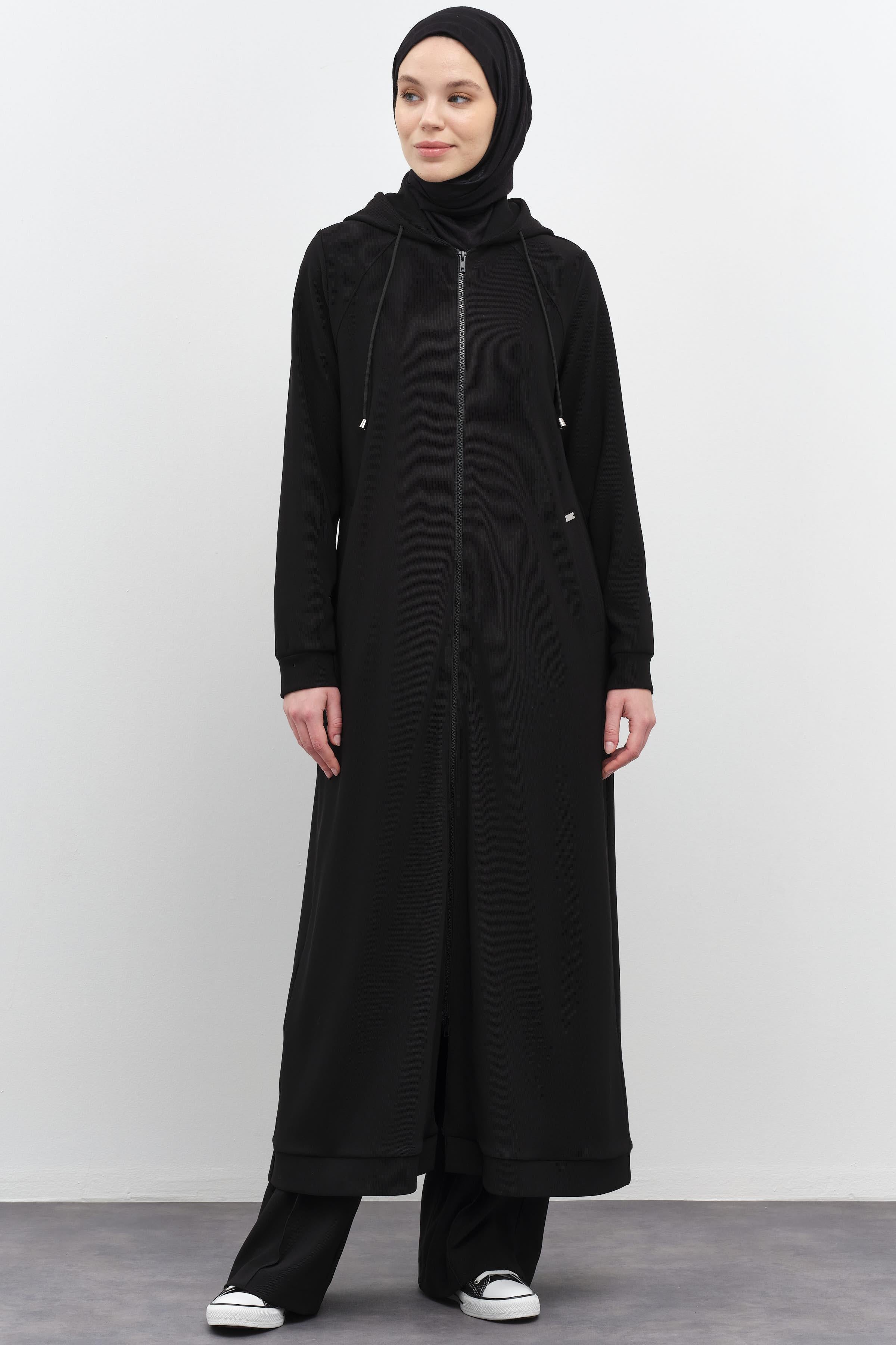 Abaya en tricot à capuche et fermeture éclair - Noir