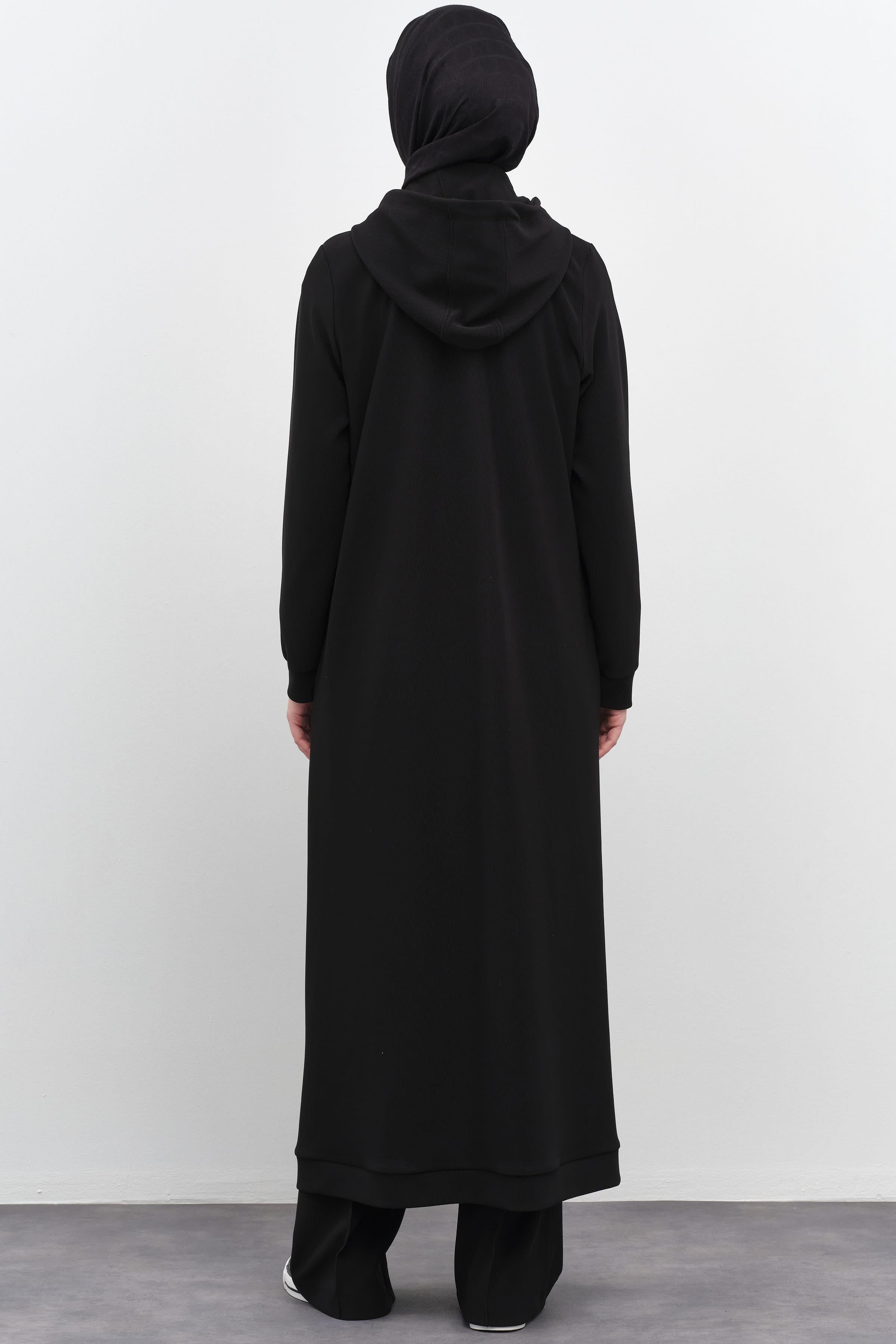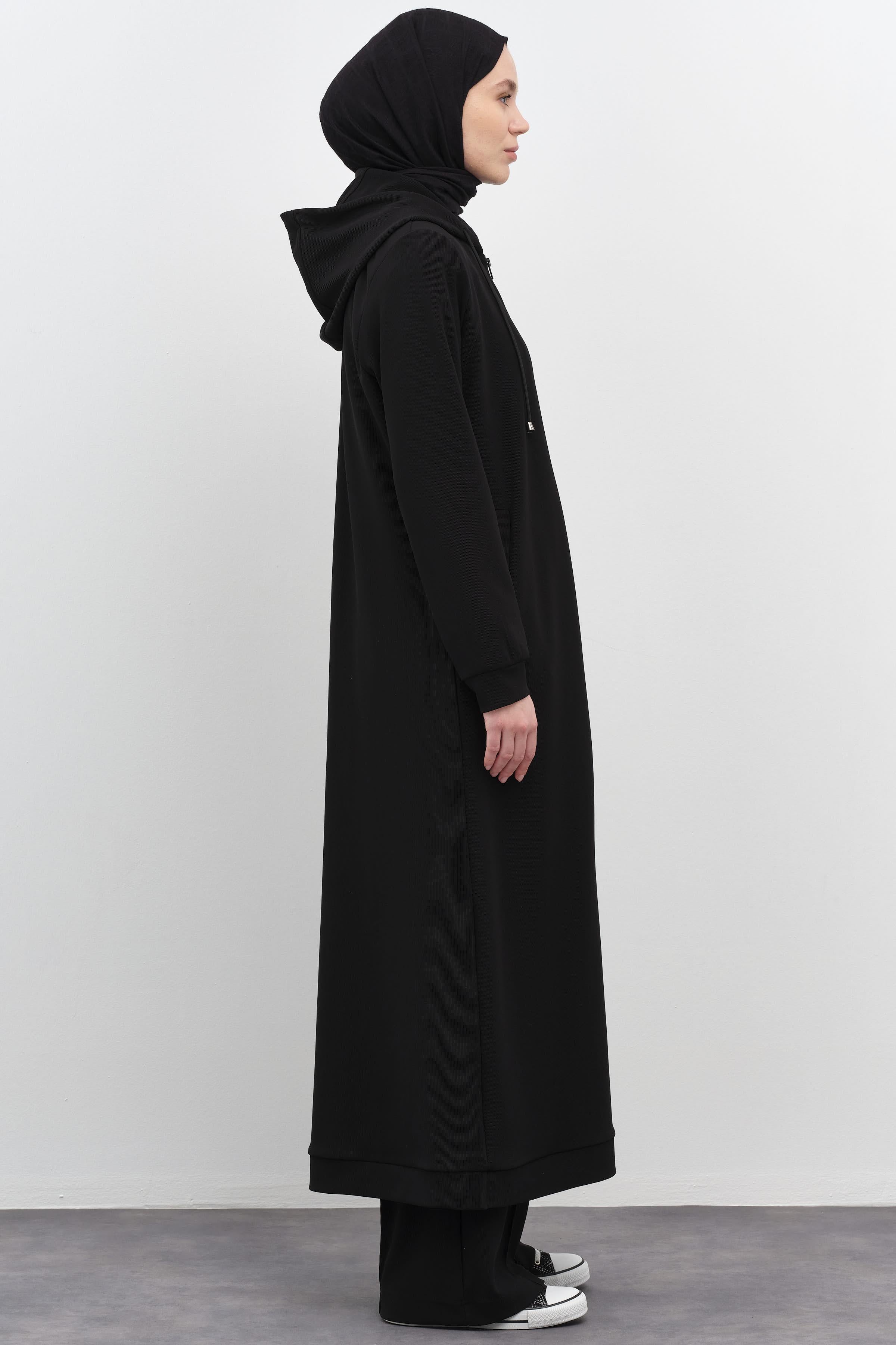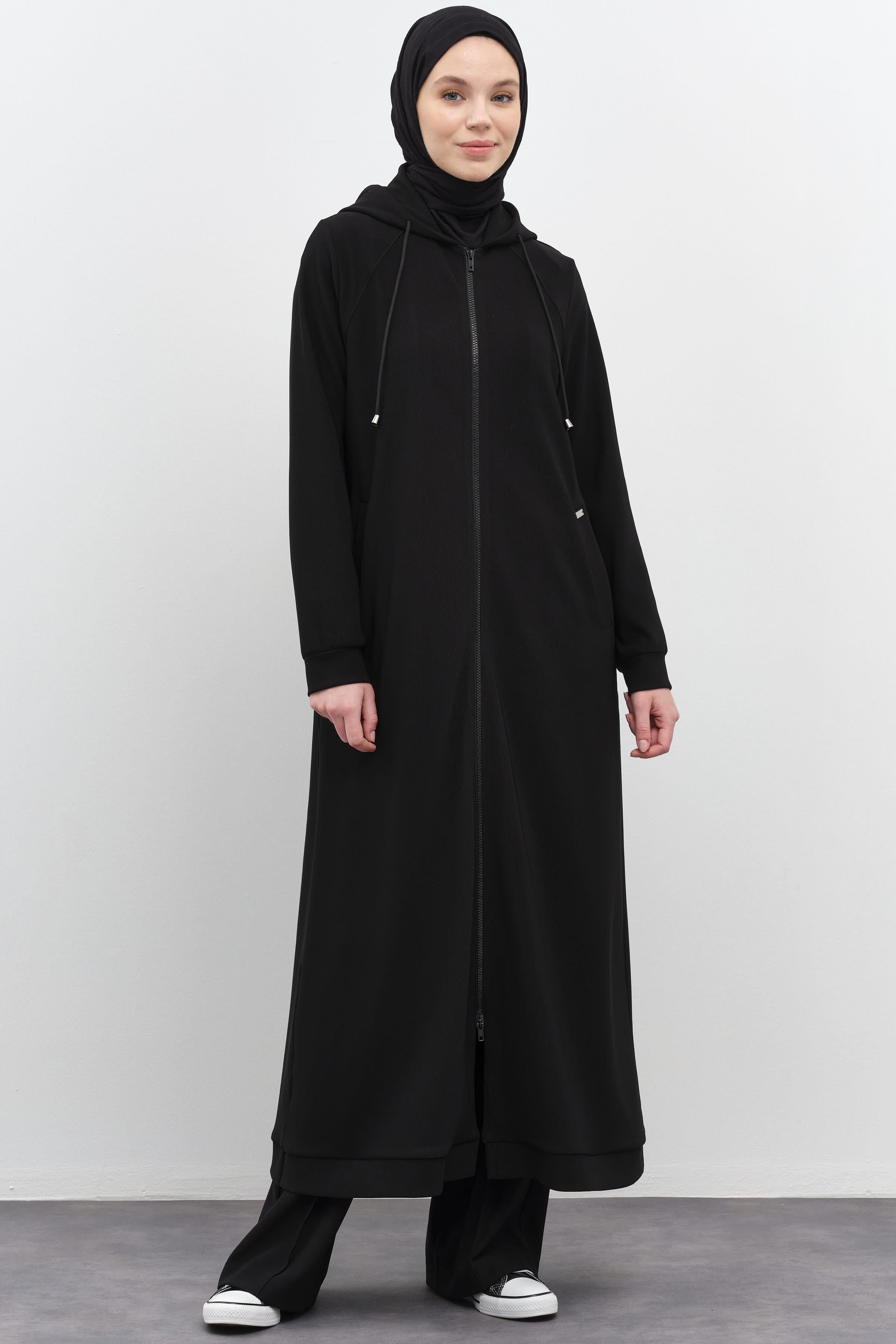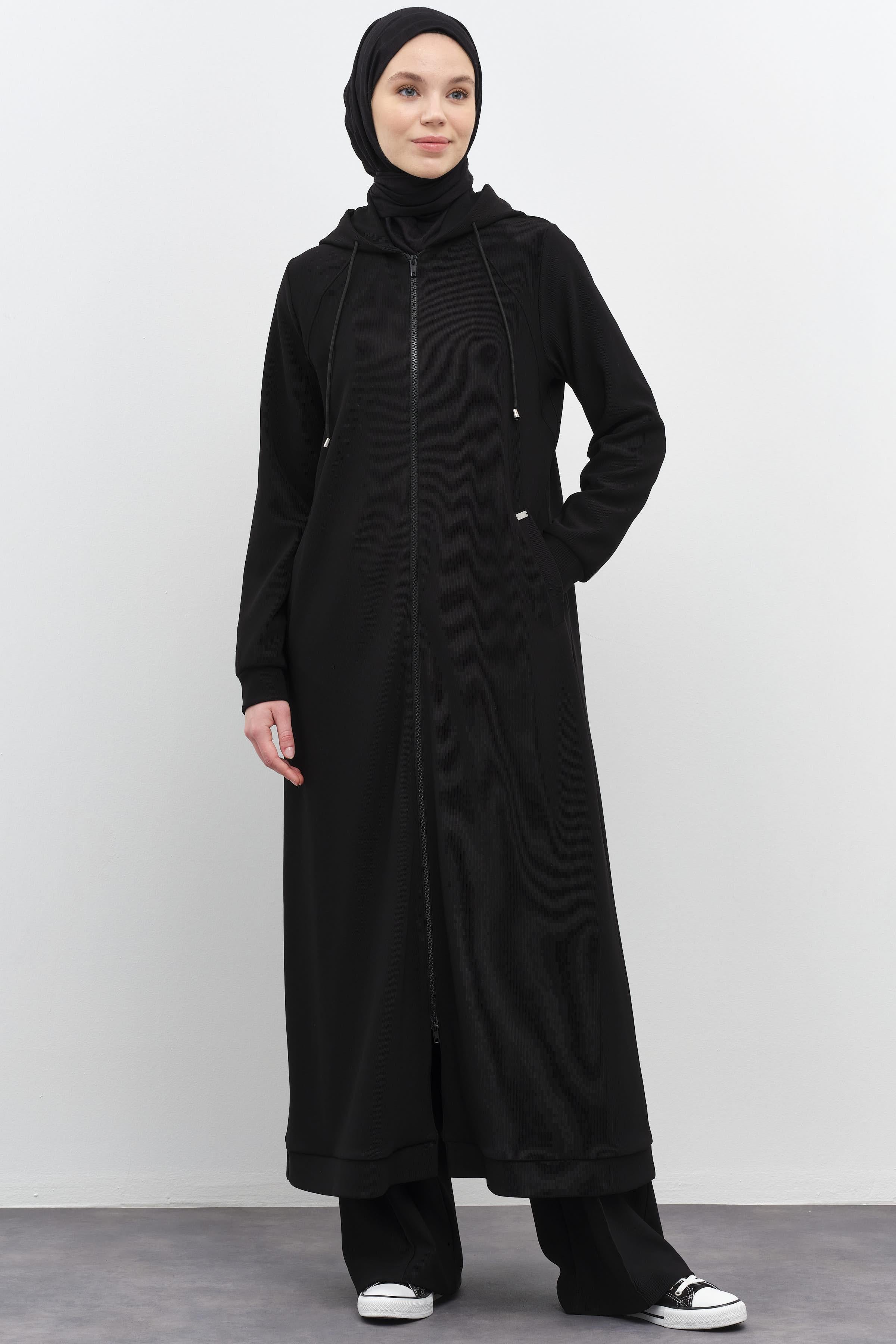 Abaya en tricot à capuche et fermeture éclair - Noir