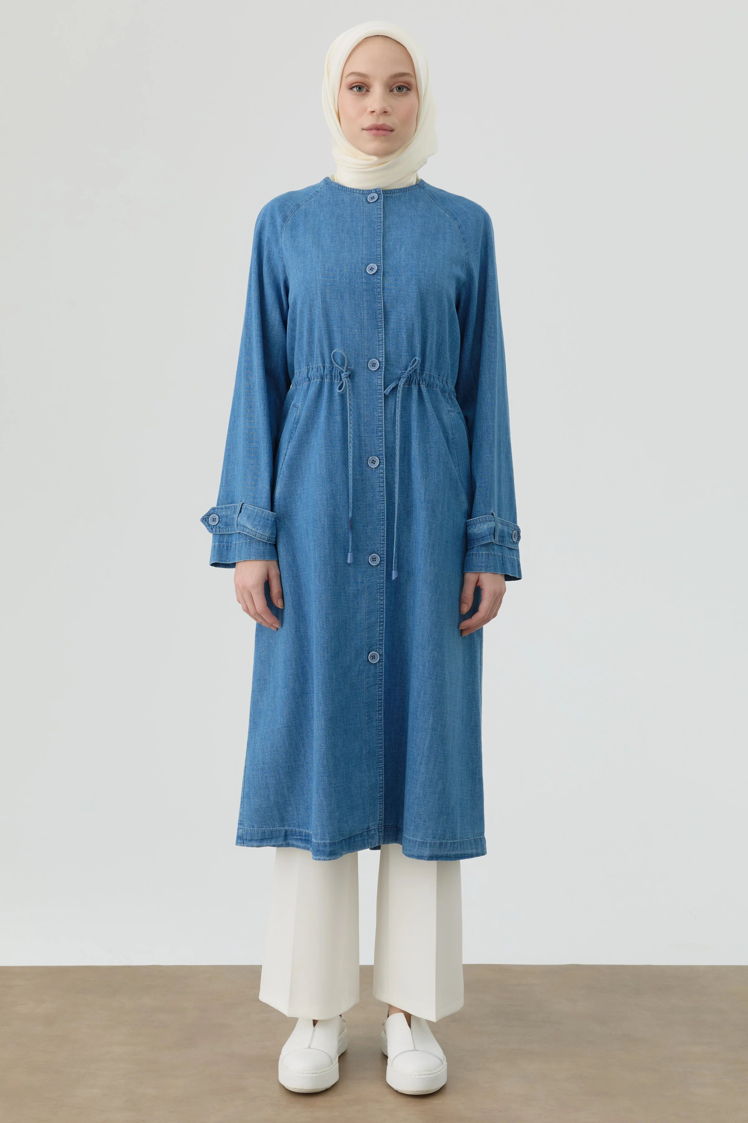 Cap en denim col rond avec lien à la taille - Bleu clair