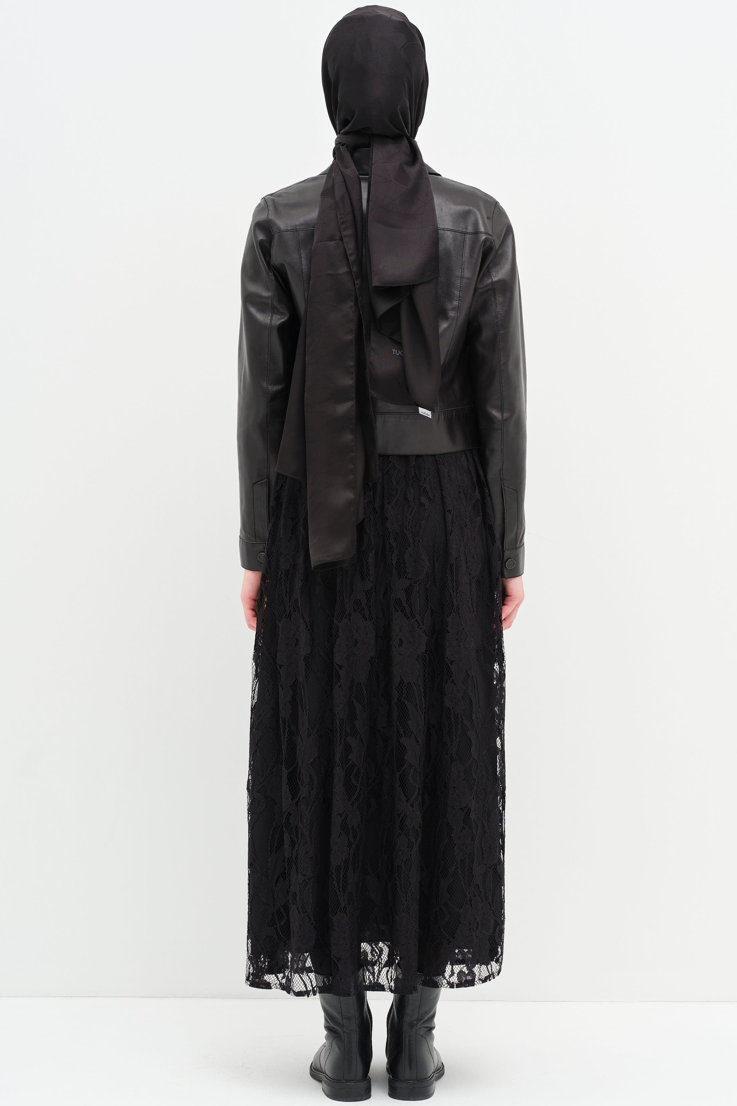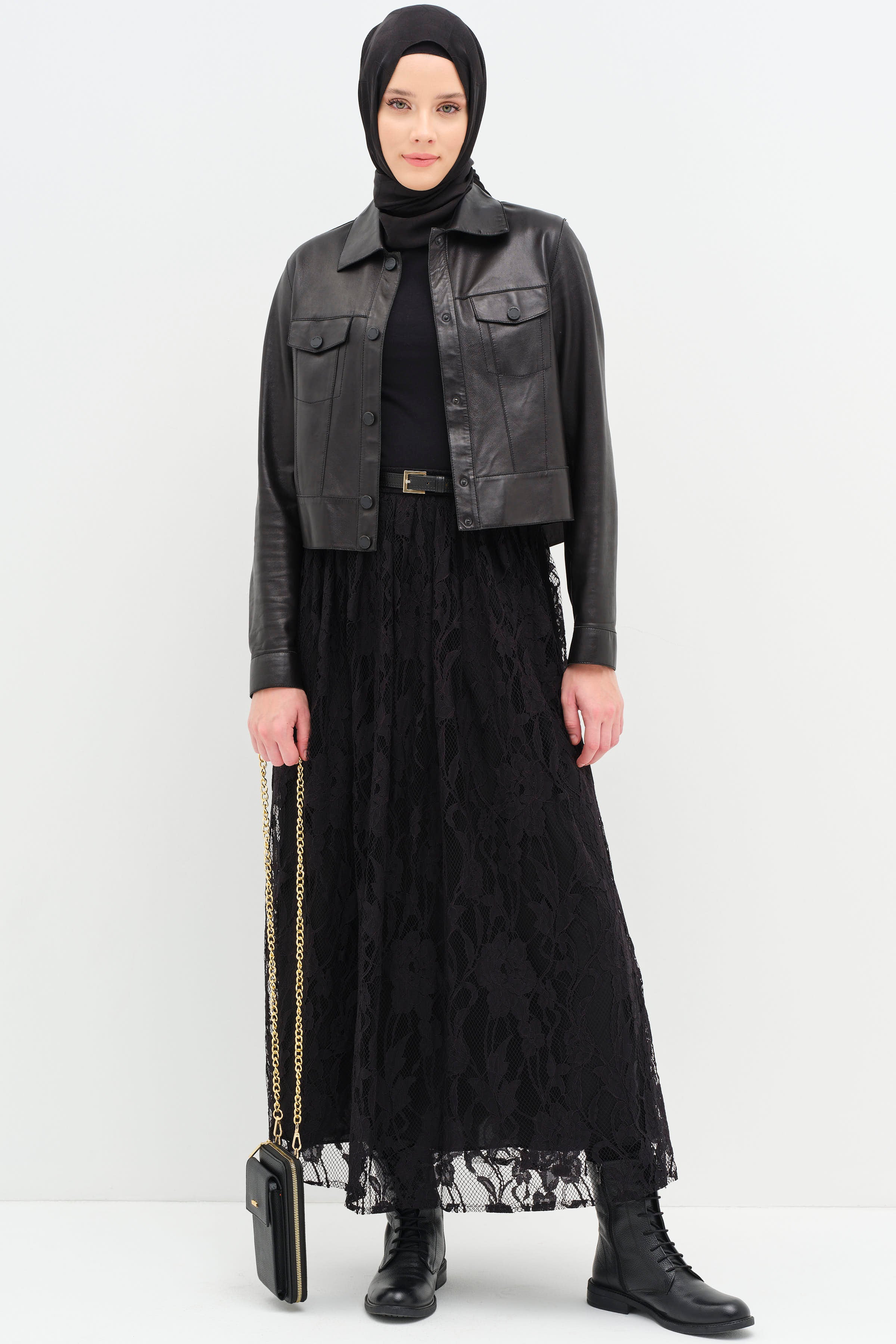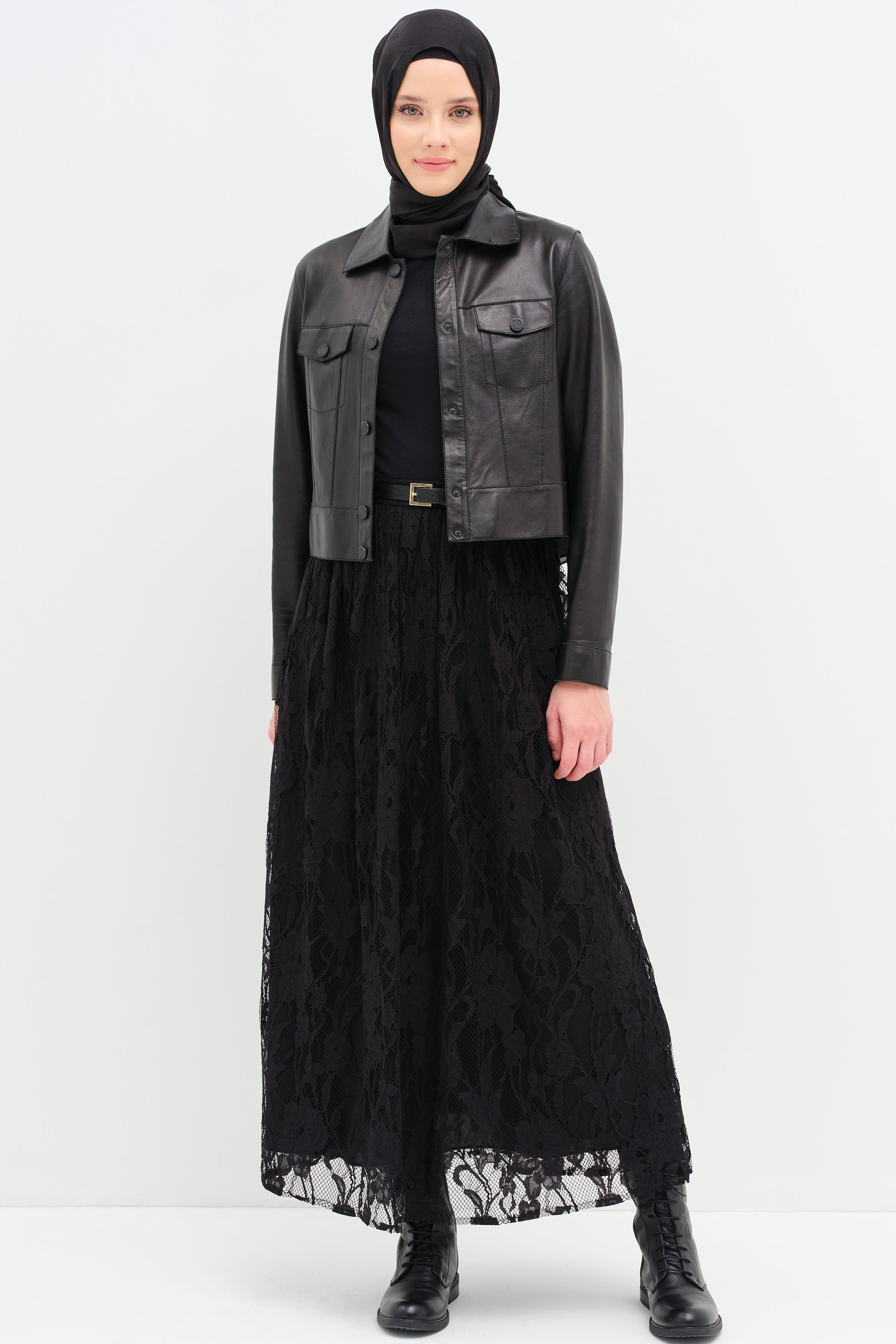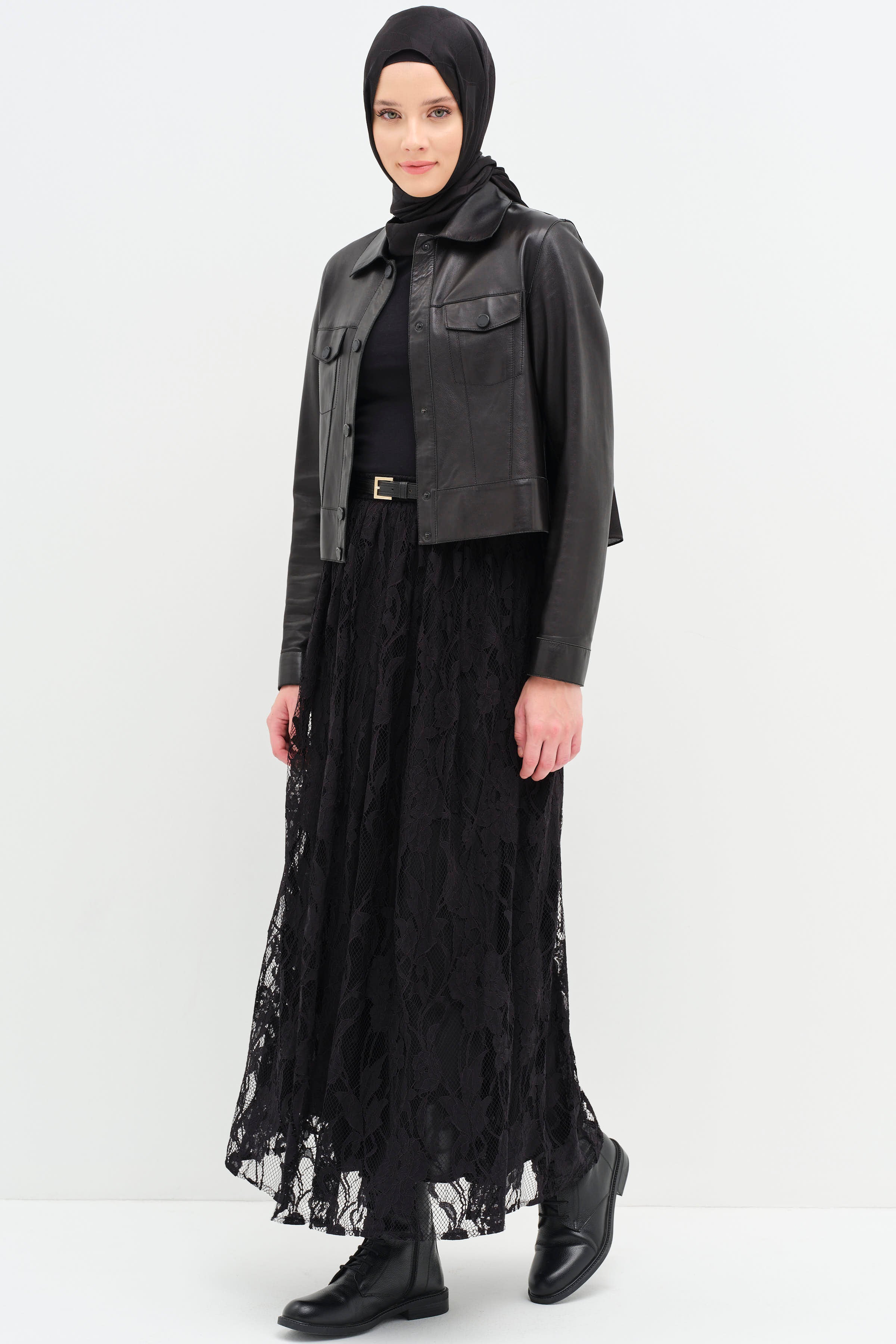 Jupe en dentelle avec ceinture en cuir intégrée - Noir