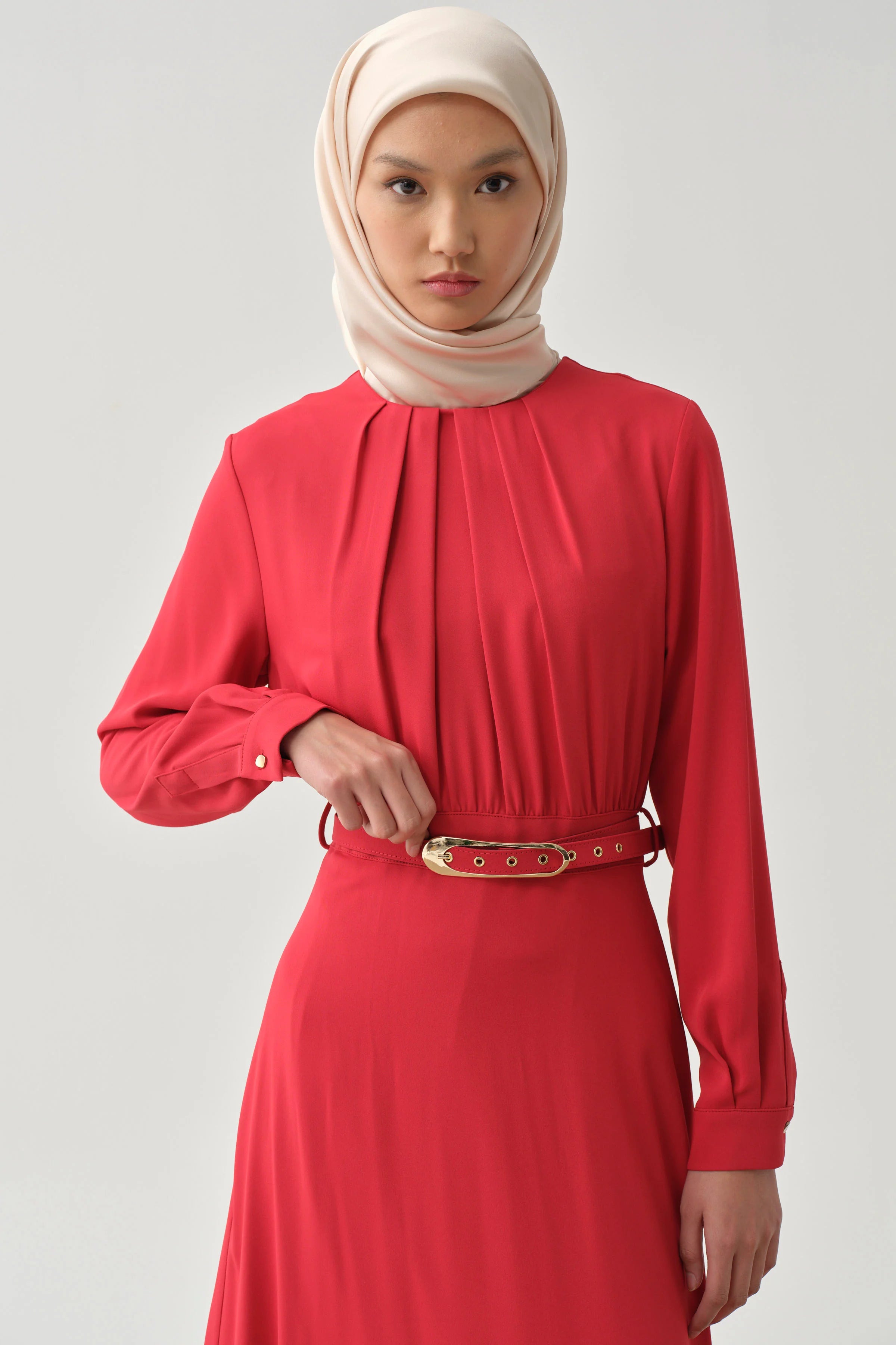 Robe ceinturée avec détail froncé - Rouge