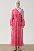 Robe en mousseline à motifs avec ceinture en tricot - Rose