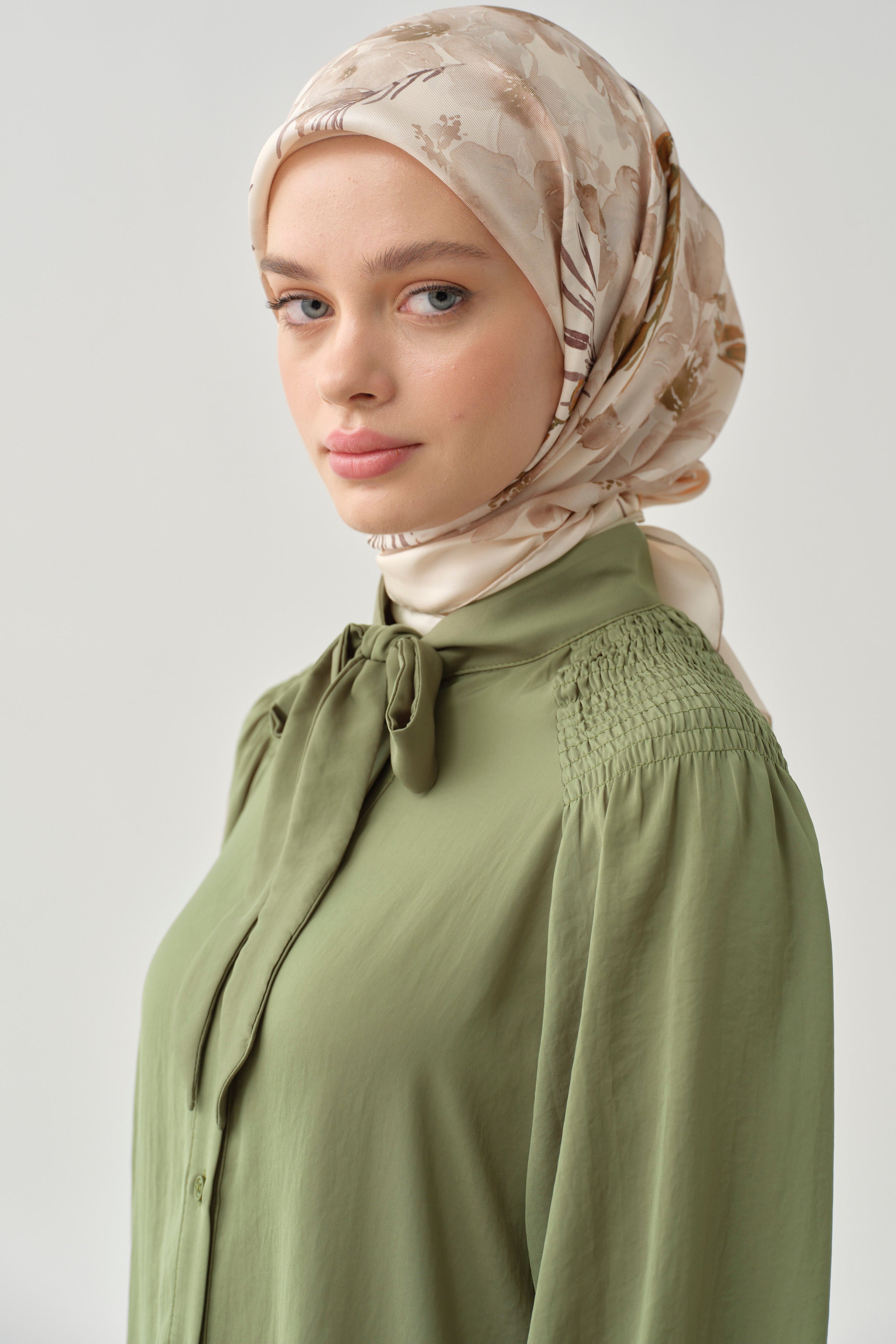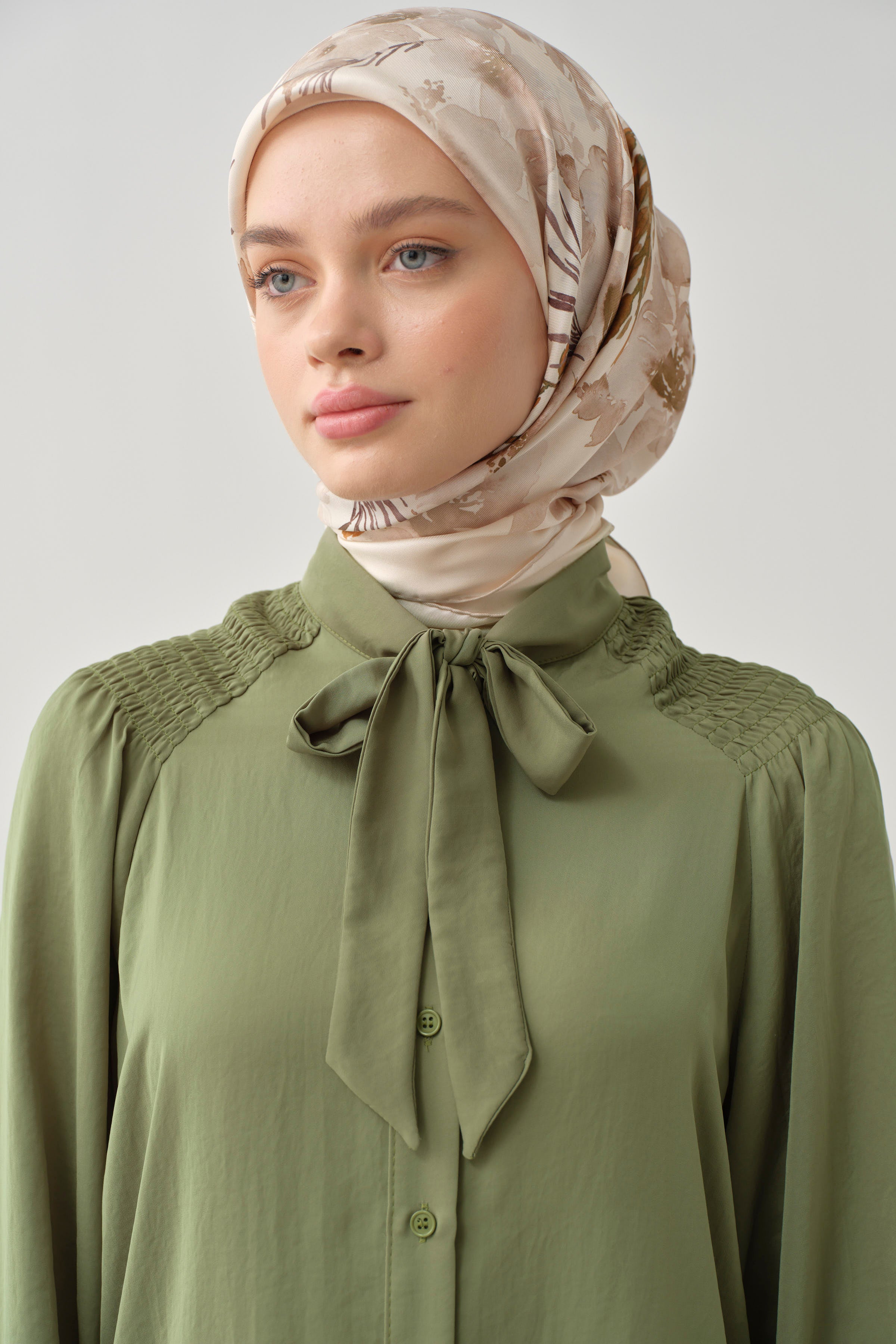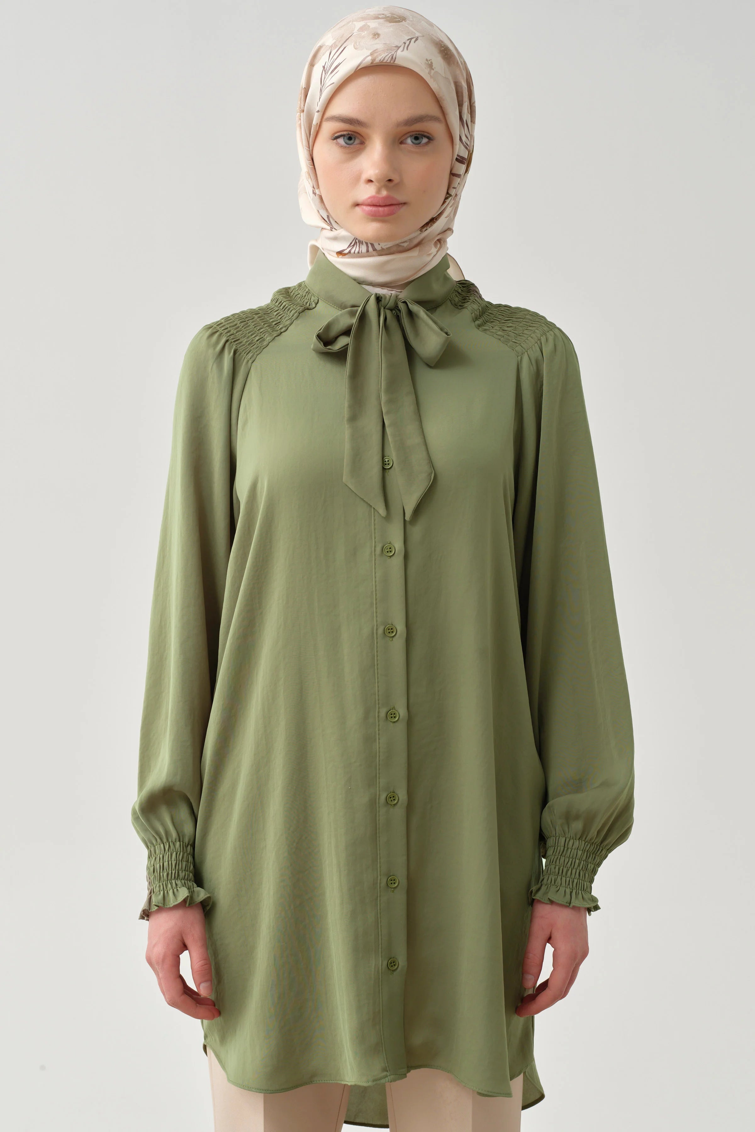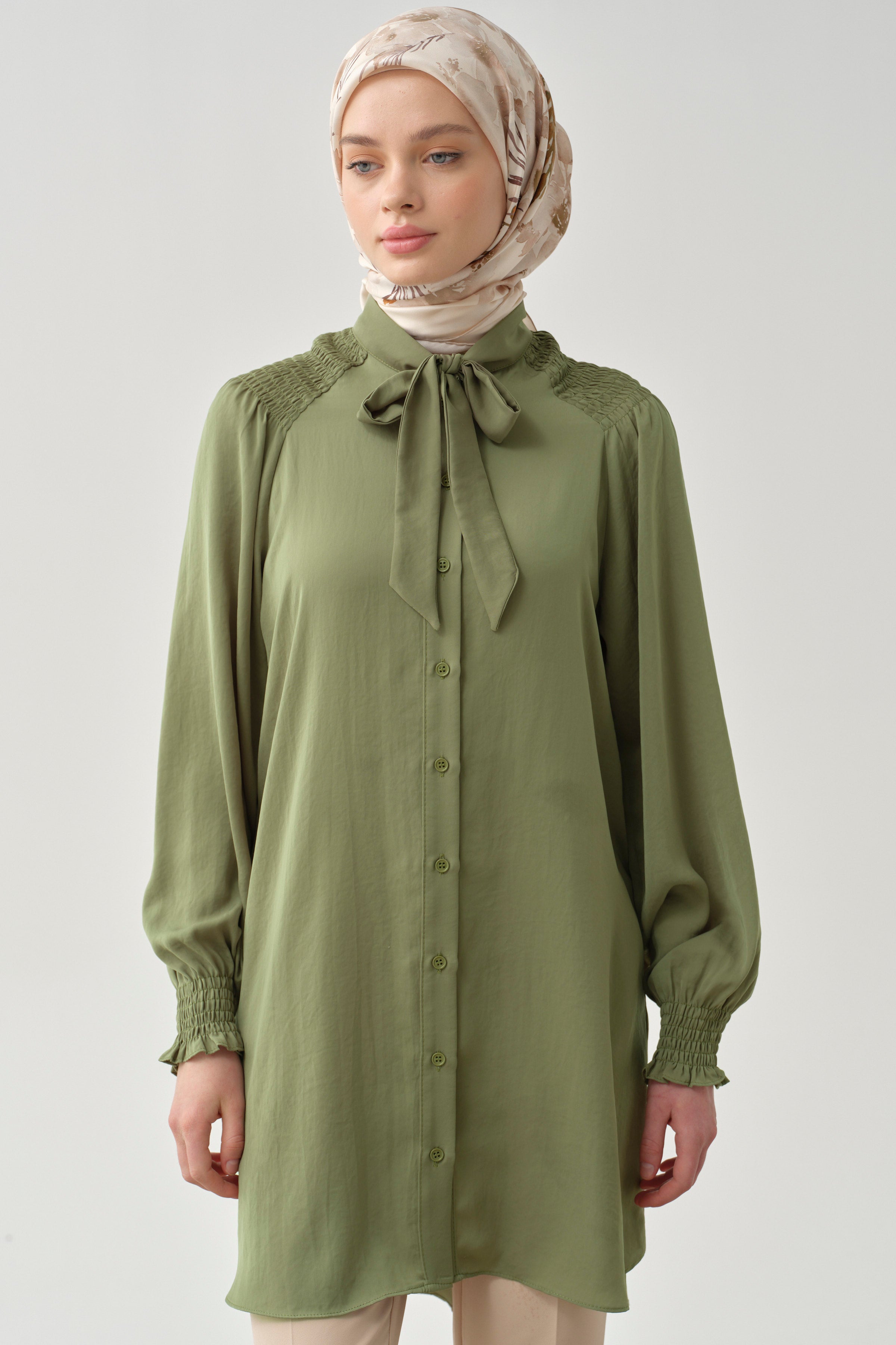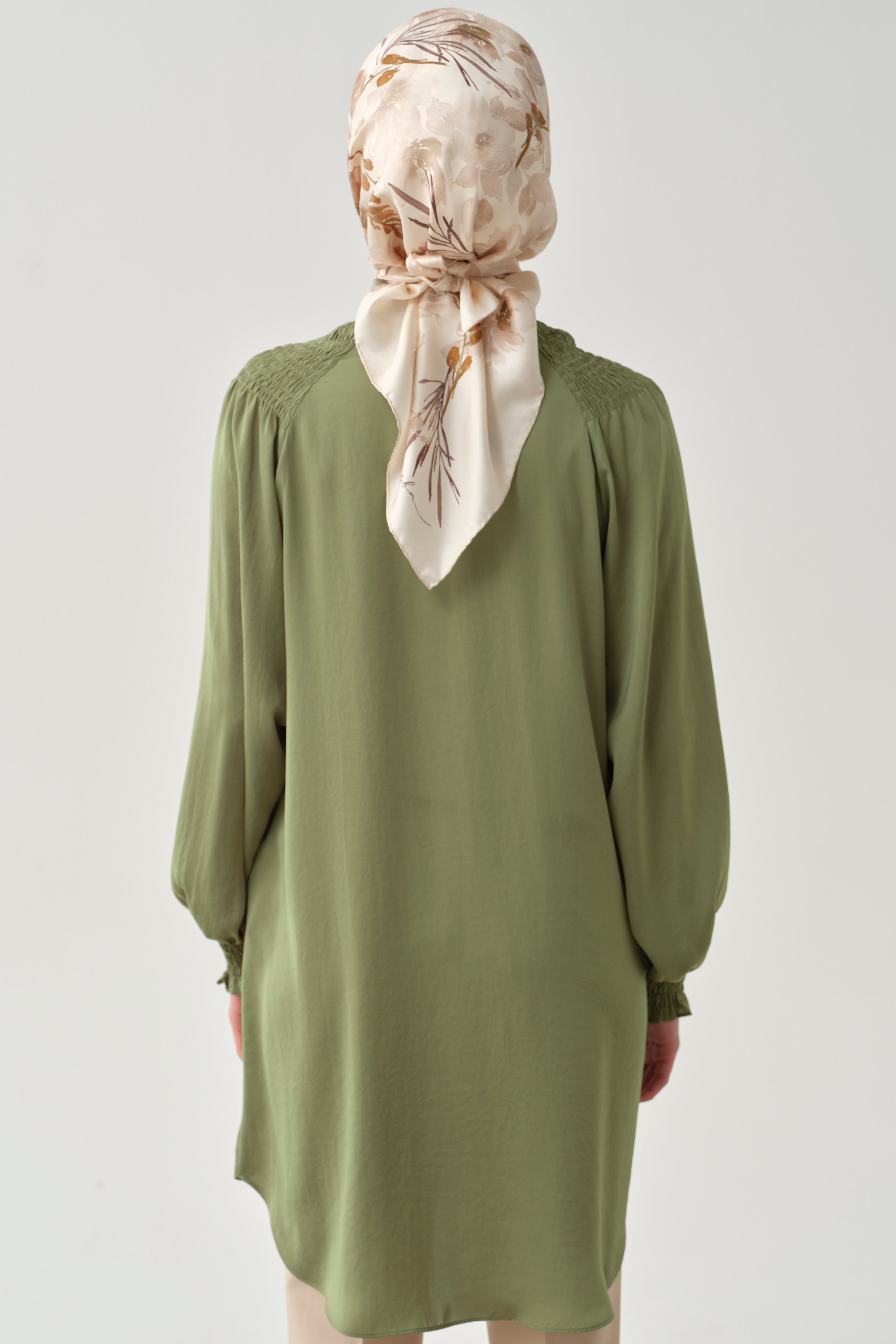 Tunique avec col foulard et détail froncé - Kaki
