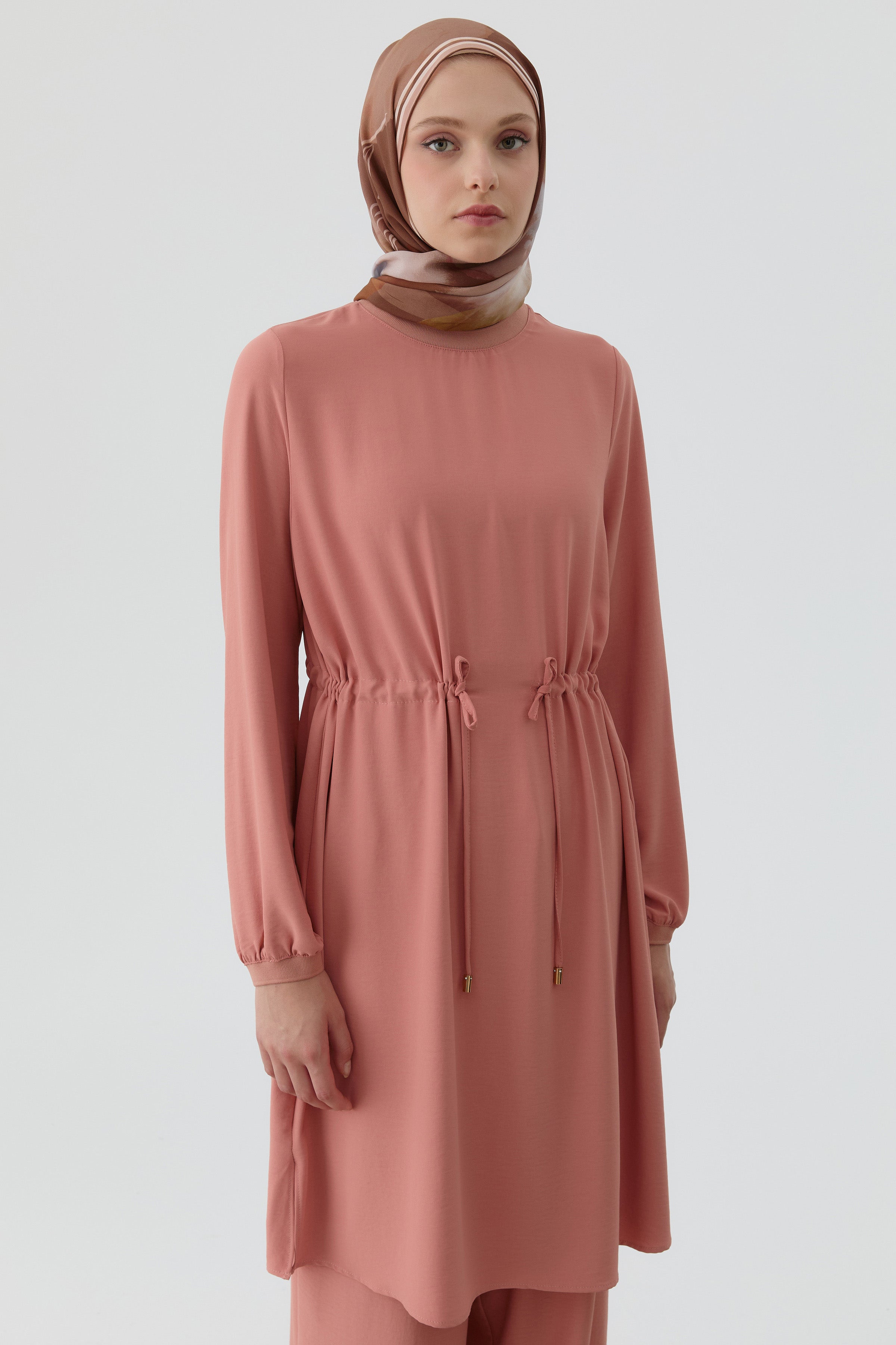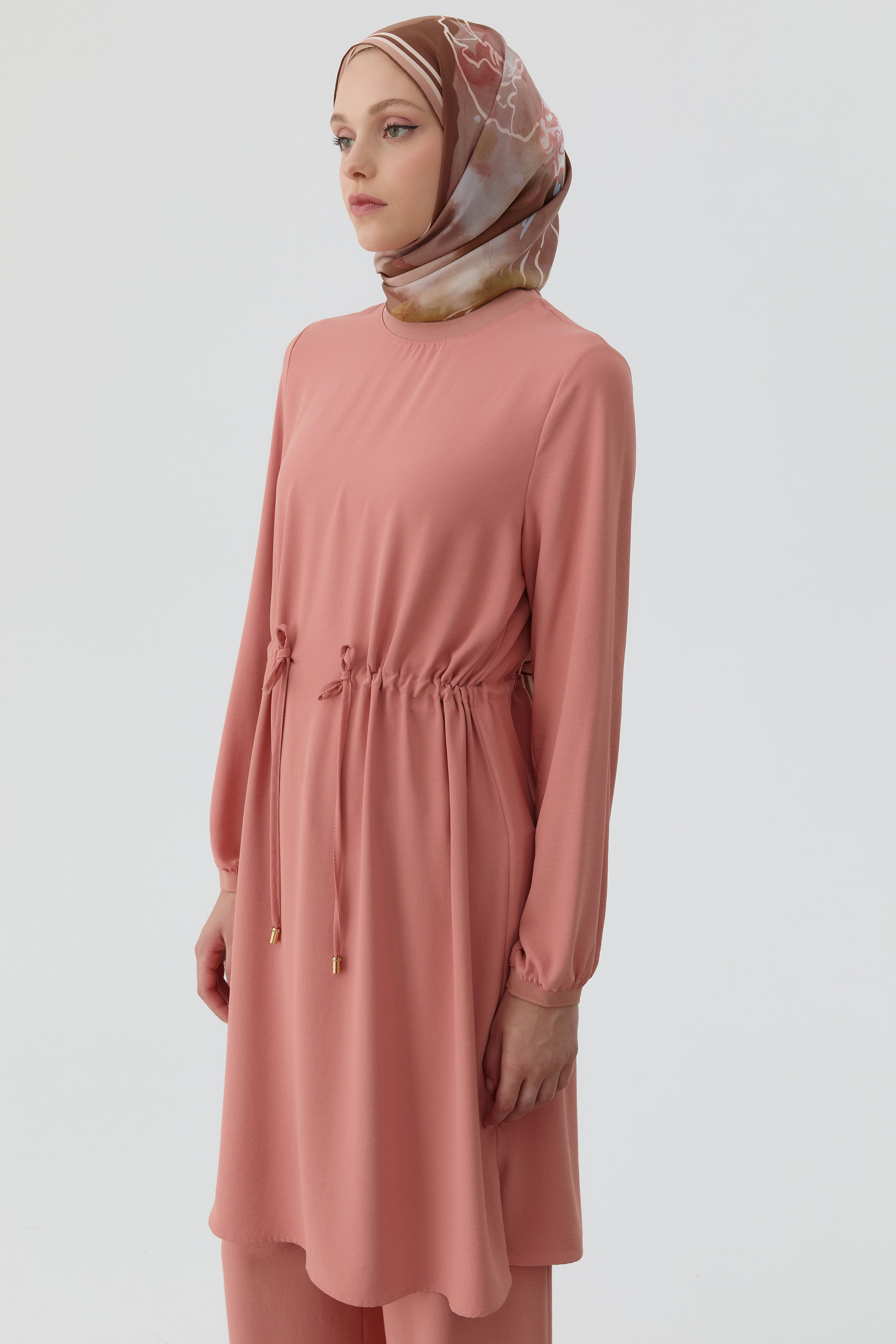Tunique en maille côtelée avec cordon et pierres à la taille - Saumon