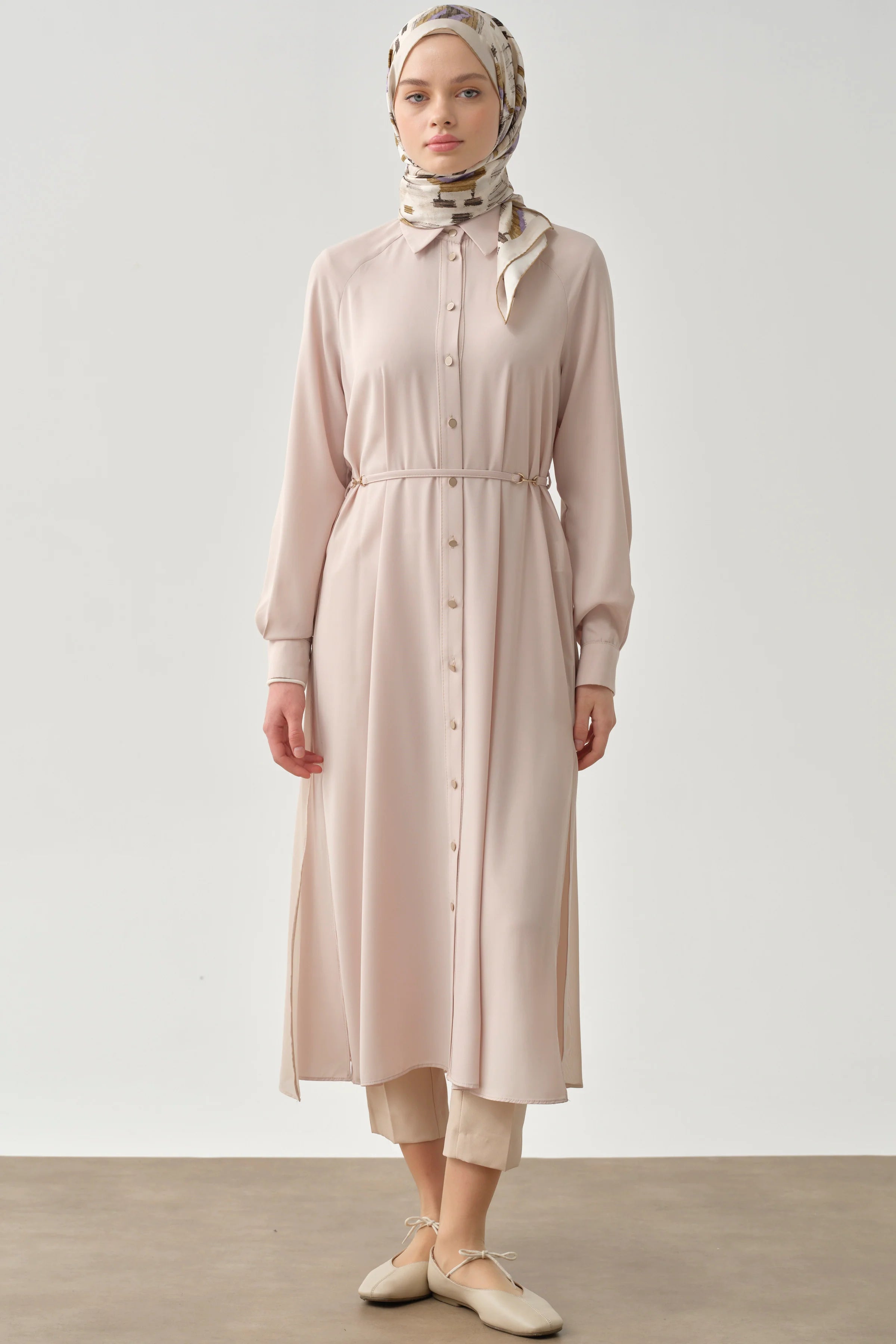Tunique longue en mousseline garnie avec taille ceinturée - Beige