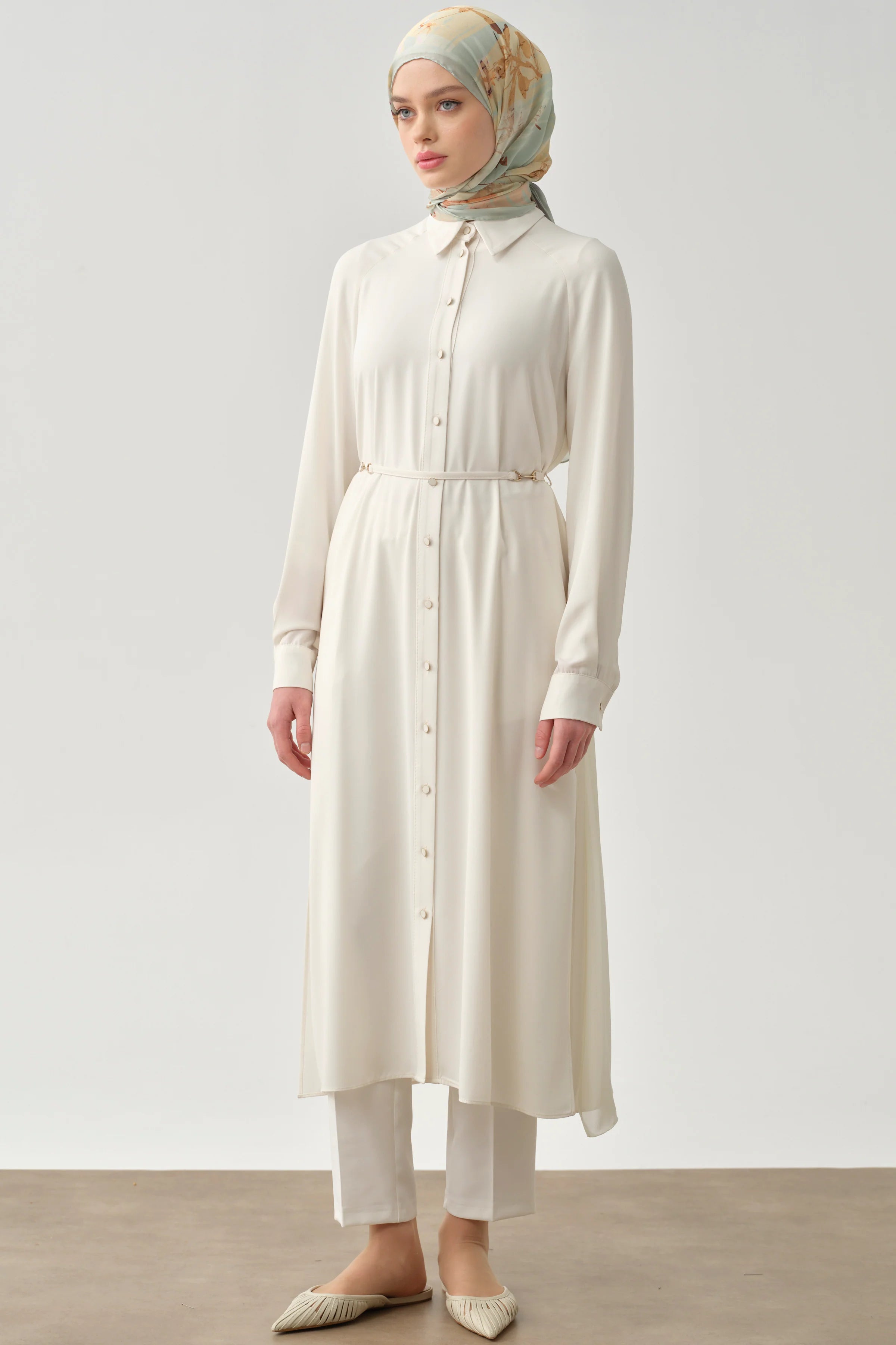 Tunique longue en mousseline garnie avec taille ceinturée - Écru