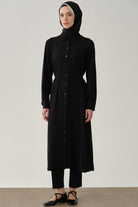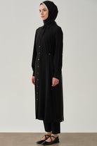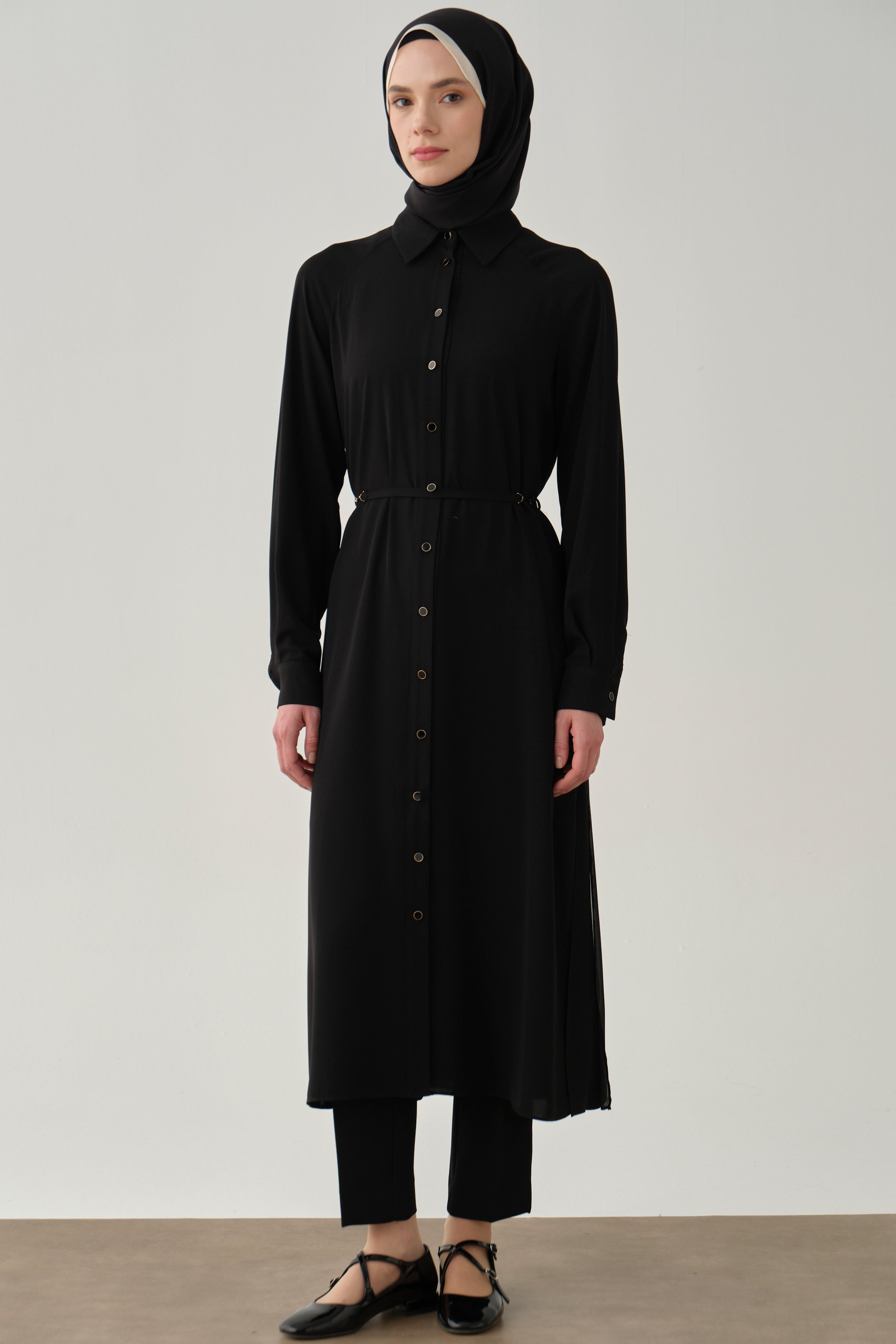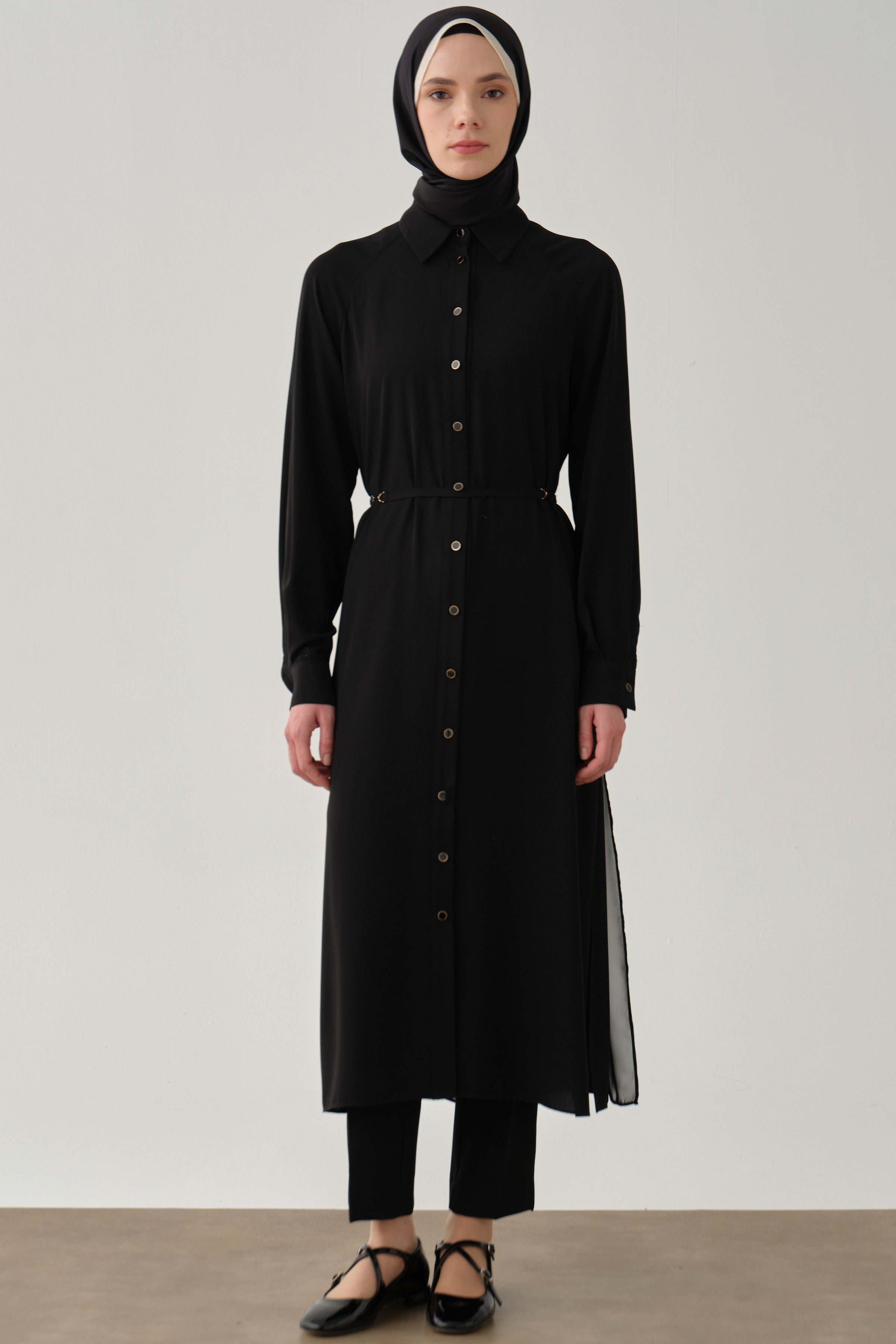 Tunique longue en mousseline garnie avec taille ceinturée - Noir